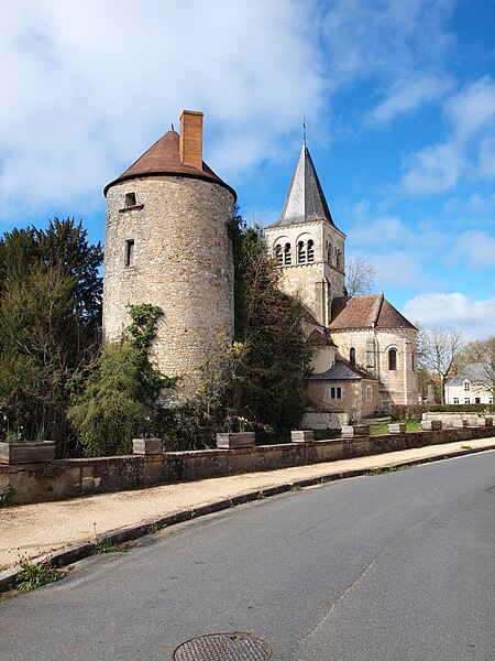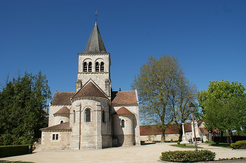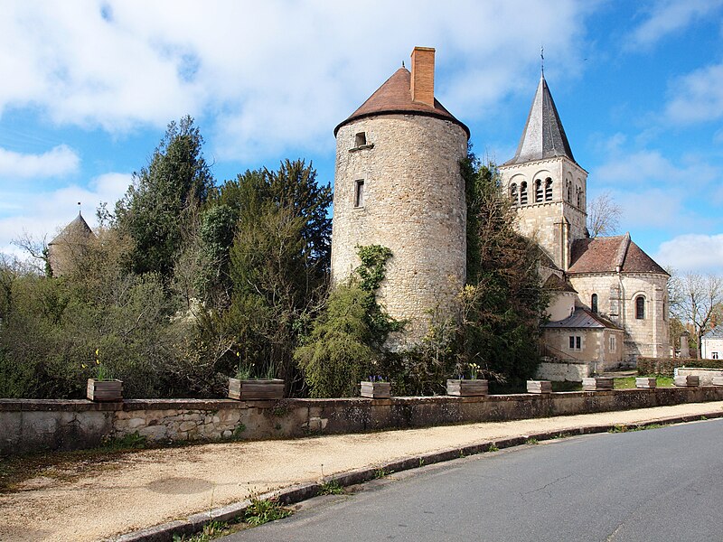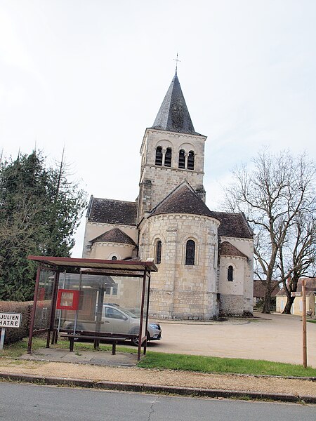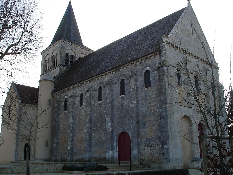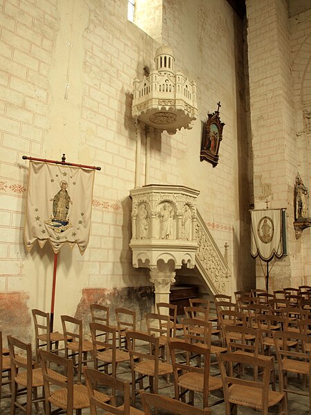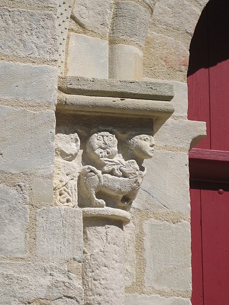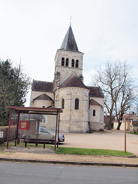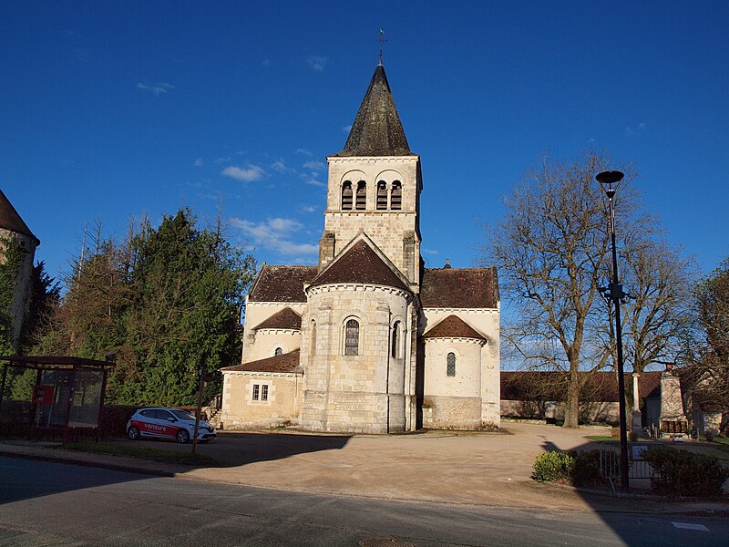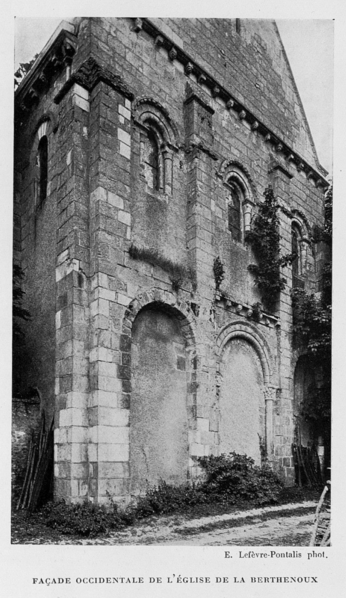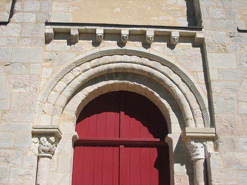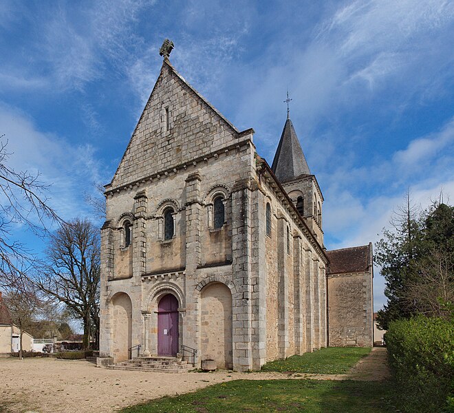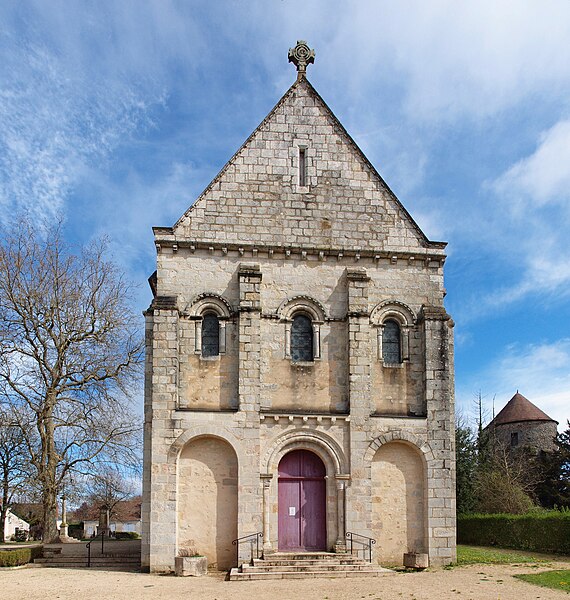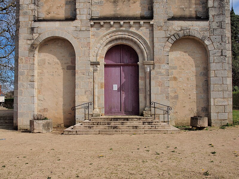 La façade, austère, s'ouvre par un portail en plein cintre composé de deux rouleaux nus reposant sur des colonnes aux chapiteaux ornés d'entrelacs ; un boudin le décore et le chapiteau gauche porte des lions affrontés. Le portail, accompagné de deux niches à fond plat et surmonté d'un étage à trois fenêtres, présente une archivolte ornée de billettes qui se termine par un cordon ceignant les contreforts. Muré en 1854, le portail a été rouvert et la façade réhabilitée lors de travaux achevés en 2010, rendus possibles par l'action de l'association fondée par l'abbé Debourges, puis dirigée par Jacques Hivert.