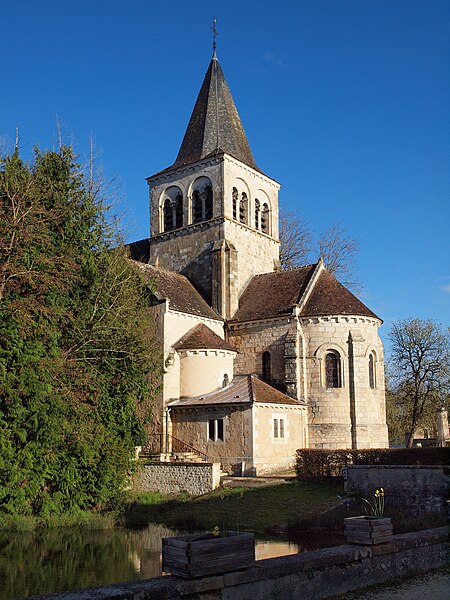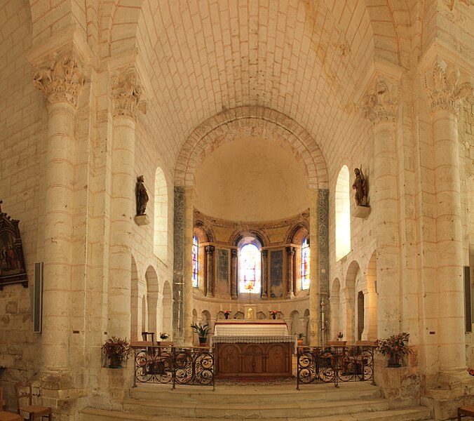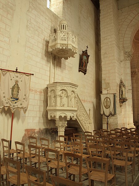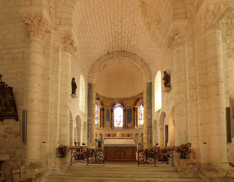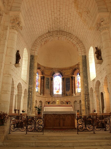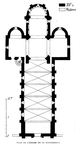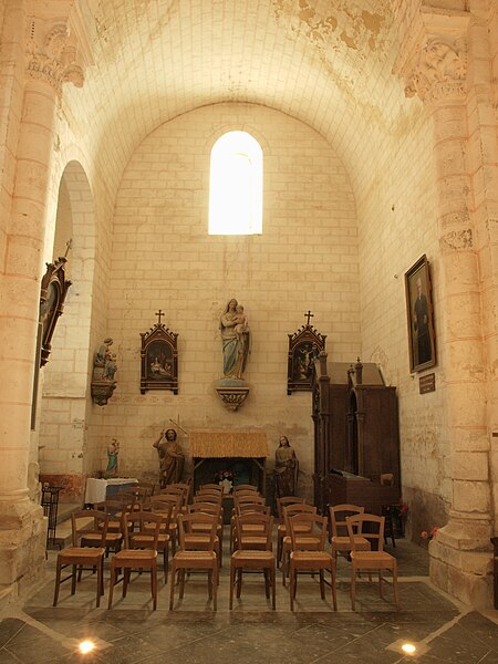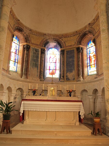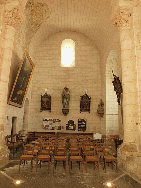 Le plan comprend une nef unique, un transept et un chœur terminé par une abside circulaire, les bras du transept étant ornés de deux absidioles ; un clocher s'élève sur la croisée. La nef, primitivement couverte en charpente, a été restaurée : elle est aujourd'hui couverte d'un berceau de bois qui a succédé aux ogives montées à la fin du XIXe siècle. Le transept, de plan carré, est voûté en arc de cloître à huit pans reposant sur trompes et renforcé par quatre doubleaux qui retombent sur huit colonnes aux chapiteaux sculptés, représentant feuillages et personnages. L'abside est éclairée par trois fenêtres agrémentées de colonnettes aux chapiteaux sculptés ; certaines de ces décorations ont été interprétées comme des représentations des sept péchés capitaux.