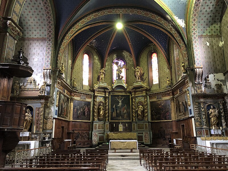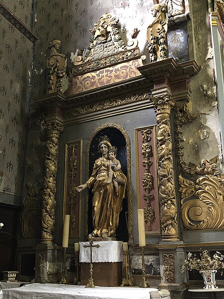 Dans le chœur se trouve un retable monumental dont le tableau central représente la Crucifixion ; il est encadré par les statues de saint Pierre à gauche et de saint Paul à droite. Au sommet du retable figurent trois statues : saint Michel archange au centre, la Vierge à gauche et saint Gabriel archange à droite, ces deux dernières formant l'Annonciation. Quatre autres tableaux, disposés de gauche à droite dans le chœur, représentent l'Adoration des bergers, la Présentation de Jésus au temple, l'Assomption de Marie et, vraisemblablement, le procès de Jésus. La nef et le chœur comportent, à gauche, la chaire et la chapelle de la Vierge qui abrite un retable avec la Vierge à l'Enfant, et, à droite, la chapelle Saint‑Joseph.