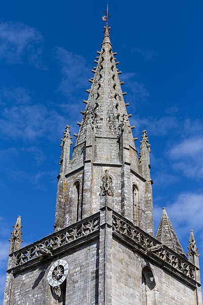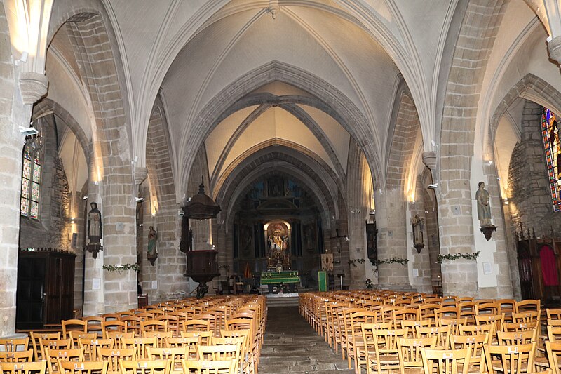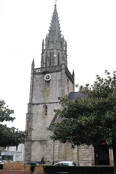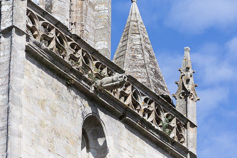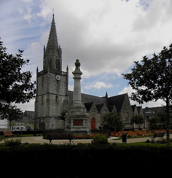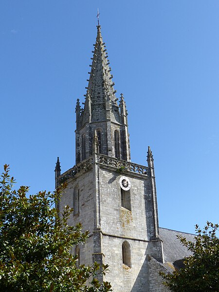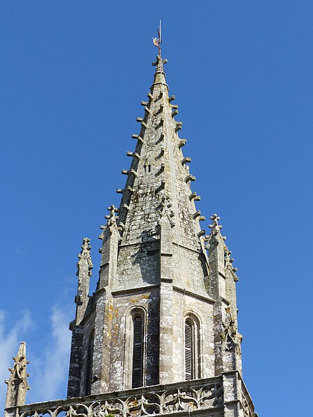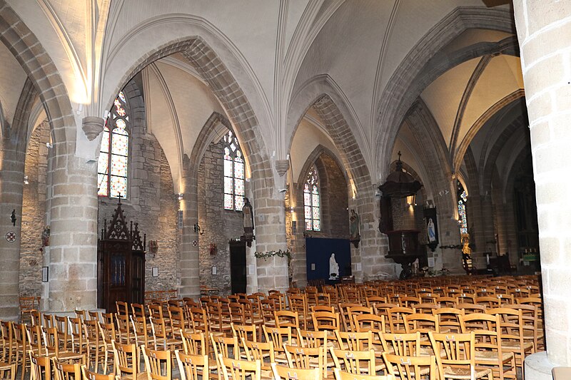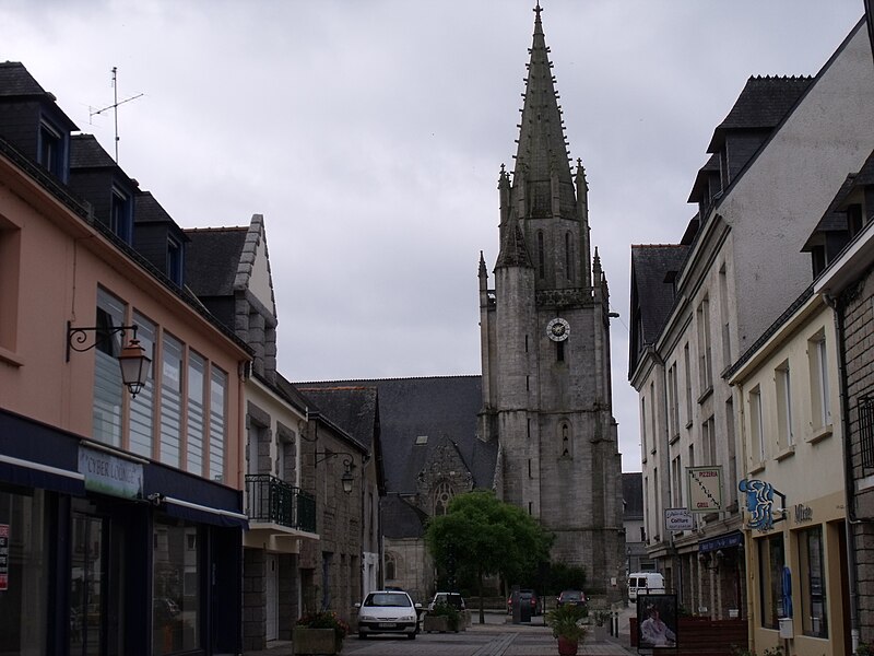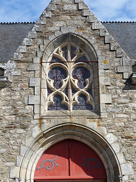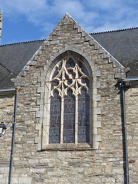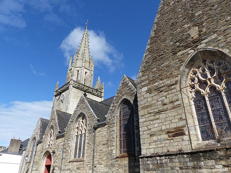 L'architecture utilise abondamment les granites locaux de Pontivy, tant à faciès grossier qu'à faciès fin très blanc, ainsi que des schistes et grès briovériens gris‑vert. Les remaniements successifs ont modifié le plan primitif en croix latine, mais l'élévation conserve des indices de l'ancien croisillon sur la façade méridionale. Les fenêtres en arc brisé ont été restaurées au XIXe siècle et sont surmontées de pignons décorés de crosses et de choux. Le portail occidental se compose de deux baies jumelles en anse de panier, encadrées de trois colonnettes et soulignées par une double voussure sculptée de feuillages de vigne et de chêne, le tout surmonté d'accolades fleuronnées ; au‑dessus des chapiteaux apparaissent des pinacles légers ornés de losanges ajourés qui reprennent les macles de la maison de Rohan. La tour s'élève en étages percés de longues fenêtres et se termine par une galerie flamboyante chargée de gargouilles et de pinacles ; un tambour octogonal flanqué de clochetons porte la flèche de pierre qui a remplacé une charpente d'ardoises en 1886. La nef, à trois vaisseaux et quatre travées, communique avec les bas‑côtés par des arcades brisées à multiples archivoltes qui s'appuient sur des piliers carrés engagés, en granite à gros grain.