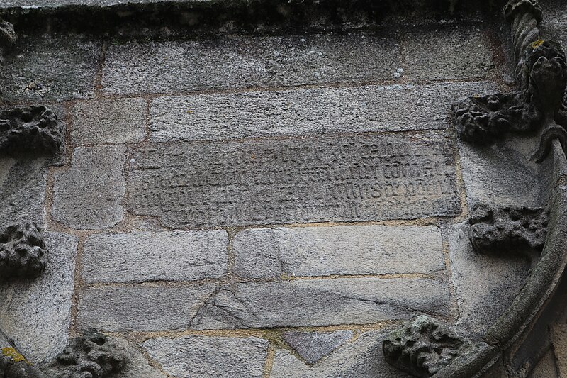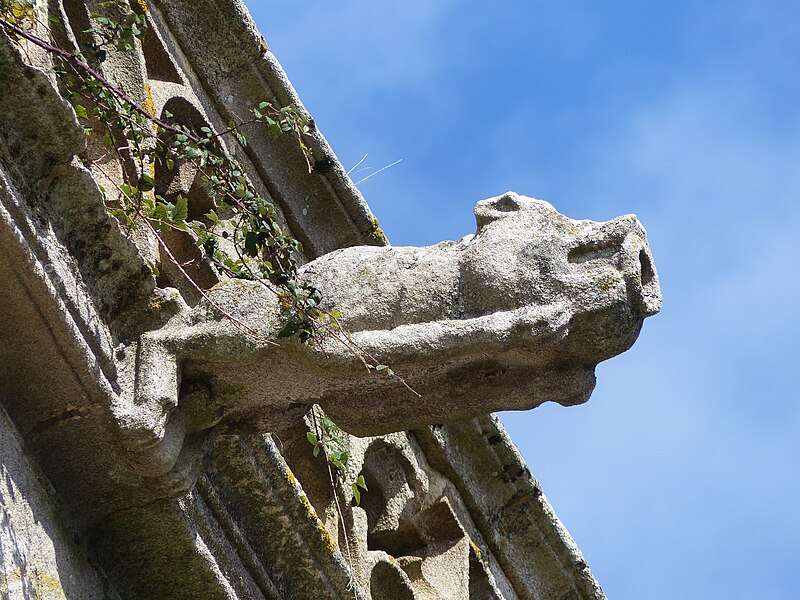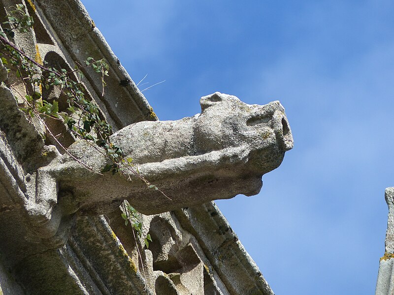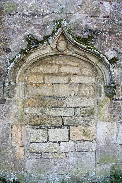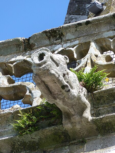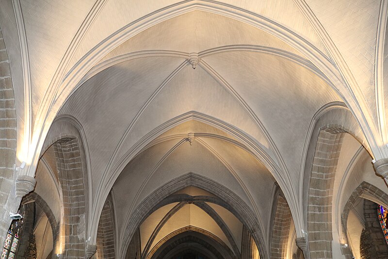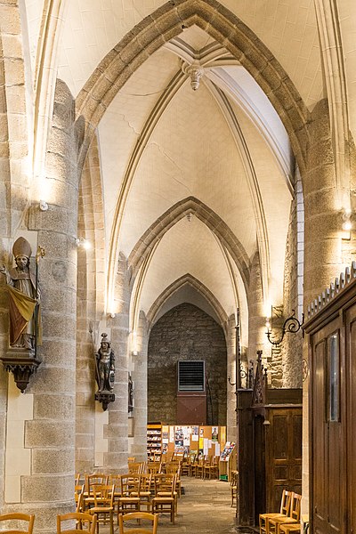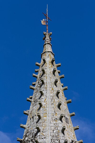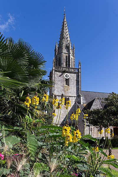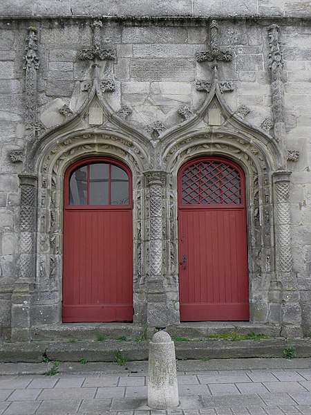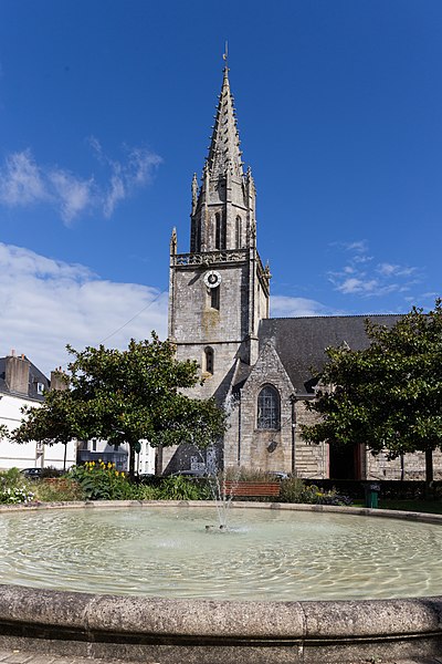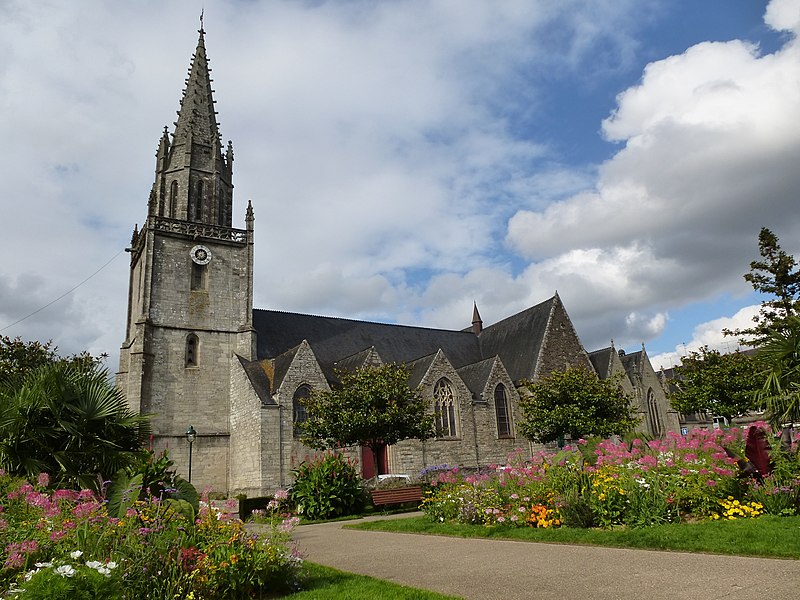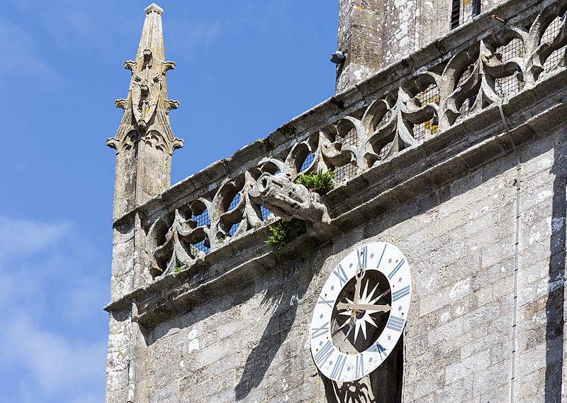 L'architecture utilise abondamment les granites locaux de Pontivy, tant à faciès grossier qu'à faciès fin très blanc, ainsi que des schistes et grès briovériens gris‑vert. Les remaniements successifs ont modifié le plan primitif en croix latine, mais l'élévation conserve des indices de l'ancien croisillon sur la façade méridionale. Les fenêtres en arc brisé ont été restaurées au XIXe siècle et sont surmontées de pignons décorés de crosses et de choux. Le portail occidental se compose de deux baies jumelles en anse de panier, encadrées de trois colonnettes et soulignées par une double voussure sculptée de feuillages de vigne et de chêne, le tout surmonté d'accolades fleuronnées ; au‑dessus des chapiteaux apparaissent des pinacles légers ornés de losanges ajourés qui reprennent les macles de la maison de Rohan. La tour s'élève en étages percés de longues fenêtres et se termine par une galerie flamboyante chargée de gargouilles et de pinacles ; un tambour octogonal flanqué de clochetons porte la flèche de pierre qui a remplacé une charpente d'ardoises en 1886. La nef, à trois vaisseaux et quatre travées, communique avec les bas‑côtés par des arcades brisées à multiples archivoltes qui s'appuient sur des piliers carrés engagés, en granite à gros grain.