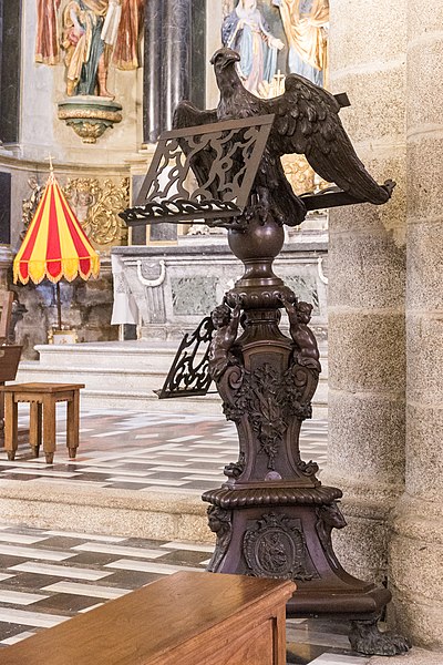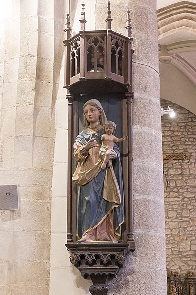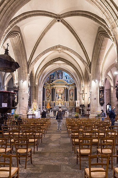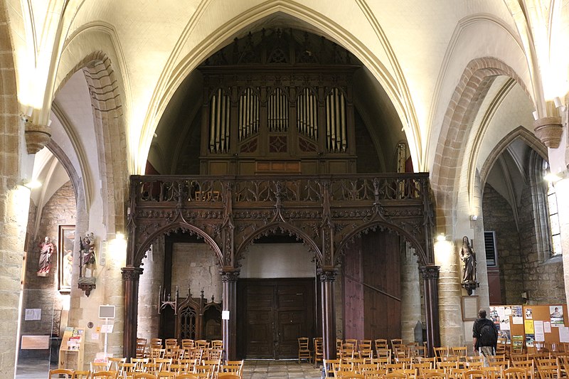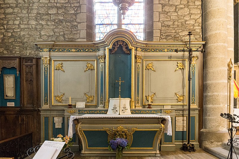 Le mobilier est riche et partiellement protégé. Le maître‑autel, en marbre gris poli et pierre polychrome, a été exécuté à Rennes en 1782 ; son retable architecturé en marbre et tuffeau, daté de 1725 et de style Louis XV, présente un plan concave avec un corps central abritant une grande niche en anse de panier qui contient un groupe en terre cuite représentant la Sainte Famille. Le retable associe colonnes de marbre noir, entablement sculpté de rinceaux, un fronton semi‑circulaire et une niche de couronnement où figure saint Ivy, entouré d'anges musiciens ; les ailes incurvées abritent les statues de saint Joachim et sainte Anne, et des médaillons semblent évoquer les donateurs, le duc et la duchesse de Rohan. Le devant du maître‑autel porte le nom de Jéhovah en caractères hébraïques et des motifs solaires ; le tabernacle, en marbre, est muni d'une porte ouvragée en mosaïque d'or et d'émail. C'est sur cet autel que les Fédérés signèrent leur acte d'union le 19 janvier 1790, lors duquel l'expression « Vivre libre ou mourir » fut employée pour la première fois. L'église conserve également une série de statues des XVIe, XVIIe et XVIIIe siècles, probablement issues de l'ancien couvent des Récollets, ainsi qu'un aigle‑lutrin en bois du XVIIe siècle offert par le duc de Rohan. Une huile sur toile de la Descente de Croix, attribuée à l'école flamande et datée de 1635, a été restaurée en 1974. La chapelle nord, dédiée à Notre‑Dame‑de‑Joie, abrite le retable et la statue vénérée de la Vierge, tandis que le retable du calvaire, en bois sculpté, est représentatif du XVIIe siècle et la lampe perpétuelle y est suspendue à la voûte. Du XIXe siècle datent des vitraux réalisés par Ernest‑Victor Laumonnier et un orgue Cavaillé‑Coll de 1836 ; d'autres verrières ont été ajoutées au XXe siècle.