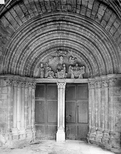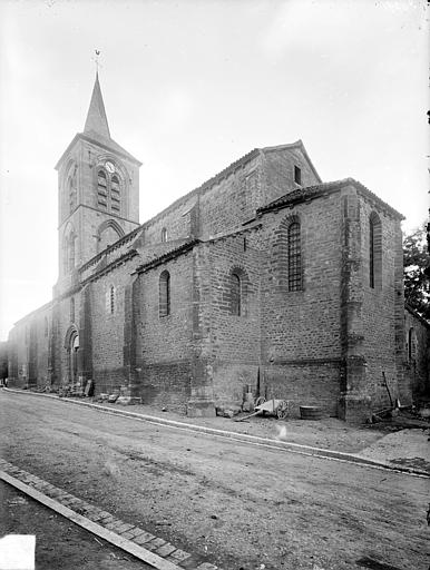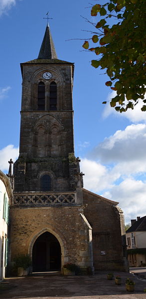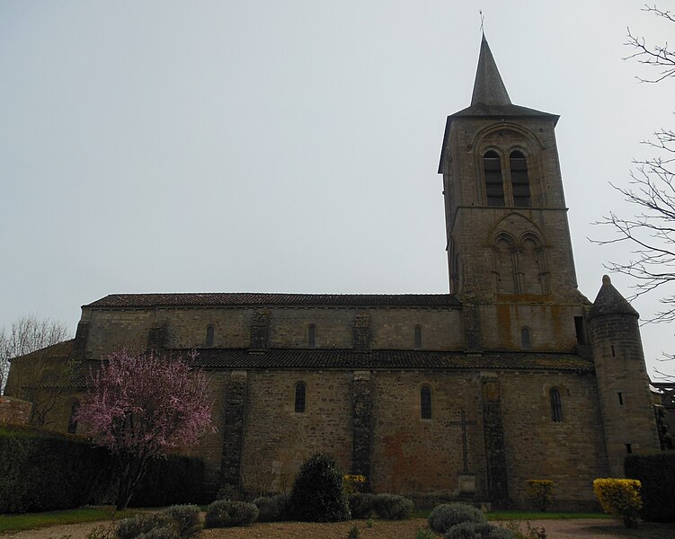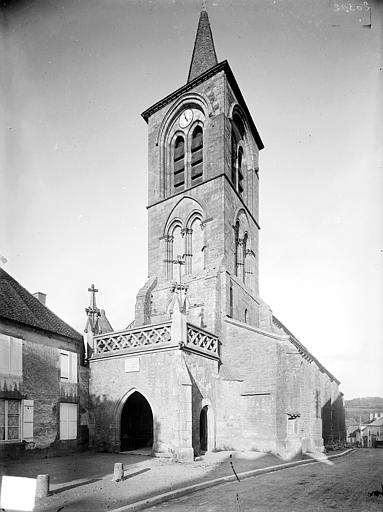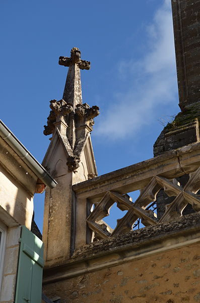 À l'extérieur, la haute nef romane se distingue par ses deux niveaux de baies en plein cintre et ses modillons, dont certains sculptés de têtes sur le côté sud. Le petit portail sud, restauré, reste dans l'ensemble roman avec ses colonnes, chapiteaux à crochets et voussures. Le grand clocher, implanté sur la première travée de la nef, possède deux étages supérieurs du XIIIe siècle ornés de grandes arcatures géminées évoquant l'église de Saint-Père, en version moins ouvragée. Du début du même siècle date aussi le grand portail sous le porche, un ensemble soigné de colonnettes, chapiteaux, trumeau et voussures dont le tympan représente, à gauche, une Adoration des Mages autour de la Vierge en majesté et de l'Enfant entourés d'anges, et, à droite, une Assomption de la Vierge. Le porche occidental, datant des années 1500, présente une voûte à liernes ; son toit en bâtière a été supprimé pour mieux éclairer la nef. La terrasse, la balustrade, la gargouille et la tourelle d'escalier menant au clocher sont des ajouts du XIXe siècle. Le beffroi contenait quatre cloches avant la Révolution ; il n'en subsiste aujourd'hui qu'une seule. La charpente porte la marque "I‑F 1748". De la commanderie il reste peu de vestiges : l'ancien logis à gauche de la route face à la mairie et un cellier souterrain sous la place, inaccessible.