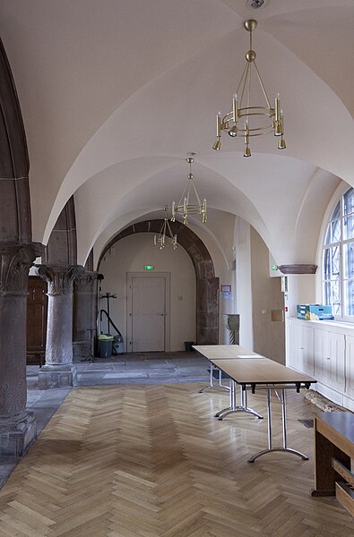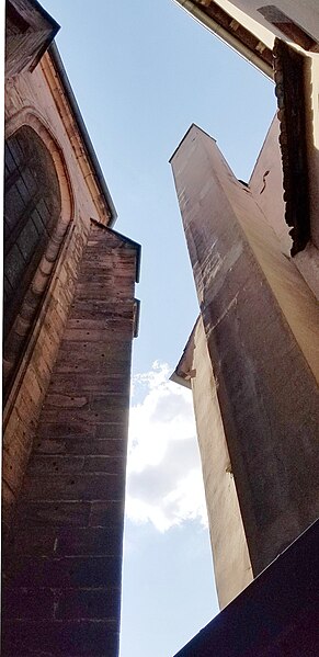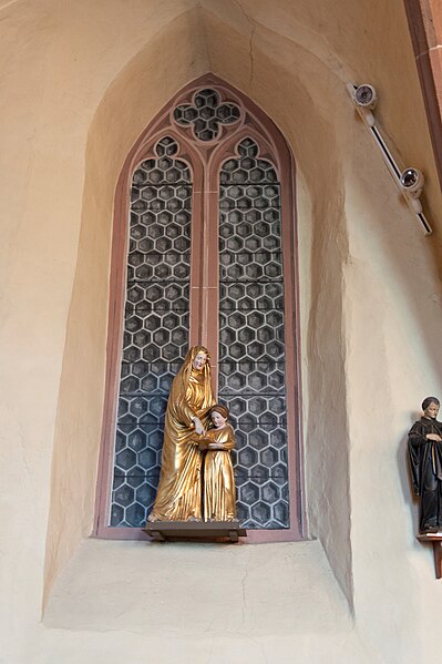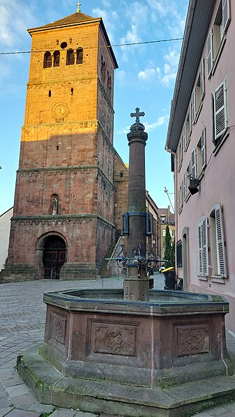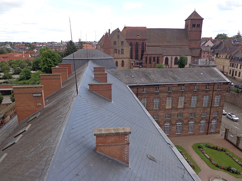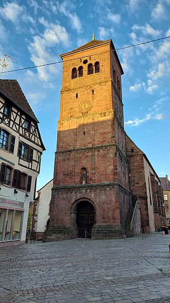 L’église Notre‑Dame‑de‑la‑Nativité de Saverne, située dans le Bas‑Rhin, est une paroissiale anciennement collégiale classée au titre des monuments historiques en 1977. Le clocher‑porche et les murs latéraux du vaisseau central datent du milieu du XIIe siècle et témoignent de l’origine romane de l’édifice. L’église est attestée sous le vocable de saint Barthélemy depuis 1285 et des curés y sont mentionnés dès 1211, ce qui indique une présence cultuelle antérieure. À la fin du XIVe siècle une première campagne gothique a surélevé la tour et transformé la nef, avec la reconstruction de l’extrémité orientale de la nef lors du remplacement du chœur roman vers 1380. Le chœur gothique fut voûté entre 1420 et 1440. Sous l’épiscopat d’Albert de Bavière l’église fut élevée au rang de collégiale en 1485 et de grands travaux d’agrandissement suivirent. En 1493 fut construite une chapelle consacrée en 1496 à la Vierge, destinée à recevoir le tombeau monumental d’Albert de Bavière, dont le mausolée fut en grande partie détruit à la Révolution. Vers 1494 le collatéral nord fut édifié ou remanié, puis entre 1493 et 1501 la nef fut transformée, son toit surhaussé et pourvu d’une voûte en résille à la fin du XVe siècle. La sacristie fut réalisée à la fin du XVe siècle et certains de ces travaux sont attribués soit à Hans Luedemann soit à Hans Hammer. La galerie de style Renaissance commandée en 1539 et achevée en 1541 reliait le château à la chapelle Saint‑Michel et comprenait à l’étage une bibliothèque ; elle a été convertie par la suite en sacristie. Parmi les annexes, l’ossuaire, généralement daté du XIVe siècle, est surmonté par la chapelle Saint‑Michel et a été intégré aux aménagements successifs liés à la galerie. Au XVIIe siècle furent aménagées des constructions secondaires, notamment la Ritterstube élevée en 1619 et détruite en 1875, tandis que la tour et la voûte du collatéral firent l’objet de restaurations en 1691 et 1694. En 1717 le jubé fut déplacé contre le revers de la façade ; sa balustrade fut déposée en 1826 puis partiellement rétablie entre 1874 et 1876. La flèche gothique de la tour fut remplacée en 1760 par un toit en pavillon par François Pinot, et le campanile du chœur fut supprimé en 1842. La Révolution entraîna la perte du rang collégial, le pillage et la destruction de tombeaux, la transformation temporaire en temple de la Raison puis en entrepôt ; l’église fut rendue au culte catholique en 1799. Aux XIXe et début du XXe siècles l’édifice fit l’objet de restaurations importantes : après 1870 les autorités allemandes ordonnèrent une grande restauration, la Ritterstube fut démolie, le badigeon retiré, le mobilier refait en style néo‑gothique et de nouveaux vitraux installés. Des projets d’agrandissement au début du XXe siècle furent discutés ; la tour menaçant ruine conduisit à la fermeture temporaire de l’église en octobre 1912, sa réouverture au culte en novembre 1913 et le rétablissement de la sonnerie des cloches en mai 1914. L’édifice subit des dégâts lors d’un bombardement aérien le 31 juillet 1918 ; pendant la Seconde Guerre mondiale l’ossuaire servit d’abri anti‑aérien et ne retrouvant ses dispositions antérieures qu’au cours des travaux de 1969‑1973. La campagne de 1969‑1973 a permis d’importantes restaurations, le retrait de la majorité du mobilier néo‑gothique et la remise en état des annexes ; des peintures murales datées de 1494 et 1596 ont été mises au jour en 1983. L’édifice présente un plan complexe mêlant éléments romans—notamment le clocher‑porche—et campagnes gothiques successives qui ont façonné le chœur, la nef, le collatéral nord et la chapelle de la Vierge. Le chœur se caractérise par ses baies à trois lancettes et ses voûtes d’ogives plus élancées que celles de la nef; la nef conserve une grande voûte à résille du XVe siècle portée par des piliers intérieurs adossés aux anciens murs. Le collatéral nord et la chapelle de la Vierge sont voûtés d’ogives et ornés de clés armoriées ; la chapelle abrite des caveaux et a accueilli plusieurs monuments funéraires aujourd’hui détruits ou déplacés. Le mobilier comporte des fonts baptismaux de 1615, une chaire datée de 1495 attribuée à Hans Hammer, des sculptures médiévales et des œuvres de la Renaissance, plusieurs éléments étant classés au titre des Monuments historiques, de même que la cloche dite Bürgerglocke et le buffet de l’orgue avec le garde‑corps de la tribune. Enfin, l’église a tenu une place centrale dans la vie religieuse de Saverne, siège de confréries et lieu de processions, et a été marquée par les transformations religieuses et politiques des époques médiévale, moderne et révolutionnaire.