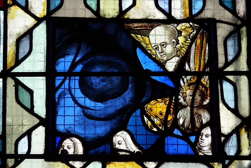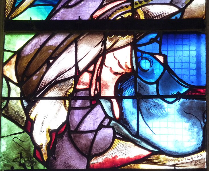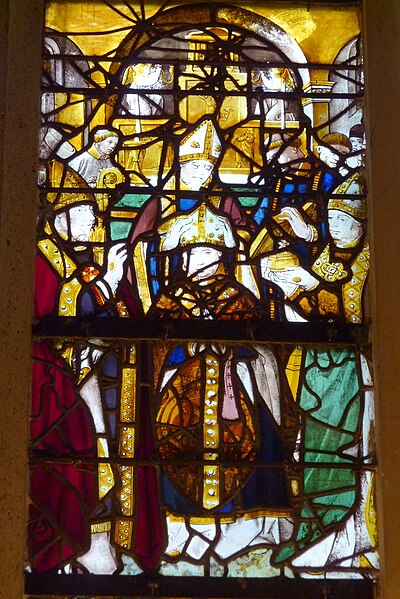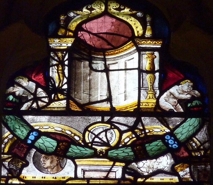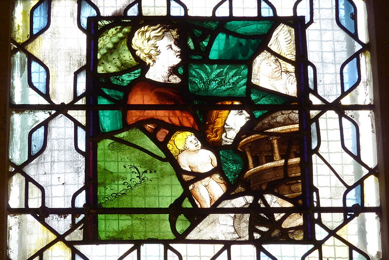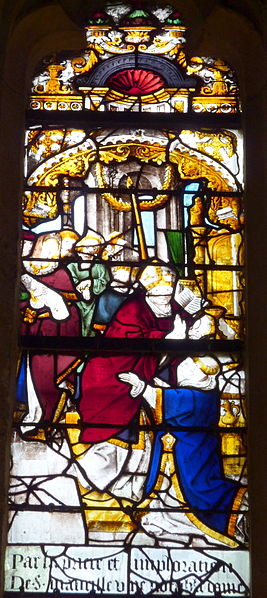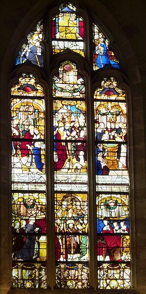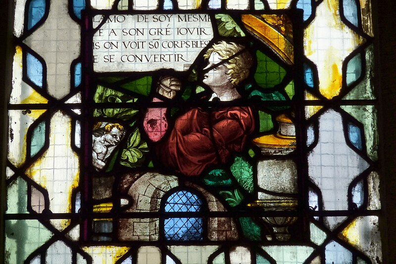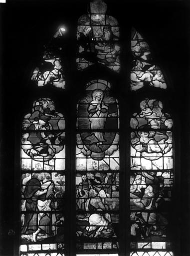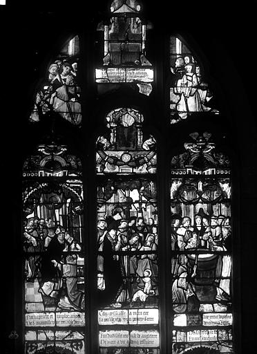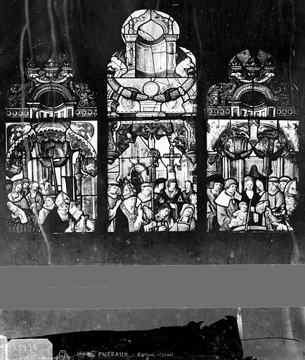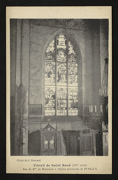 Plusieurs vitraux du XVIe siècle ornant l'église ont été inscrits à l'inventaire des monuments historiques en 1886. Ils représentent notamment la Vie de saint René d'Angers (parfois appelée Vie de saint Maurille), l'Assomption de la Vierge (datée de 1558 et offerte par un boucher de Puteaux), la Pentecôte (attribuée au verrier Jacques Rousseau et éventuellement datable de 1558), ainsi que des compositions comme un Calvaire et une Adoration des bergers. Le vitrail du Baptême du Christ a disparu.