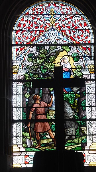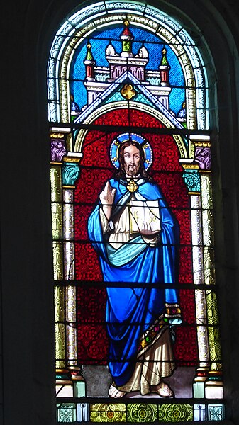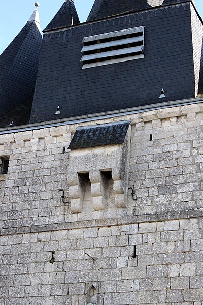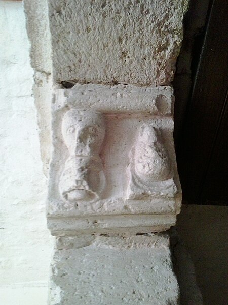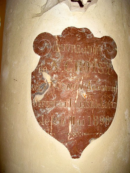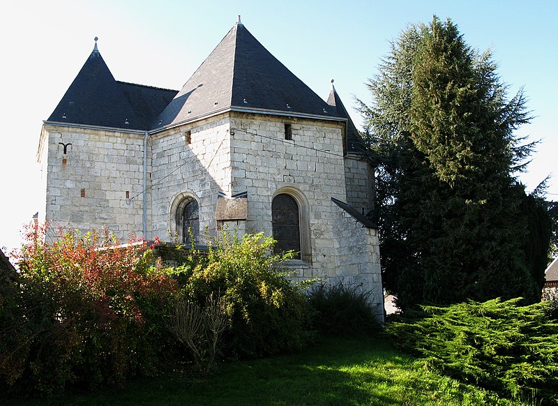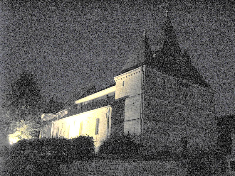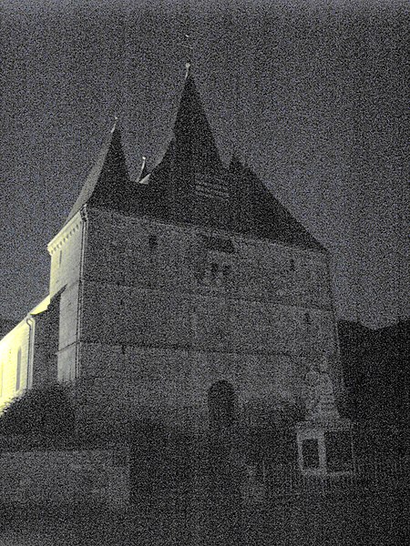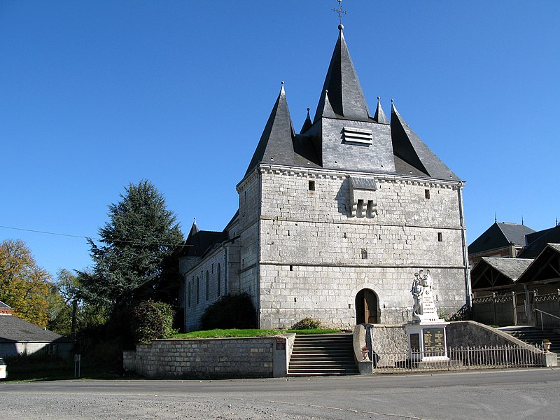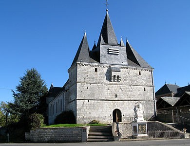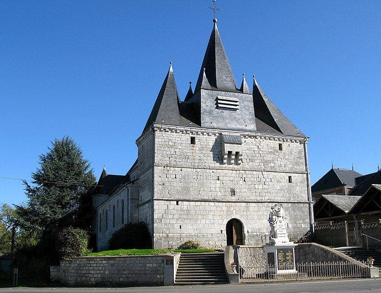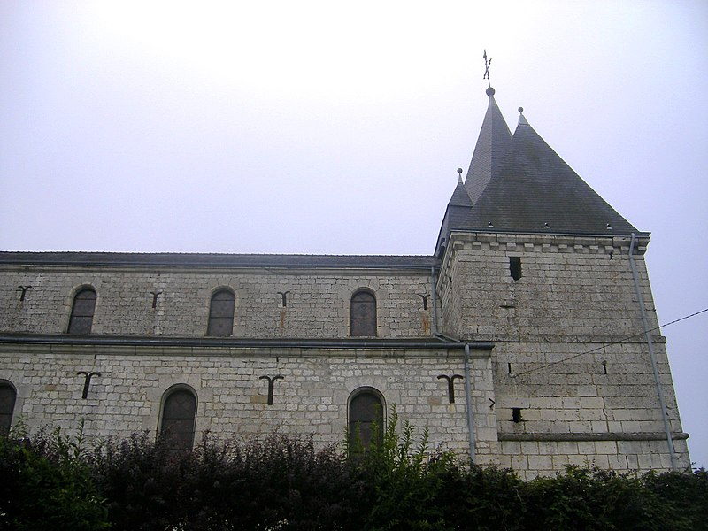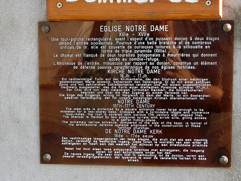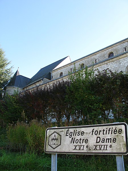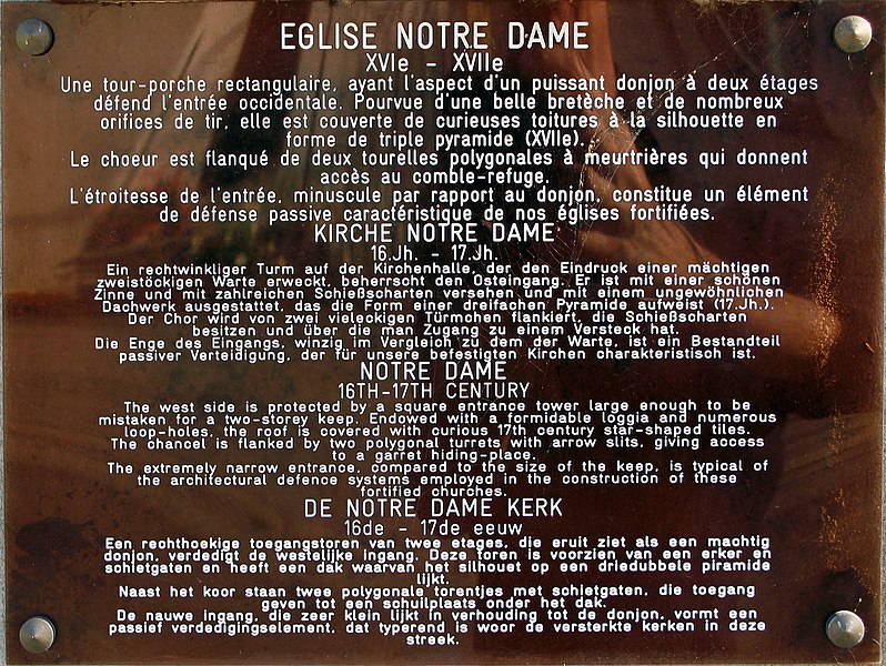 L'entrée occidentale est défendue par une tour-porche massive, un donjon de deux étages percé de canonnières et surmonté d'un clocher entouré de clochetons. Une bretèche renforce la défense de l'accès. Deux tourelles flanquent le chevet et l'abside forme un pan à cinq côtés. Une plaque est apposée sur le muret devant l'édifice.