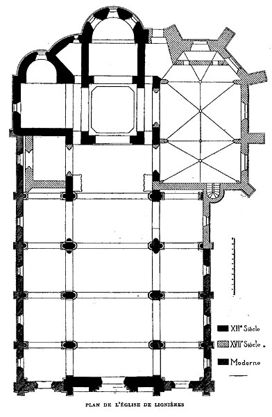 L'église Notre‑Dame de Lignières se trouve dans la commune de Lignières, dans le département du Cher, en rive droite de l'Arnon, à l'est du bourg ; on y accède par la rue Colbert ou par un pont sur l'Arnon. Mentionnée dès 1115 dans une bulle du pape Pascal II, l'édifice prend sa source au XIe siècle comme chapelle, édifiée à l'emplacement de la chapelle Sainte‑Marie, et semble avoir été agrandi au XIIe siècle. La chapelle fut étendue vers 1170, consacrée en 1450 par Jean Cœur et élevée en collégiale par une bulle de Sixte IV en 1471. Gravement endommagée, pillée et partiellement détruite lors de la première guerre de Religion en 1563, elle subit ensuite diverses réparations jusqu'au milieu du XIXe siècle. Une restauration complète de la nef est décidée en 1860 et mise en œuvre à partir de 1863 d'après les plans de MM. Duchemin et Gallicher ; lors de ces travaux deux bas‑côtés sont ajoutés. Le dernier aménagement majeur date de 1877 avec la construction d'un clocher remplaçant un dôme édifié en 1635, lui‑même substitué à une ancienne flèche très délabrée. Des travaux de mise hors d'eau du clocher ont été réalisés de décembre 2013 à fin mai 2014. L'ensemble de l'église est inscrit à l'inventaire supplémentaire des monuments historiques par arrêté du 2 mars 1926. D'un point de vue architectural, il s'agit d'un édifice du roman tardif, enrichi d'éléments gothiques typiques du Berry ; de l'époque romane subsistent notamment l'abside, les absidioles, le portail occidental et plusieurs chapiteaux sculptés. À l'origine la construction comportait une nef unique voûtée en berceau de bois, remplacée par la suite par un enduit en plâtre ; l'ajout des bas‑côtés au XIXe siècle lui donne aujourd'hui la forme d'une basilique à trois vaisseaux. La croisée du transept est occupée par une coupole sur trompes qui porte le clocher et est contrebutée par des quarts de cercle ; les croisillons présentent des absidioles en cul‑de‑four et, au XVIIe siècle, une chapelle a remplacé l'un des bras du transept.