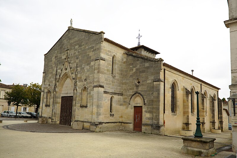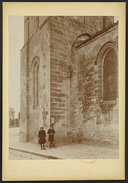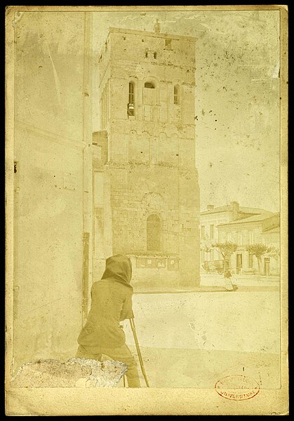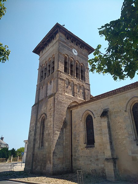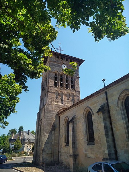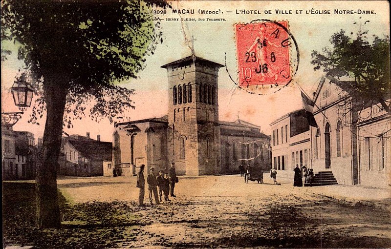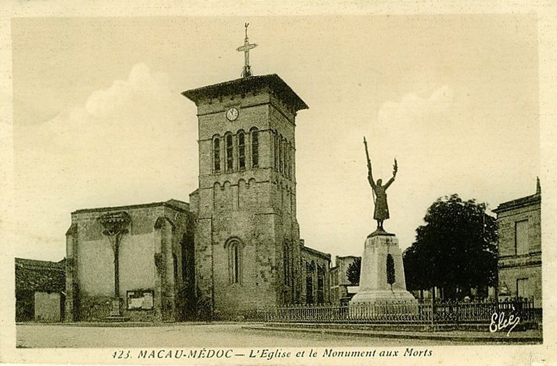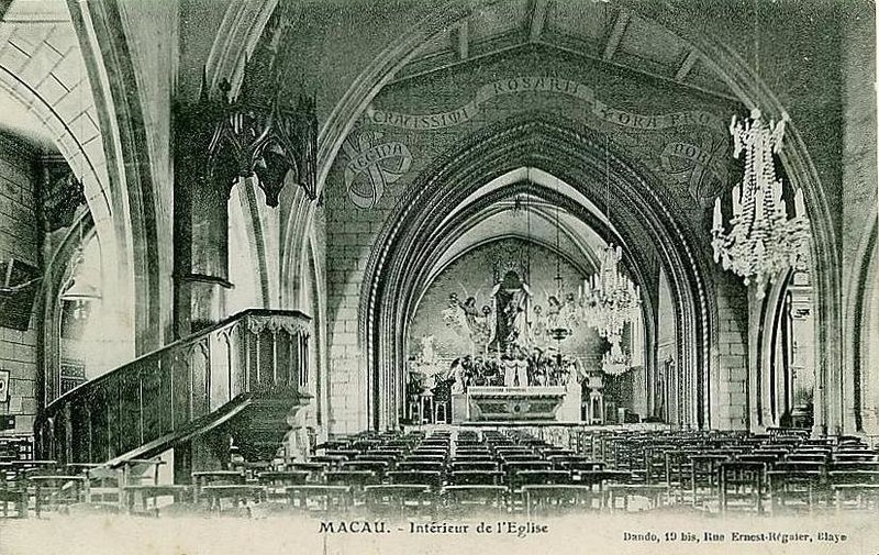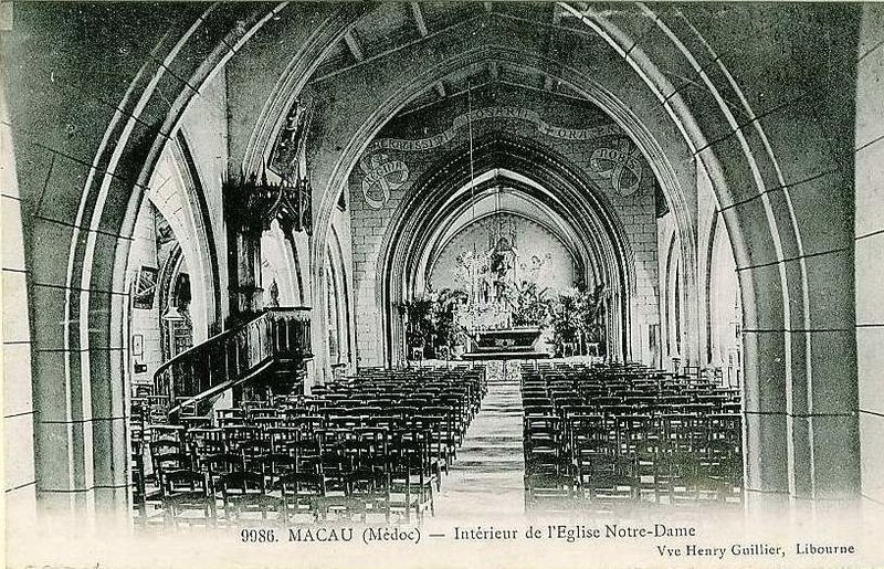 L'église Notre‑Dame de Macau, située à l'extrémité est du bourg de Macau (Gironde, Nouvelle‑Aquitaine), est une église catholique. Un texte de donation de 1027 atteste l'existence d'un édifice antérieur. L'édifice actuel est postérieur : le clocher date du XIIe siècle, la nef a été reconstruite au XVe siècle et diverses parties de l'église ont été remaniées aux XVIIe et XIXe siècles, avec des réaménagements du clocher et du reste de l'église dans la seconde moitié du XIXe siècle. Le clocher est classé au titre des monuments historiques par arrêté du 22 septembre 1893. À l'extérieur, le clocher carré du XIIe siècle s'élève sur trois niveaux, haut d'environ 22 mètres pour une base de 7 mètres de côté. Côté église, il s'ouvrait par un arc surhaussé reposant sur des colonnes, évoquant une inspiration mauresque. L'ouvrage comprend un étage de soubassement correspondant à une grande salle voûtée, un étage intermédiaire décoré sur chaque face d'arcatures en applique, et un beffroi ouvert par quatre longues baies sur chacune des faces ; ces baies ont été modifiées, sur un côté, au XVIIe siècle. Le rez‑de‑chaussée comporte deux fenêtres d'inspiration romane et le dernier niveau est percé sur chaque face de quatre baies en plein cintre à fines colonnettes sculptées. L'église possède une nef de quatre travées entourée de deux bas‑côtés, précédée d'un avant‑corps surmonté d'une tribune qui accueille un orgue daté de 1867. Des fenêtres à arc brisé percent les élévations latérales et le chœur est entièrement peint. Parmi le mobilier, plusieurs pièces sont protégées au titre des monuments historiques, en particulier le maître‑autel en marbre du XVIIIe siècle et le tabernacle du maître‑autel, en bois doré du XVIIe siècle. La documentation iconographique comprend des vues de l'église à la fin du XIXe et au début du XXe siècle, des photographies de l'intérieur vers 1900‑1920, ainsi que des images du clocher, de la façade et du portail d'entrée.