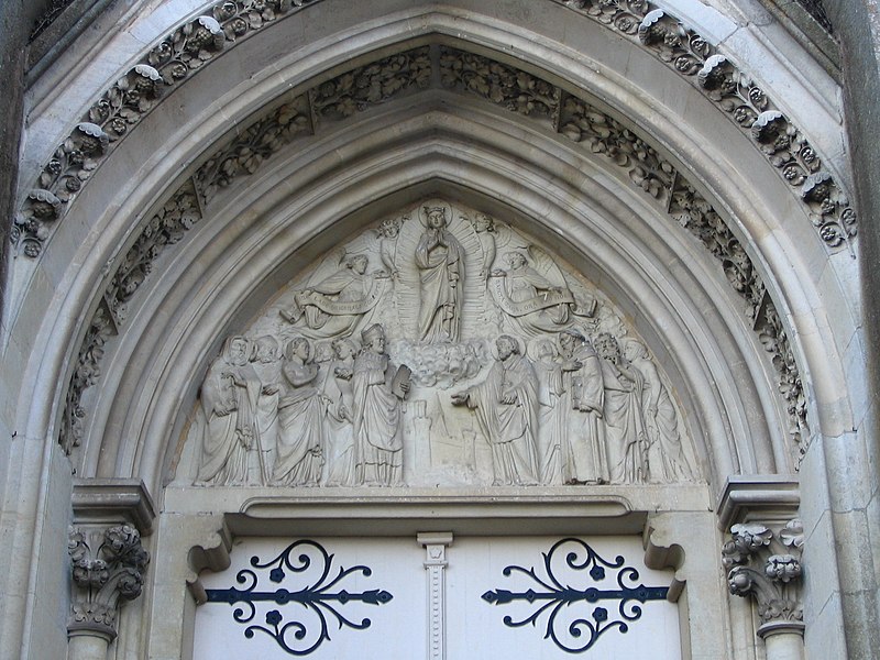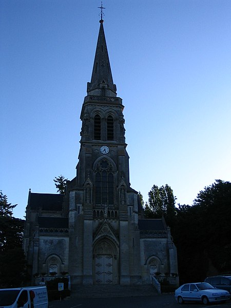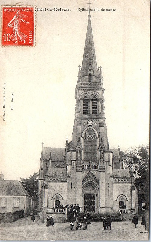 De plan en croix latine, l'église présente un clocher qui s'élève à 75 mètres au‑dessus de l'Huisne. Sur la façade, au niveau des contreforts, figurent les statues du bienheureux Aymard de Cluny et de sainte Adélaïde, placées de part et d'autre d'une verrière, et les quatre évangélistes entourent le clocher ; la Vierge à l'Enfant se trouve au sommet du portail sur le pinacle, tandis que le tympan de Cottereau est orné d'un bas‑relief représentant l'Immaculée Conception.