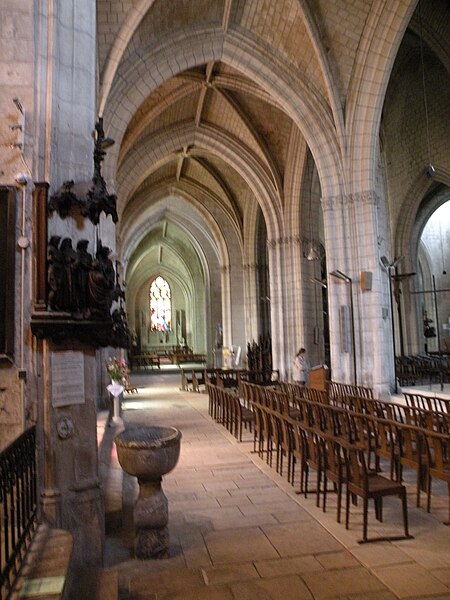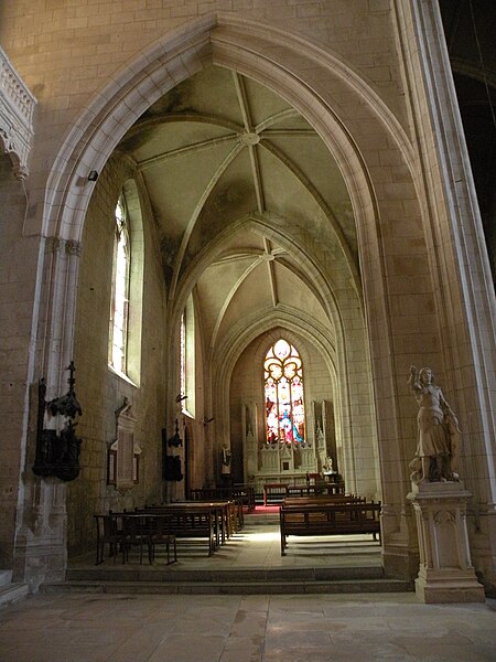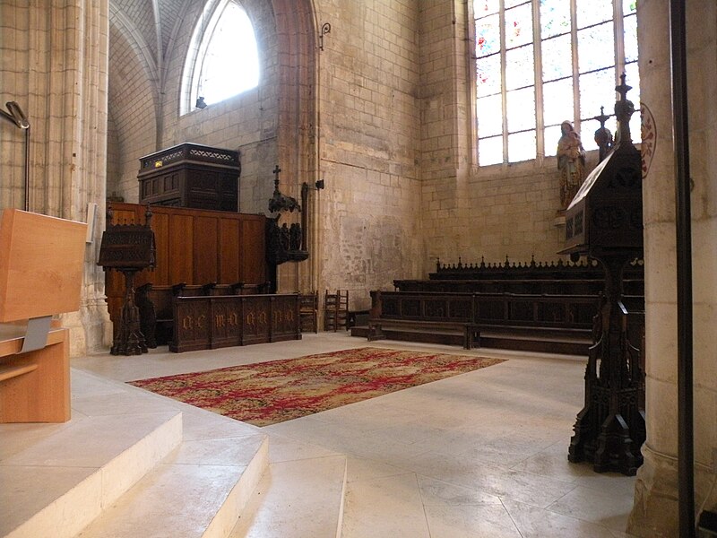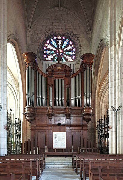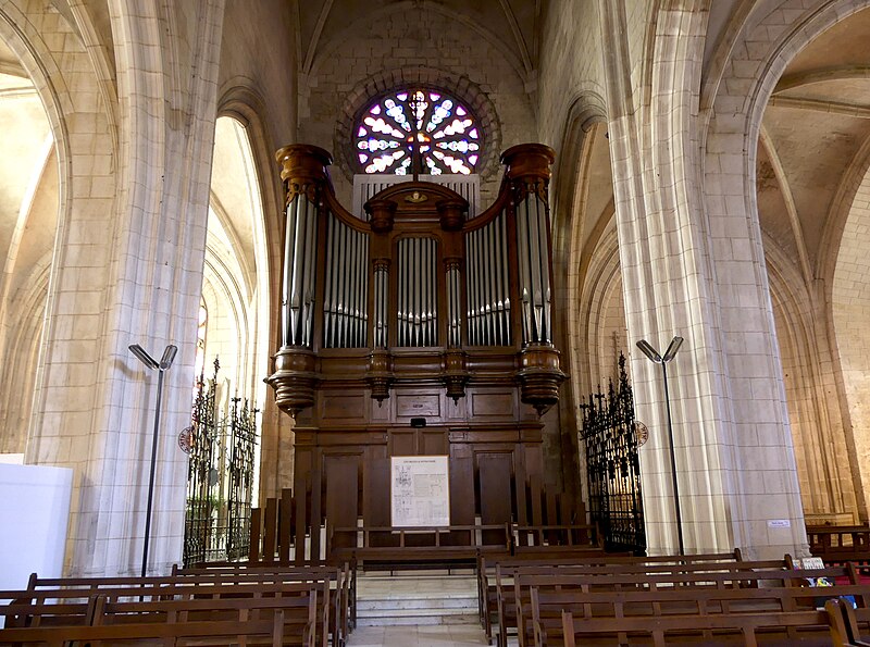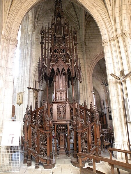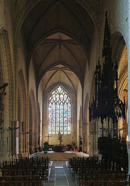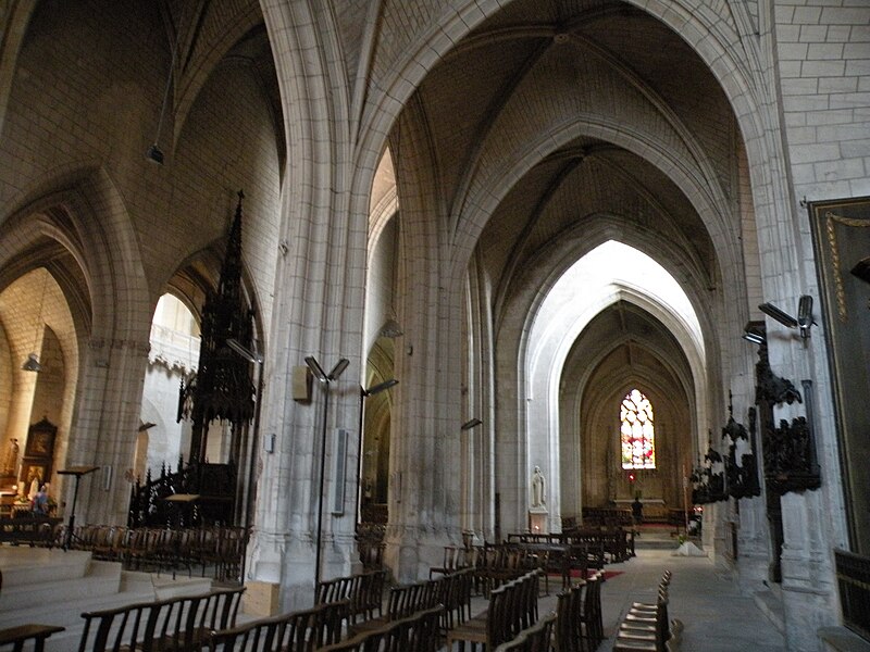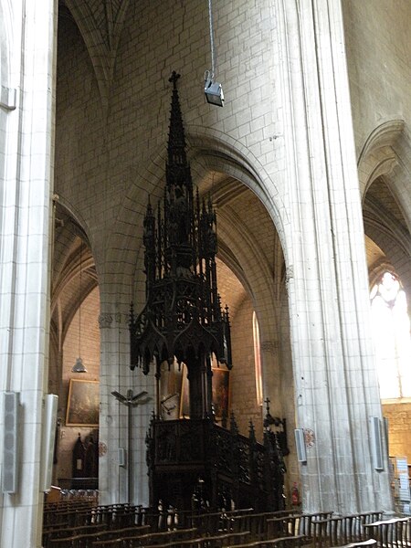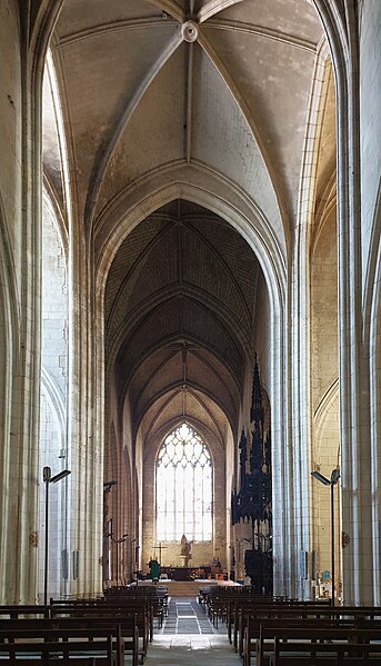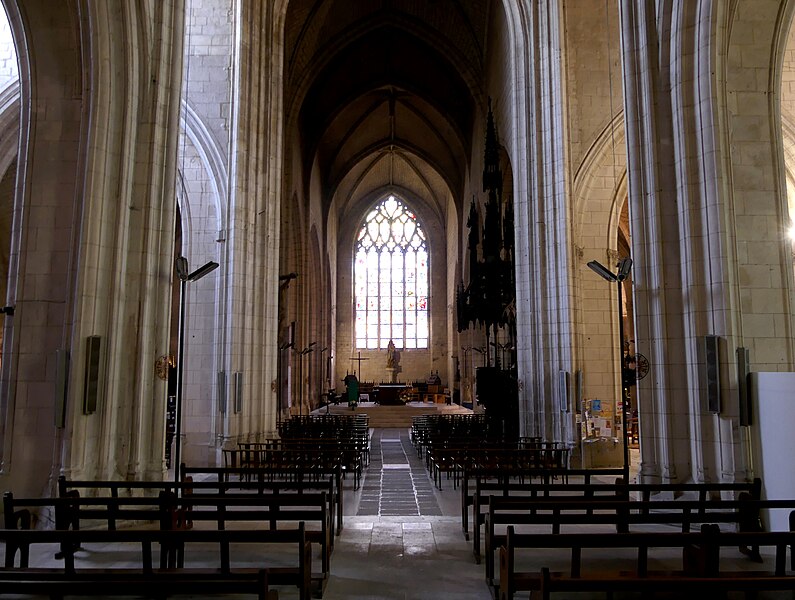 L’édifice mesure 55 mètres de longueur intérieure, la hauteur sous voûte atteint 18 mètres et la hauteur du clocher est de 75 mètres. Le vitrail de l’Arbre de Jessé, commandé à François Loizeau en 1615, fut remis au plomb en 1784 ; plusieurs compartiments furent brisés après le déplacement et l’installation de l’orgue en 1835, d’autres panneaux furent ensuite enlevés et, en 1911, huit panneaux manquaient selon un relevé publié la même année par Henri Clouzot. La plupart des autres verrières sont dues aux ateliers tourangeaux Lobin et ornent les chapelles : la chapelle des Parabères (Marie Madeleine au pied de la Croix), la chapelle du Sacré‑Cœur (l’abbé Taury offrant l’église au Christ), la chapelle des Bienheureux Martyrs (saint Jean‑Baptiste et saint Étienne), la chapelle Saint‑Roch (Notre‑Dame du Perpétuel Secours et Notre‑Dame des Sept Douleurs), la chapelle Saint‑Joseph (la Mort de saint Joseph entouré de Marie et de Jésus), la chapelle du Saint‑Sacrement (la Cène), la chapelle de la Vierge (Rosa mystica et Lilium interspinas), la chapelle du Rosaire (la Crucifixion et la Cène), la chapelle Sainte‑Anne (sainte Anne et saint Joachim), la chapelle Saint‑Vincent‑de‑Paul (saint Paul prêchant à Athènes) et la chapelle des fonts baptismaux (baptême de Clovis par saint Rémy et Sainte Clotilde proclamant sa foi). Un orgue est mentionné dès 1745 ; l’instrument actuel fut commandé en 1841 à la maison Daublaine et Callinet. Le mobilier comprend un chemin de croix sculpté par Durieux en 1880, des retables et toiles de Bernard d’Agesci (notamment l’Éducation de la Vierge et Saint‑Vincent‑de‑Paul), une chaire à prêcher de 1877, la cuve baptismale, une Vierge à l’Enfant en plâtre polychrome réalisée en 1876 par Aristide Belloc et moulée par l’atelier niortais Vidiani, une Pietà de 1803 de Bernard d’Agesci, la Mort de saint Joseph peinte par Daufer en 1836, ainsi que des tableaux provenant de l’abbaye des Châteliers et de l’ancien Collège de l’Oratoire, dont une Adoration des Mages par Bon Boullogne (1680).