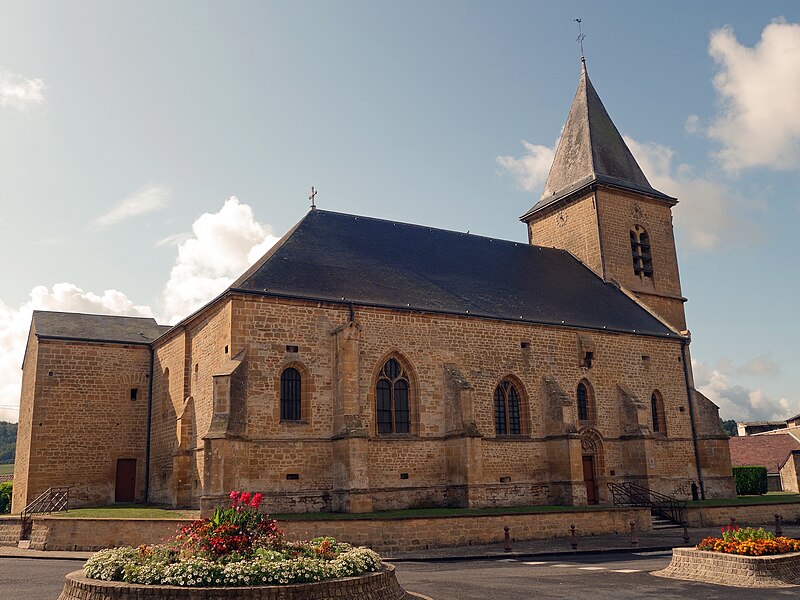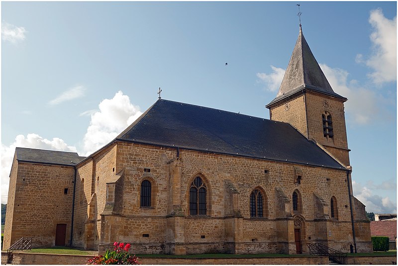 L'église Notre‑Dame se trouve à Nouvion‑sur‑Meuse, dans le département des Ardennes, à proximité de la Meuse dont elle est séparée par la gare et la voie ferrée. Son plan est essentiellement rectangulaire ; elle est pourvue d'une tour‑porche et, à l'arrière contre le chevet, d'un bâtiment rectangulaire percé d'orifices de feux. Les bas‑côtés sont pourvus de canonnières. À l'intérieur, les éléments les plus remarquables sont la cuve baptismale de style roman, taillée en pierre de Meuse et sculptée de motifs végétaux et animaliers, ainsi que le retable en bois du XVIe siècle représentant des scènes de la vie du Christ. On y trouve également une poutre de gloire accompagnée de trois statues en bois : le Christ en croix entre la Vierge et saint Jean. Le mobilier et les sculptures de l'église sont documentés par le ministère de la Culture et par des ressources spécialisées comme Mérimée, Clochers de France et l'Observatoire du patrimoine religieux ; y figurent notamment deux frises en bois sculpté, un groupe du pélican sur armoire eucharistique, un aigle de lutrin en bois et le maître‑autel avec la partie supérieure du retable peinte représentant l'Assomption de la Vierge. L'édifice date du XVIe siècle et a été inscrit au titre des monuments historiques en 1972. La commune de Nouvion‑sur‑Meuse a procédé à la réfection du clocher en 2010, à la suite de la tempête du 8 octobre 2009. La bibliographie relative à l'église comprend des travaux d'Hubert Collin, Patrick Demouy et Jean‑François Pinard, ainsi qu'un article de L'Union évoquant la réfection du clocher.