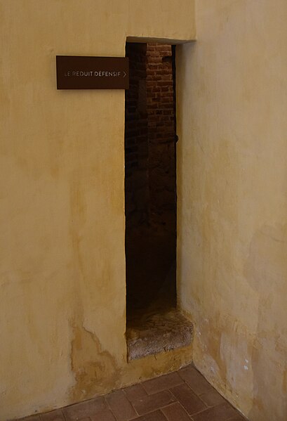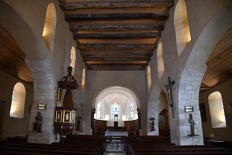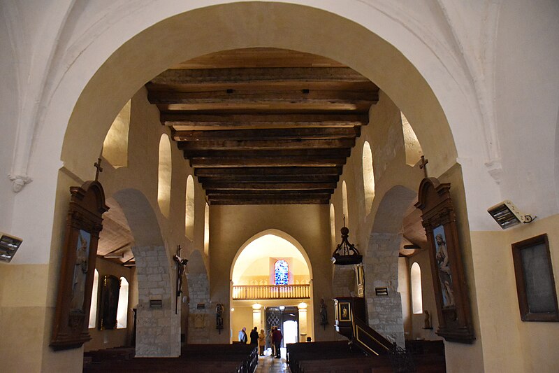 La façade présente le large donjon carré encadré par deux tours ; une tourelle à base tronquée est suspendue à chaque extrémité du transept et, au flanc nord de la nef, une autre tour voit sa hauteur primitive réduite par la toiture. À l'intérieur, la nef, munie de deux collatéraux, est percée de larges arcades et s'ouvre sur un transept ; seul le chœur et le transept sont voûtés et ornés d'arceaux. Le donjon forme, au rez‑de‑chaussée, un porche ; le premier étage conserve des traces de voûte et l'on y accède par un escalier de bois établi dans la tour nord, elle‑même percée de nombreuses meurtrières.