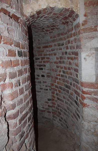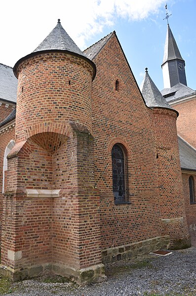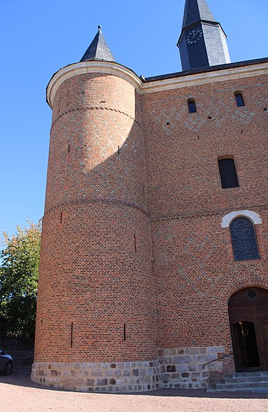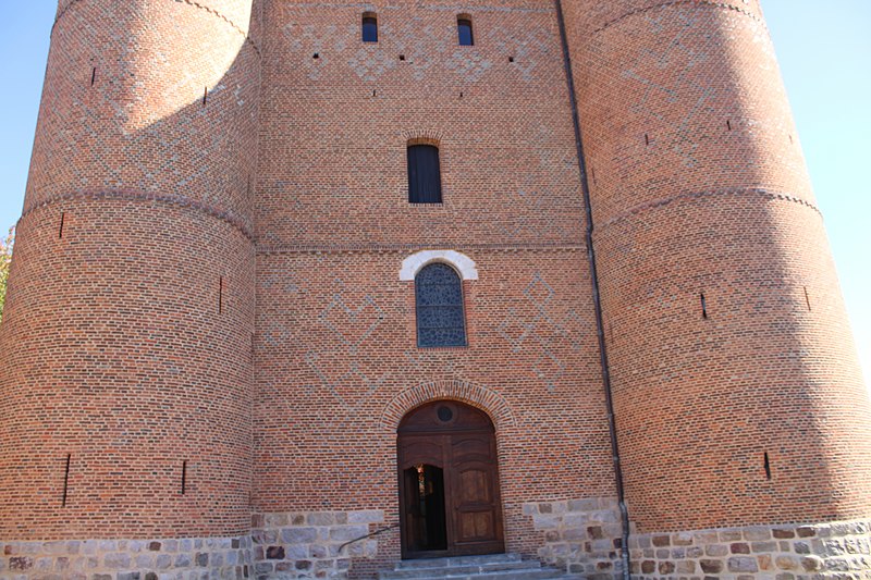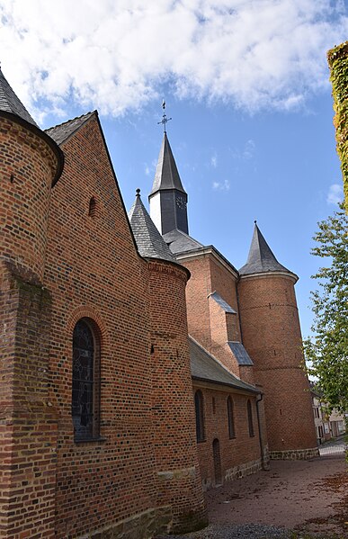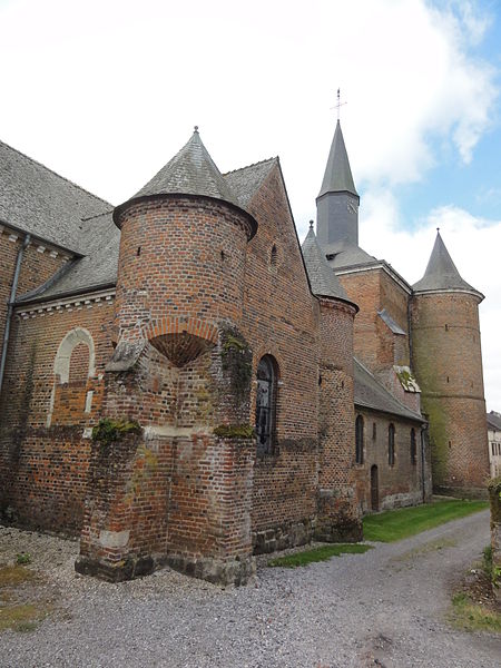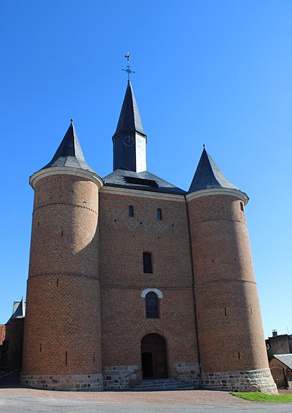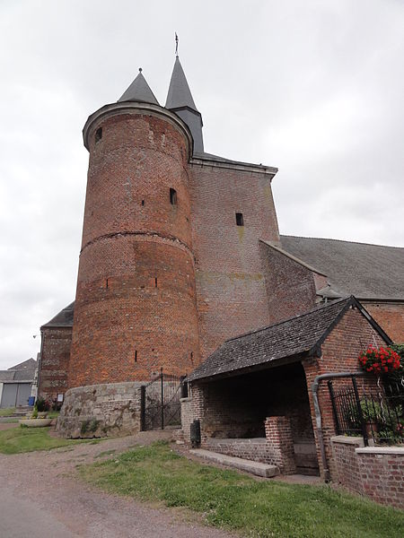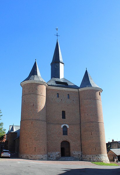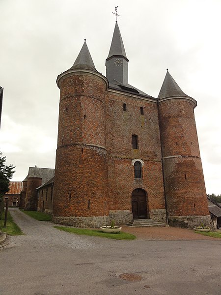 L'église Notre‑Dame de Plomion, dans l'Aisne, est une grande construction en brique reposant sur un soubassement de grès. Elle se compose de quatre parties : une nef en deux travées, séparée du chœur de même largeur par un transept, et un imposant donjon de plan carré. Le donjon, d'origine à trois niveaux, est flanqué de deux tours cylindriques et percé de nombreuses meurtrières : sur soixante repérées dans l'ensemble, quarante‑deux appartiennent au donjon, la plupart regroupées sur les tourelles. L'ensemble illustre l'adaptation d'une structure religieuse à une double fonction militaire et cultuelle. Une église primitive à trois nefs, datée des XIIe‑XIIIe siècles, a laissé des élévations de la nef centrale et quelques baies remployées. L'édifice actuel, construit autour de cette première église médiévale, remonte à la limite des XVIe et XVIIe siècles. En 1733 d'importantes transformations confiées à A. Gorisse ont uni la nef et les collatéraux sous une toiture unique — supprimant les fenêtres hautes encore visibles dans les combles —, créé une sacristie, réduit les huit arcades de la nef à quatre, agrandi les baies des collatéraux et repris les parties hautes des tours, tourelles et collatéraux ; la corniche du collatéral sud porte l'inscription « A. GORISSE 1733 ». De nouvelles interventions ont eu lieu au XIXe siècle : le clocher a été reconstruit en 1806, l'accès à la sacristie depuis le chœur a été supprimé en 1855 au profit d'une ouverture dans le bras sud du transept, et une tribune a été installée à l'entrée de la nef en 1867. L'église a fait l'objet d'inscriptions au titre des monuments historiques en 1927 (clocher et échauguettes du transept) puis en totalité en 1987, un vaste chantier de restauration a été mené de 2019 à 2022 et l'édifice a été classé monument historique en avril 2025.
