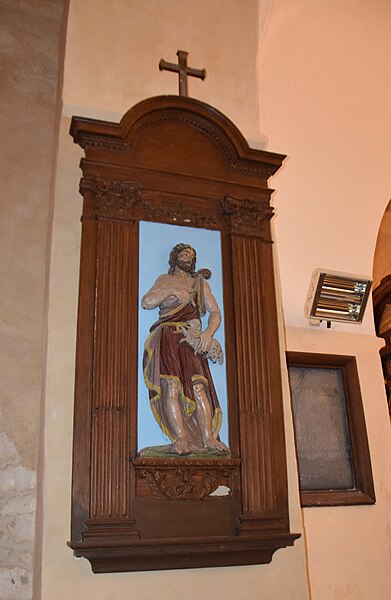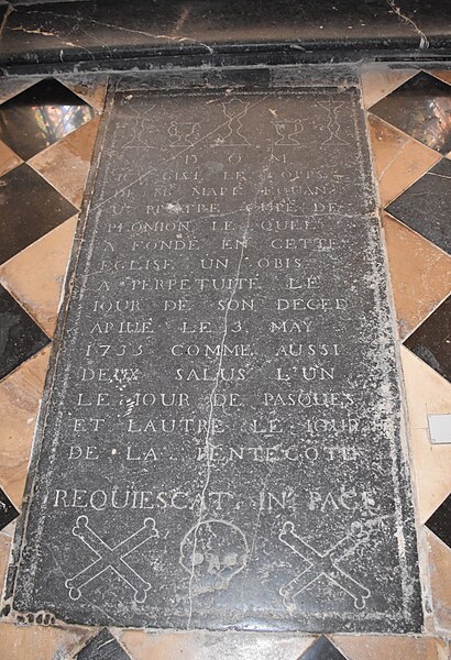 Parmi les œuvres et mobiliers, une toile de 87 × 110 cm, de qualité médiocre, représente dans le transept droit un moine en robe brune en contemplation devant un crucifix ; dans le transept gauche, de part et d'autre de l'autel, deux pilastres en bois sculpté portent des guirlandes de feuilles et de fruits, et une grande toile de 1,55 × 2,00 m illustre Le Christ au jardin des oliviers. Dans le sanctuaire, deux toiles de 56 × 73 cm représentent respectivement Abel offrant un sacrifice et La lutte de Jacob avec un ange. À l'entrée du chœur, deux panneaux en bois peint, d'environ deux mètres de haut, figurent en demi‑relief saint Bruno tenant la couronne d'épines et le Bon Pasteur portant une brebis, chacun soutenu par une console ajourée ; le maître‑autel, en chêne, est moderne mais de style XVe siècle. Devant le sanctuaire se lit une dalle simple portant l'épitaphe de M. Marc Fouan, curé de Plomion, décédé le 3 mai 1735 ; une autre dalle sur un pilier du chœur rappelle Marc Nicolas Fouan, bachelier en droit et doyen de Vervins, fondateur à perpétuité des prières des Quarante‑Heures, décédé le 26 décembre 1768.