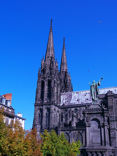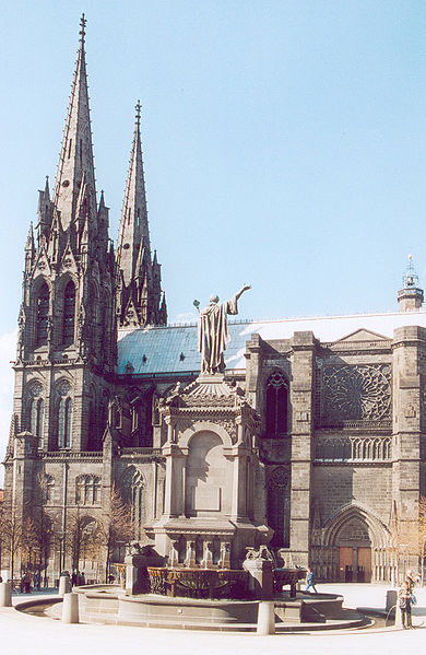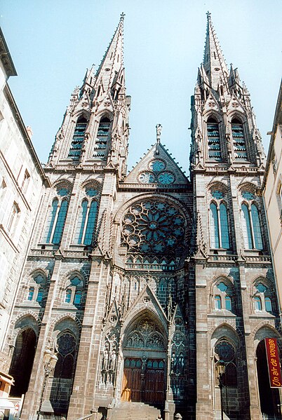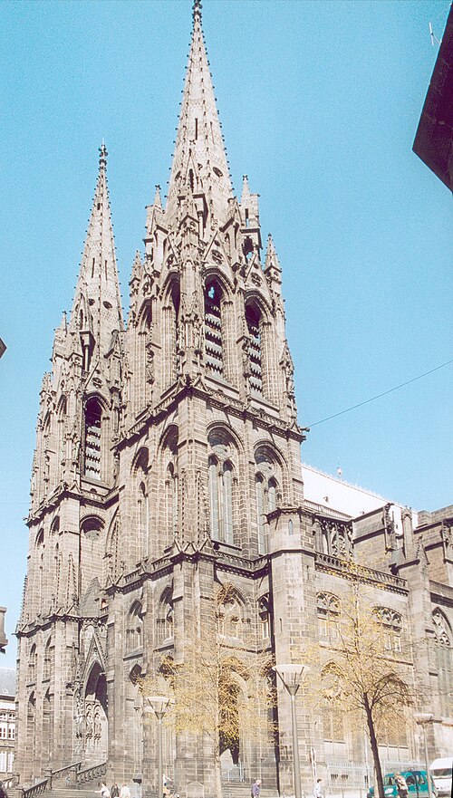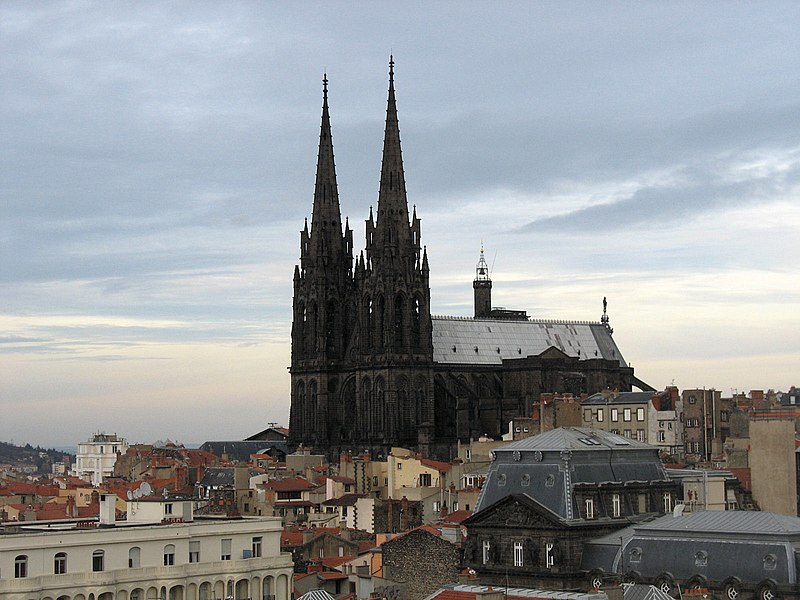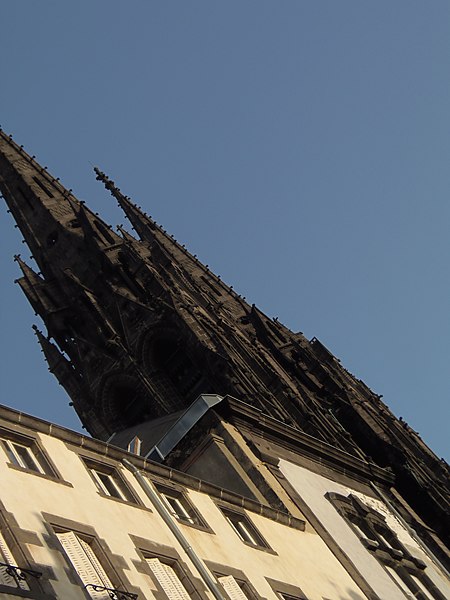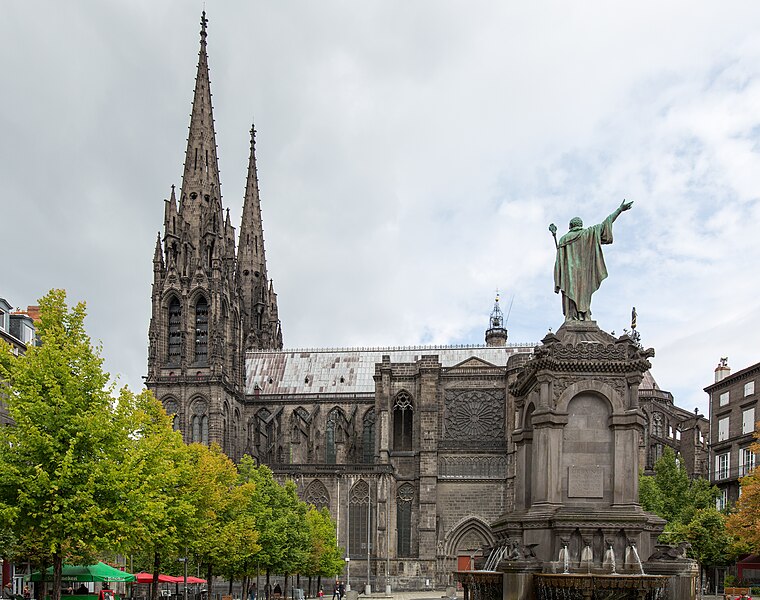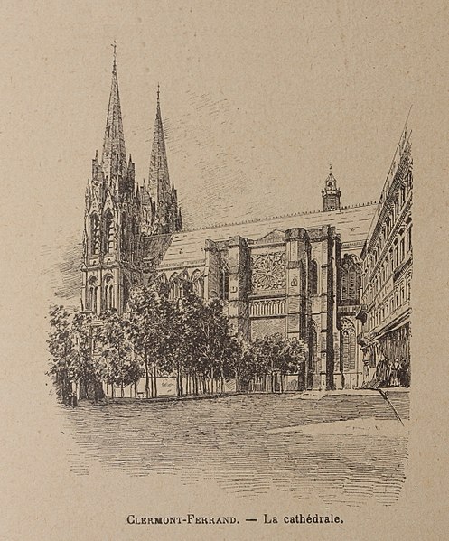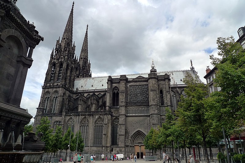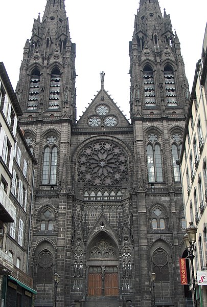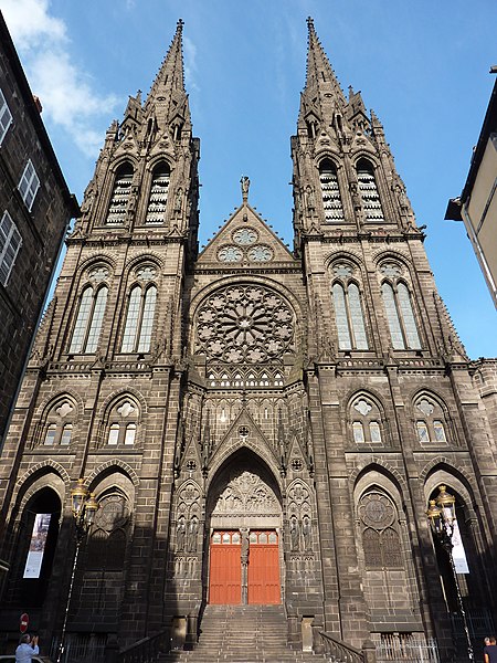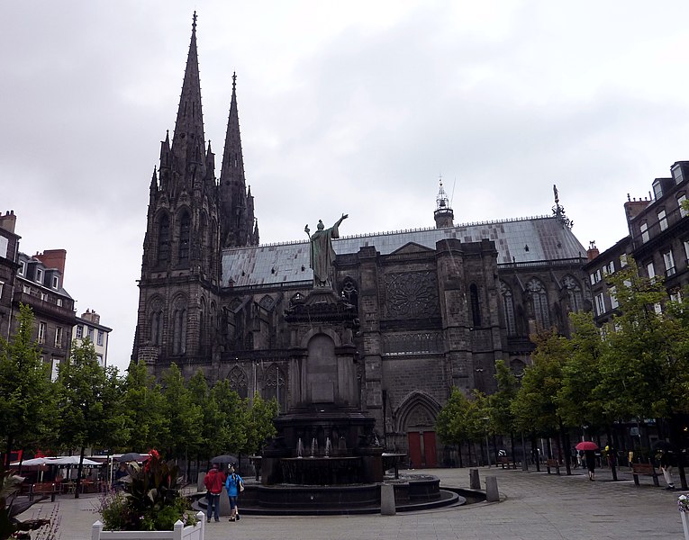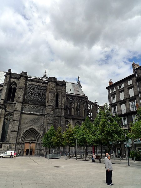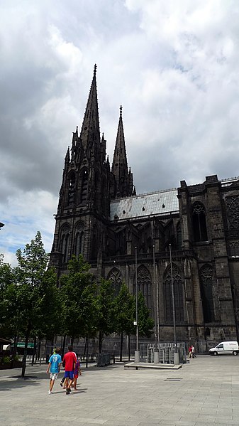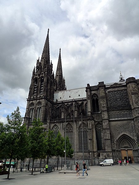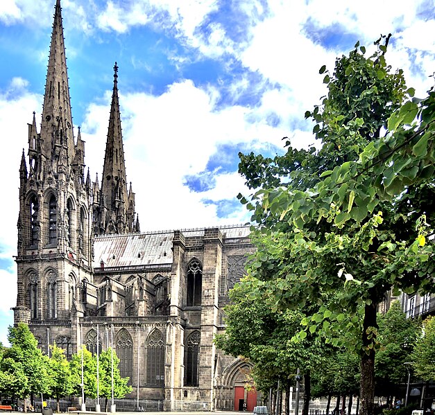 La cathédrale Notre-Dame-de-l'Assomption de Clermont-Ferrand est un édifice gothique, élevé à partir de 1248 au cœur de la ville et construit sur l'emplacement de successifs sanctuaires chrétiens, dont une cathédrale romane antérieure. Le premier édifice connu fut bâti au Ve siècle par l'évêque Namatius et dédié aux saints Vital et Agricol ; Grégoire de Tours en donne une description détaillée, indiquant un plan basilical richement orné et des dimensions précises. Le Ve siècle vit aussi l'activité de Sidoine Apollinaire et les défenses de la cité face aux Wisigoths ; la cathédrale primitive fut détruite puis restaurée à plusieurs reprises, notamment après des destructions attribuées à Pépin le Bref et aux raids normands, avant d'être reconstruite en style roman par l'évêque Étienne II. La cathédrale romane, consacrée à la Vierge, connut un grand rayonnement au haut Moyen Âge et enrichissements successifs, et sa crypte, découverte en 1885, conserve des vestiges mutilés mais permet de restituer un plan proche de l'an mil ; organisée autour d'une salle centrale à trois nefs et d'un chœur à niches, elle est bordée d'un déambulatoire où s'ouvrent quatre chapelles devenues funéraires, agrandies aux XIIe–XIIIe siècles, et contient un sarcophage antique en marbre blanc du IVe siècle. Au Xe siècle fut commandée à Clermont l'une des premières statues de la Vierge en majesté, reliquaire somptueux décrit dans le Codex Claromontanus, aujourd'hui détruit et fondu pendant la Révolution, mais connu par un dessin et un récit médiévaux. En 1248 l'évêque Hugues de la Tour lança la construction de la cathédrale gothique, inspirée par la Sainte-Chapelle ; le chantier fut conduit par Jean Deschamps qui introduisit des solutions originales d'élévation et d'éclairage et utilisa la pierre de Volvic, matériau sombre et résistant qui permit l'élancement des piliers et a valu à l'édifice le surnom de « cathédrale des charbonniers ». Jean Deschamps travailla notamment au chœur, dont la réalisation, peut-être aidée par des dons royaux, se rapproche stylistiquement des verrières de la Sainte-Chapelle ; le chœur, le transept et le début de la nef furent achevés vers la fin du XIIIe siècle, puis le chantier connut des ralentissements et des successions d'architectes jusqu'au milieu du XIVe siècle, période où la nef paraît achevée, tandis que les tours du transept et d'autres éléments furent progressivement édifiés. Sur la terrasse qui couronne le déambulatoire subsistent les épures de Jean Deschamps, dessins de chantier servant à la confection de gabarits pour la taille des pierres et utilisés pour diverses ouvertures et ornementations. La tour de la Bayette, unique témoignage des quatre tours d'origine, borde le portail nord et servit de beffroi et d'horloge ; haute d'environ 50 mètres, elle abrite une cloche de 1606 et fut le lieu d'expériences barométriques conduites par le conseiller Périer. Les XVe et XVIe siècles voient des compléments architecturaux et décoratifs, comme des roses du XIVe siècle et des terrasses ornées d'arcs-boutants, tandis que des aléas tels qu'un tremblement de terre en 1490 et les troubles de la guerre de Cent Ans perturbèrent les travaux. Pendant la Révolution la cathédrale faillit être détruite ; malgré des dégradations importantes en 1790–1793 et la disparition de mobilier, un bénédictin parvint à convaincre les autorités de la préserver comme lieu de rassemblement ; trois tours des transepts furent rasées et plusieurs éléments furent dispersés, le jubé gothique ayant été réutilisé dans une maison de la ville. Au XIXe siècle la façade romane d'Étienne II fut abattue et, après le classement en 1862, d'importants travaux d'achèvement et de restauration furent entrepris à partir de 1866 sous la direction d'Anatole de Baudot d'après les plans de Viollet-le-Duc ; la façade occidentale avec ses flèches et la dernière travée de la nef furent achevées en 1884 selon les méthodes médiévales, et l'intérieur fut peint en faux appareil. Une découverte remarquable en 2013 a mis au jour une baie du XVe siècle aux voussures dorées et à la polychromie conservée ; sa fouille et sa restauration en 2013–2014 ont permis de préserver dorures et décors peints et d'interroger la fonction de l'ouverture, liée à la sacristie et peut‑être au trésor ou à la surveillance des pèlerins. Protégée au titre des monuments historiques depuis 1862, la cathédrale présente des dimensions notables : longueur totale 99 m, chœur 36 m, longueur de la nef et du transept 46,75 m, largeur du transept 32,70 m, hauteur de la croisée 28,70 m, hauteur des bas-côtés 14,30 m, hauteur de la tour de la Bayette 50,70 m et hauteurs des flèches d'environ 96,10 m et 95,50 m. La cathédrale conserve une riche collection de vitraux médiévaux, organisée en quatre ensembles datés du XIIIe au XVIe siècle ; les verrières anciennes du déambulatoire, contemporaines de l'achèvement du chantier gothique, présentent des panneaux formant des médaillons narratifs et témoignent d'influences parisiennes et de dons princiers, tandis que d'autres baies intègrent des fragments plus anciens de la période romane ; l'ensemble a subi des dégradations au XIXe siècle puis des campagnes de restauration au XIXe siècle, entre 1900 et 1930 et dans les années 1976–1977. La cathédrale abrite également un précieux ensemble de peintures murales et de fresques du XIIe au XVe siècle : les peintures de la crypte, antérieures au chantier gothique, offrent des scènes de la vie de la Vierge et du Christ dans une facture proche de l'art roman ; la grande fresque de la sacristie représente un Calvaire richement symbolique, daté par les spécialistes des environs de 1270–1280, et d'autres peintures du déambulatoire et de chapelles illustrent des thèmes funéraires, martyriaux et 