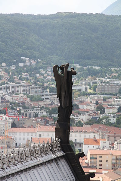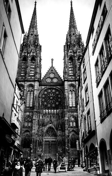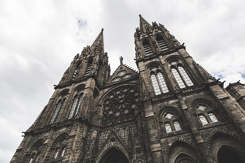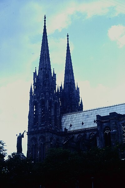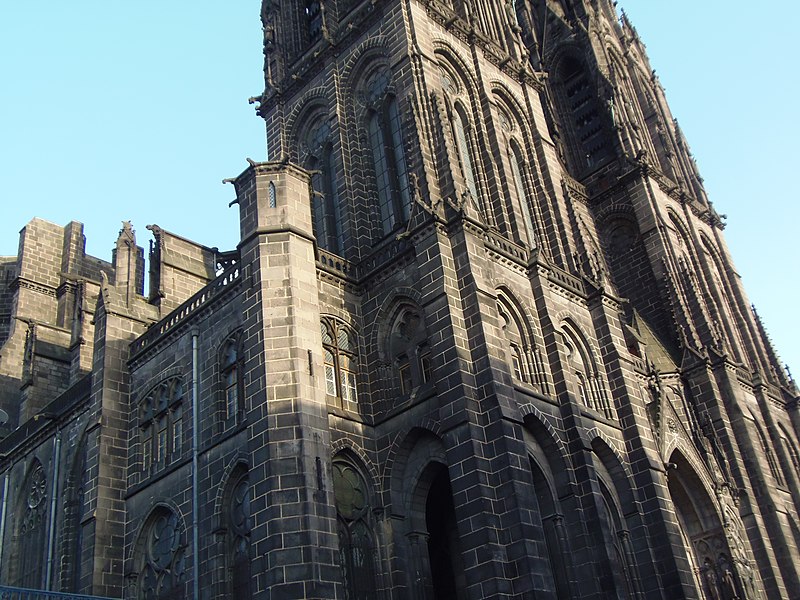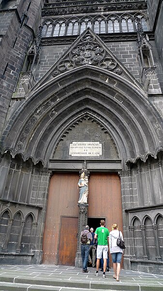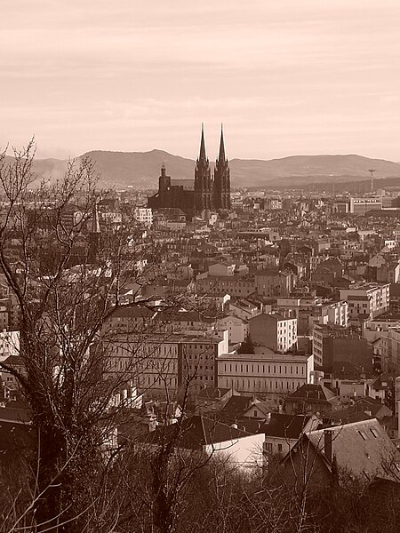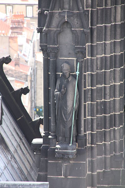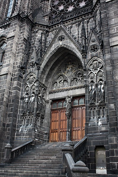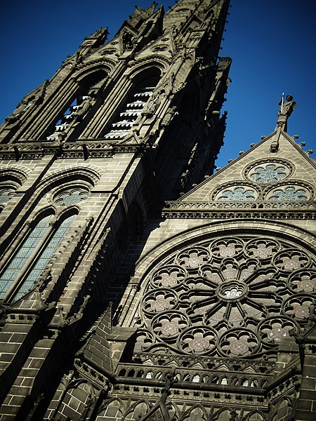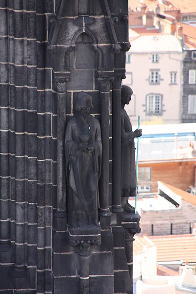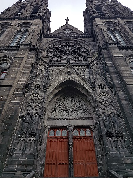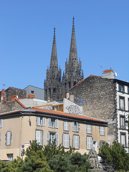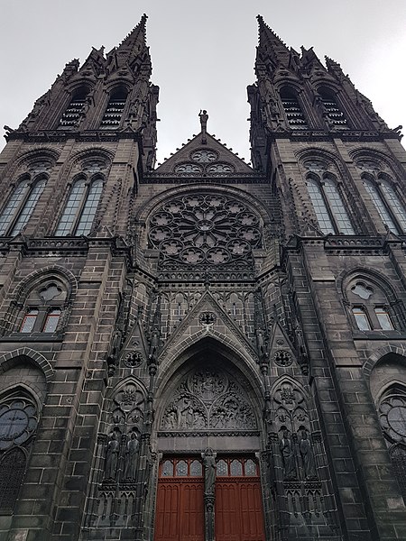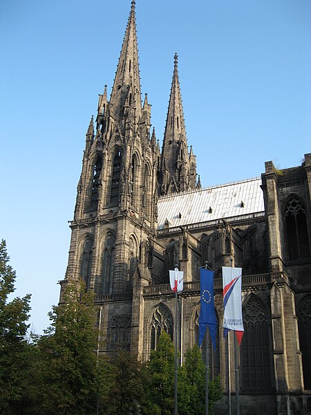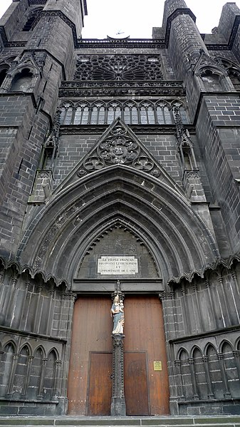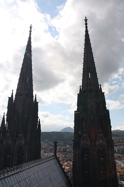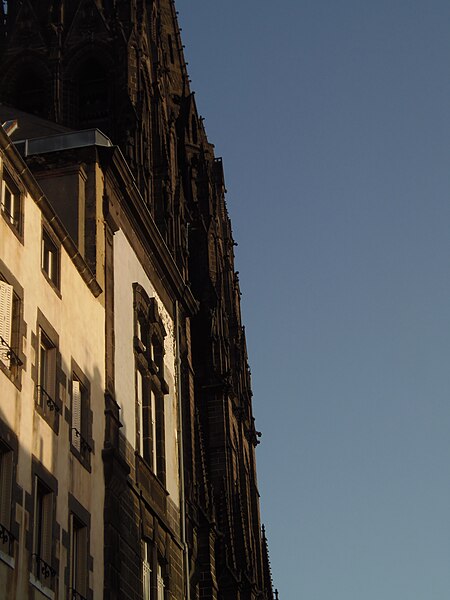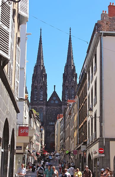 La cathédrale Notre-Dame-de-l'Assomption de Clermont-Ferrand est un édifice gothique, élevé à partir de 1248 au cœur de la ville et construit sur l'emplacement de successifs sanctuaires chrétiens, dont une cathédrale romane antérieure. Le premier édifice connu fut bâti au Ve siècle par l'évêque Namatius et dédié aux saints Vital et Agricol ; Grégoire de Tours en donne une description détaillée, indiquant un plan basilical richement orné et des dimensions précises. Le Ve siècle vit aussi l'activité de Sidoine Apollinaire et les défenses de la cité face aux Wisigoths ; la cathédrale primitive fut détruite puis restaurée à plusieurs reprises, notamment après des destructions attribuées à Pépin le Bref et aux raids normands, avant d'être reconstruite en style roman par l'évêque Étienne II. La cathédrale romane, consacrée à la Vierge, connut un grand rayonnement au haut Moyen Âge et enrichissements successifs, et sa crypte, découverte en 1885, conserve des vestiges mutilés mais permet de restituer un plan proche de l'an mil ; organisée autour d'une salle centrale à trois nefs et d'un chœur à niches, elle est bordée d'un déambulatoire où s'ouvrent quatre chapelles devenues funéraires, agrandies aux XIIe–XIIIe siècles, et contient un sarcophage antique en marbre blanc du IVe siècle. Au Xe siècle fut commandée à Clermont l'une des premières statues de la Vierge en majesté, reliquaire somptueux décrit dans le Codex Claromontanus, aujourd'hui détruit et fondu pendant la Révolution, mais connu par un dessin et un récit médiévaux. En 1248 l'évêque Hugues de la Tour lança la construction de la cathédrale gothique, inspirée par la Sainte-Chapelle ; le chantier fut conduit par Jean Deschamps qui introduisit des solutions originales d'élévation et d'éclairage et utilisa la pierre de Volvic, matériau sombre et résistant qui permit l'élancement des piliers et a valu à l'édifice le surnom de « cathédrale des charbonniers ». Jean Deschamps travailla notamment au chœur, dont la réalisation, peut-être aidée par des dons royaux, se rapproche stylistiquement des verrières de la Sainte-Chapelle ; le chœur, le transept et le début de la nef furent achevés vers la fin du XIIIe siècle, puis le chantier connut des ralentissements et des successions d'architectes jusqu'au milieu du XIVe siècle, période où la nef paraît achevée, tandis que les tours du transept et d'autres éléments furent progressivement édifiés. Sur la terrasse qui couronne le déambulatoire subsistent les épures de Jean Deschamps, dessins de chantier servant à la confection de gabarits pour la taille des pierres et utilisés pour diverses ouvertures et ornementations. La tour de la Bayette, unique témoignage des quatre tours d'origine, borde le portail nord et servit de beffroi et d'horloge ; haute d'environ 50 mètres, elle abrite une cloche de 1606 et fut le lieu d'expériences barométriques conduites par le conseiller Périer. Les XVe et XVIe siècles voient des compléments architecturaux et décoratifs, comme des roses du XIVe siècle et des terrasses ornées d'arcs-boutants, tandis que des aléas tels qu'un tremblement de terre en 1490 et les troubles de la guerre de Cent Ans perturbèrent les travaux. Pendant la Révolution la cathédrale faillit être détruite ; malgré des dégradations importantes en 1790–1793 et la disparition de mobilier, un bénédictin parvint à convaincre les autorités de la préserver comme lieu de rassemblement ; trois tours des transepts furent rasées et plusieurs éléments furent dispersés, le jubé gothique ayant été réutilisé dans une maison de la ville. Au XIXe siècle la façade romane d'Étienne II fut abattue et, après le classement en 1862, d'importants travaux d'achèvement et de restauration furent entrepris à partir de 1866 sous la direction d'Anatole de Baudot d'après les plans de Viollet-le-Duc ; la façade occidentale avec ses flèches et la dernière travée de la nef furent achevées en 1884 selon les méthodes médiévales, et l'intérieur fut peint en faux appareil. Une découverte remarquable en 2013 a mis au jour une baie du XVe siècle aux voussures dorées et à la polychromie conservée ; sa fouille et sa restauration en 2013–2014 ont permis de préserver dorures et décors peints et d'interroger la fonction de l'ouverture, liée à la sacristie et peut‑être au trésor ou à la surveillance des pèlerins. Protégée au titre des monuments historiques depuis 1862, la cathédrale présente des dimensions notables : longueur totale 99 m, chœur 36 m, longueur de la nef et du transept 46,75 m, largeur du transept 32,70 m, hauteur de la croisée 28,70 m, hauteur des bas-côtés 14,30 m, hauteur de la tour de la Bayette 50,70 m et hauteurs des flèches d'environ 96,10 m et 95,50 m. La cathédrale conserve une riche collection de vitraux médiévaux, organisée en quatre ensembles datés du XIIIe au XVIe siècle ; les verrières anciennes du déambulatoire, contemporaines de l'achèvement du chantier gothique, présentent des panneaux formant des médaillons narratifs et témoignent d'influences parisiennes et de dons princiers, tandis que d'autres baies intègrent des fragments plus anciens de la période romane ; l'ensemble a subi des dégradations au XIXe siècle puis des campagnes de restauration au XIXe siècle, entre 1900 et 1930 et dans les années 1976–1977. La cathédrale abrite également un précieux ensemble de peintures murales et de fresques du XIIe au XVe siècle : les peintures de la crypte, antérieures au chantier gothique, offrent des scènes de la vie de la Vierge et du Christ dans une facture proche de l'art roman ; la grande fresque de la sacristie représente un Calvaire richement symbolique, daté par les spécialistes des environs de 1270–1280, et d'autres peintures du déambulatoire et de chapelles illustrent des thèmes funéraires, martyriaux et 