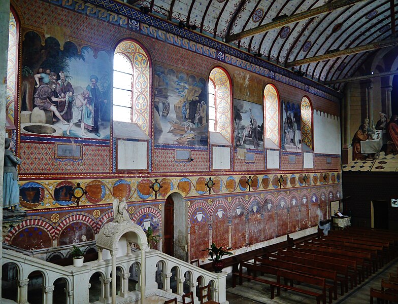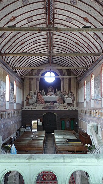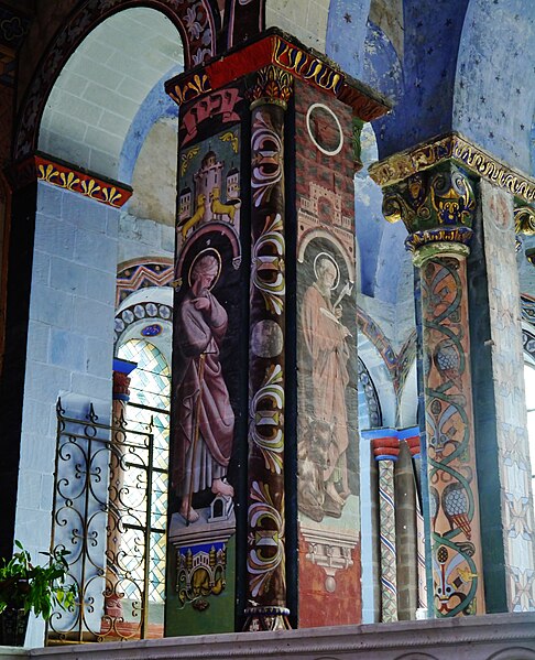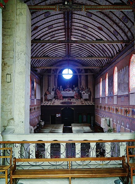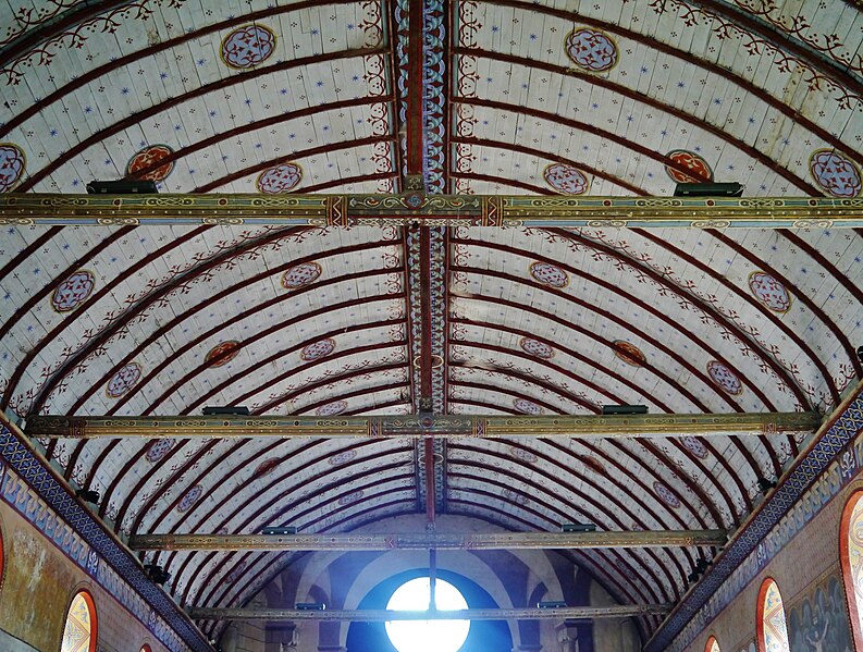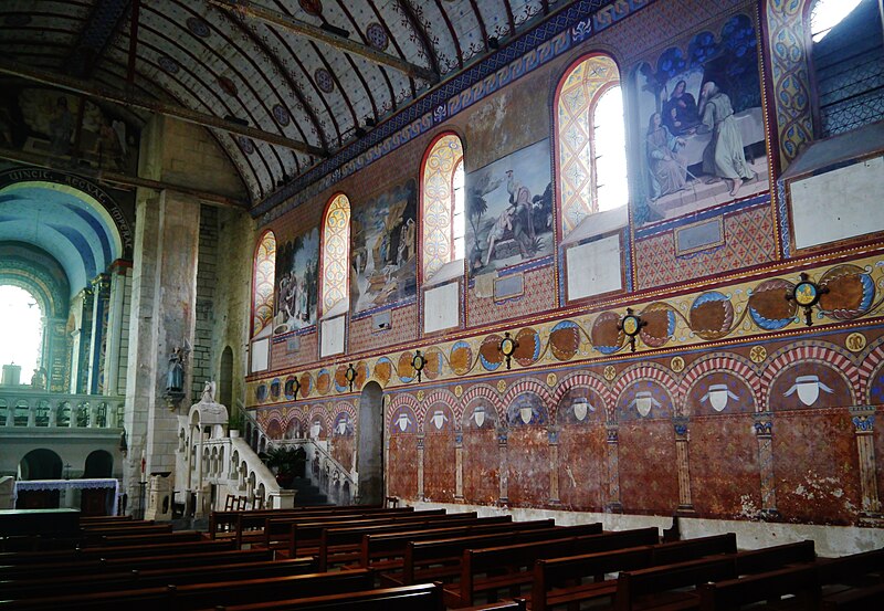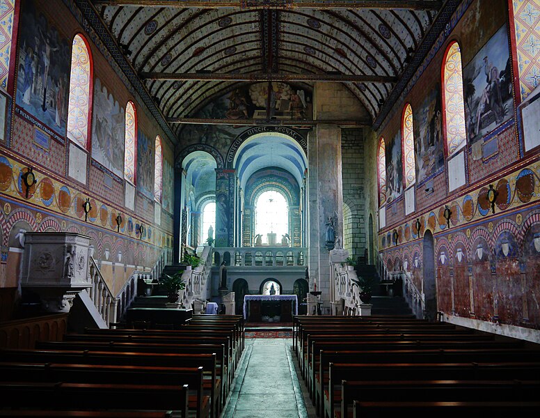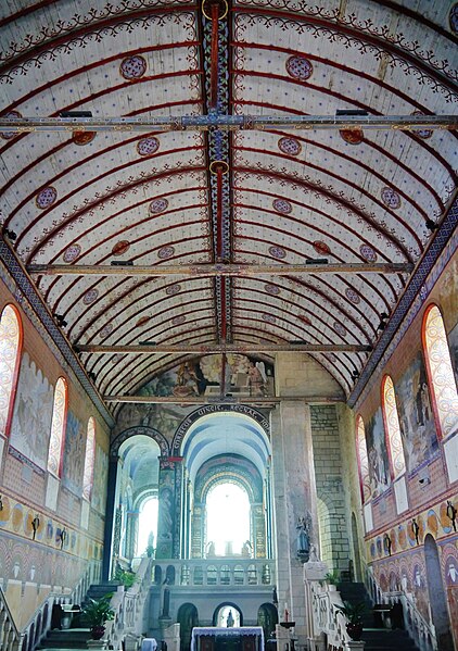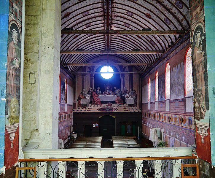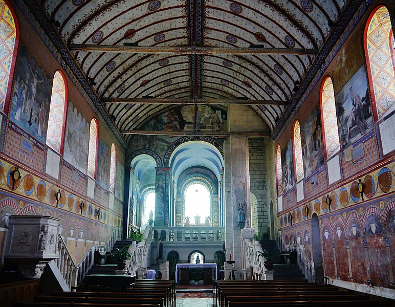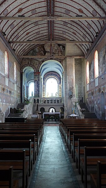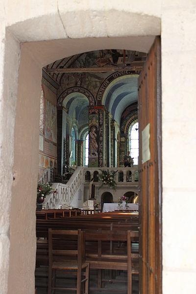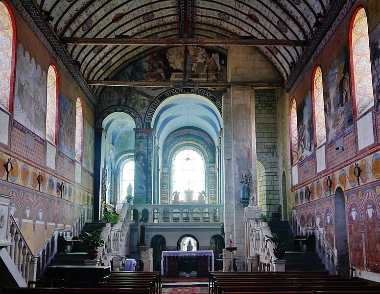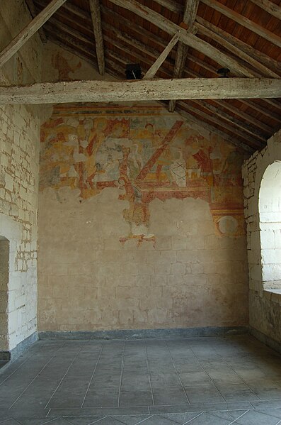 L'édifice conserve un chevet plat et une abside rectangulaire datés de la fin du XIe siècle ; la nef unique était autrefois plus étendue vers l'ouest. La nef est voûtée en berceau en bois, tandis que le chœur est couvert de voûtes d'ogives et repose légèrement surélevé au-dessus d'une crypte. Cette crypte, située sous le chœur, présente des traces de peintures médiévales. Des peintures murales anciennes subsistent à l'angle occidental du mur sud et sur le mur nord, sous l'appentis ajouté au portail. Les fonts baptismaux sont conservés dans un sarcophage. La façade occidentale est marquée par le porche couvert en appentis et l'ensemble conserve des éléments architecturaux et décoratifs visibles dans la médiathèque de l'architecture et du patrimoine.