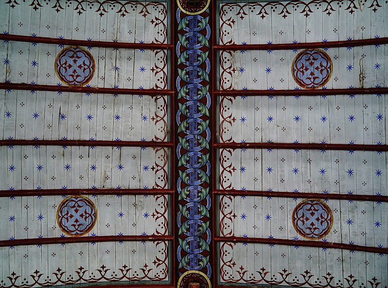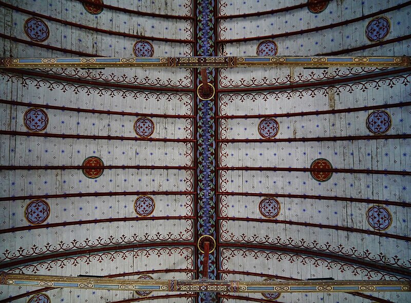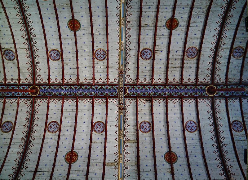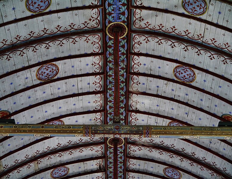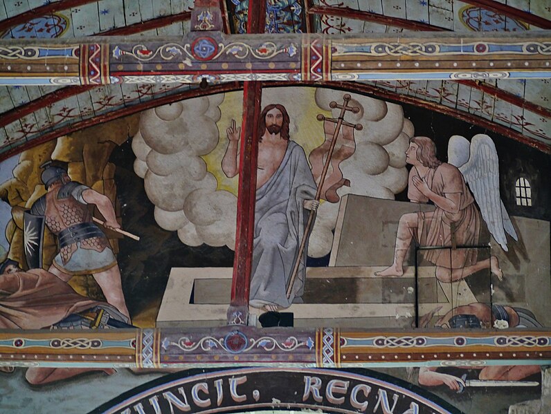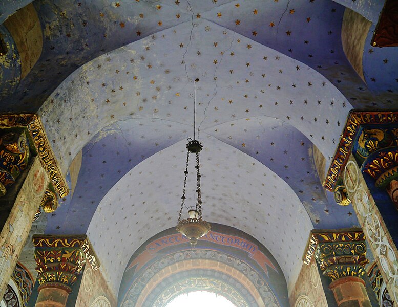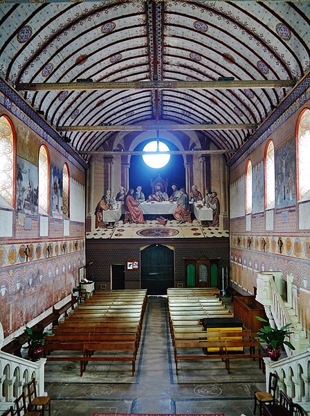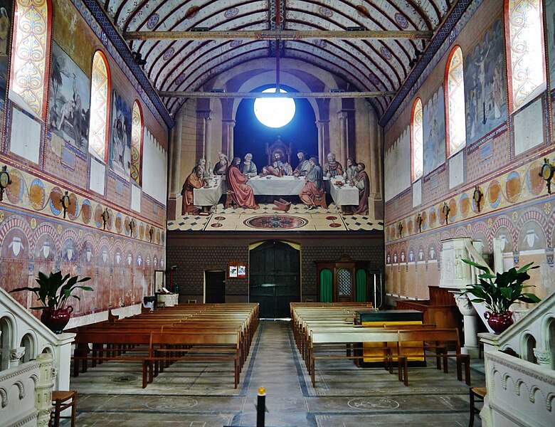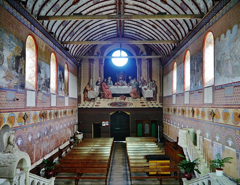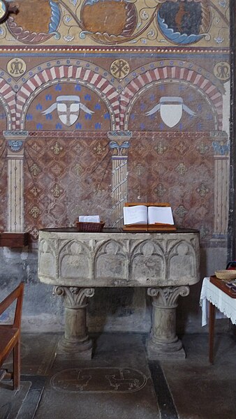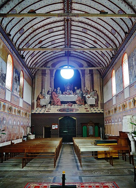 L'édifice conserve un chevet plat et une abside rectangulaire datés de la fin du XIe siècle ; la nef unique était autrefois plus étendue vers l'ouest. La nef est voûtée en berceau en bois, tandis que le chœur est couvert de voûtes d'ogives et repose légèrement surélevé au-dessus d'une crypte. Cette crypte, située sous le chœur, présente des traces de peintures médiévales. Des peintures murales anciennes subsistent à l'angle occidental du mur sud et sur le mur nord, sous l'appentis ajouté au portail. Les fonts baptismaux sont conservés dans un sarcophage. La façade occidentale est marquée par le porche couvert en appentis et l'ensemble conserve des éléments architecturaux et décoratifs visibles dans la médiathèque de l'architecture et du patrimoine.