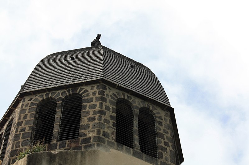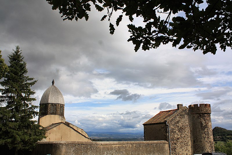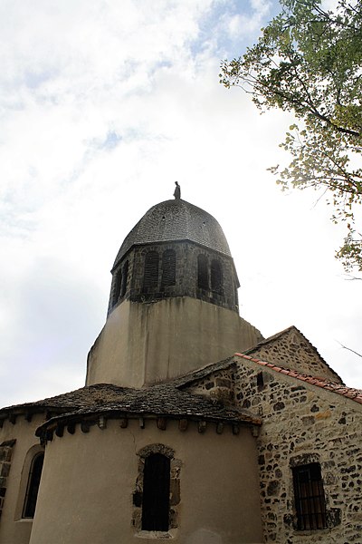L'église Notre-Dame de Ronzières, également appelée église Saint-Baudime, domine le village de Ronzières, situé entre les monts Dore et la Limagne d'Issoire dans le Puy-de-Dôme. Un premier oratoire élevé sur le plateau fut consacré à saint Baudime, qui, selon la légende, débarrassa la contrée d'un monstre ; il avait dédié à la Vierge une fontaine qui devint un lieu de pèlerinage. L'emplacement de cette fontaine étant jugé peu propice à l'implantation d'un sanctuaire, on construisit un baptistère au pied de la butte ; ce bâtiment devint ensuite l'église paroissiale, puis fut délaissé au profit de l'église Notre-Dame au XVIIIe siècle. L'édifice actuel a été établi à l'époque romane sur l'emplacement de la chapelle dédiée à saint Baudime et conserve des éléments romanes au milieu d'adjonctions gothiques. Au début de l'automne 1472, Jacquette Brun du Peschin, veuve de Bertrand de La Tour d'Auvergne, institua dans l'église une messe annuelle célébrée le lendemain de l'Assomption en l'honneur de la Vierge. L'église possédait jadis un clocher pyramidal qui fut détruit vers 1813 ou 1814 et remplacé à la même époque par le clocher actuel. L'inscription de l'édifice au titre des monuments historiques date de 1962. Les vues de l'ensemble montrent notamment le clocher, le chevet et l'église en relation avec une tour du château voisine.
