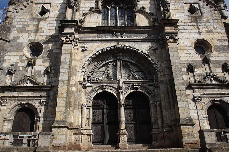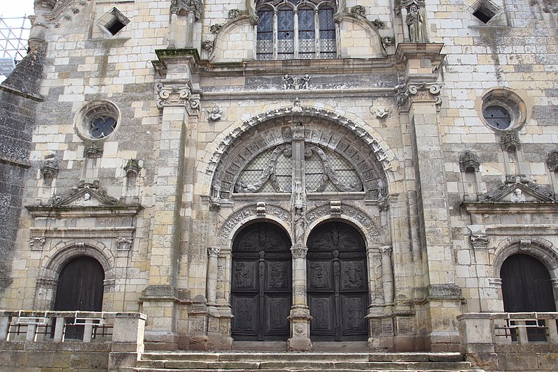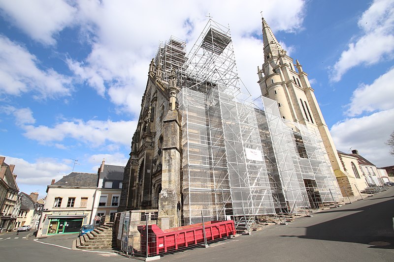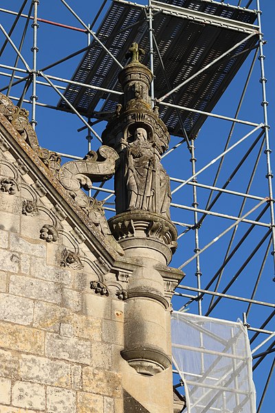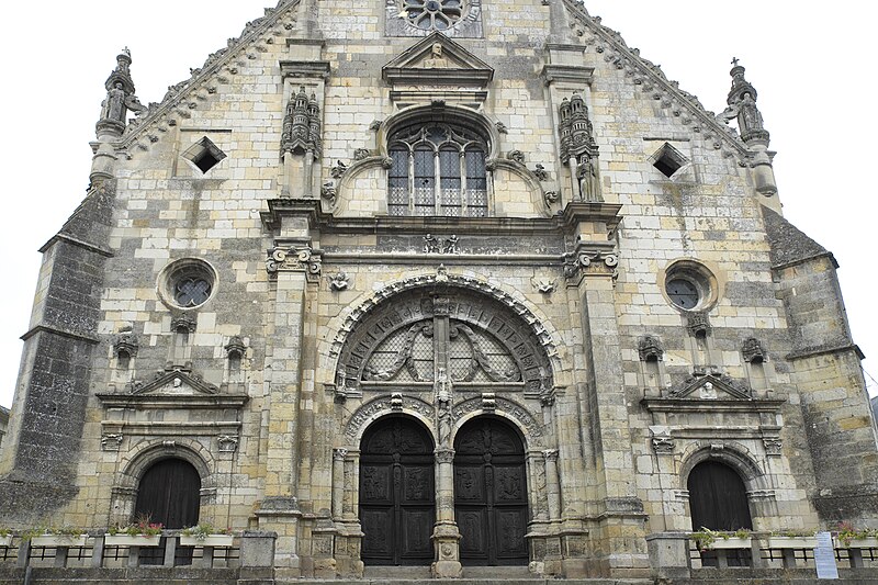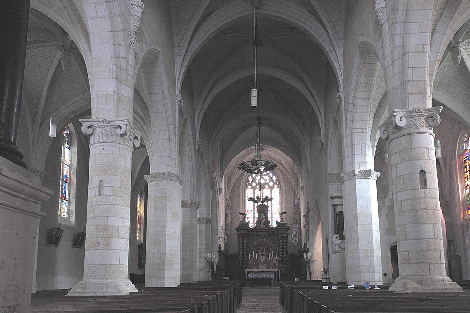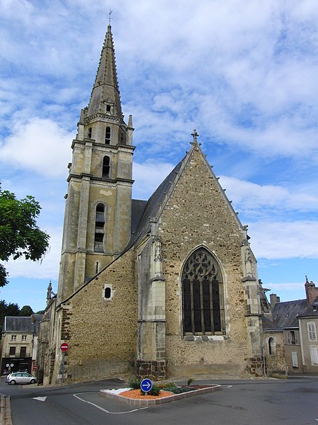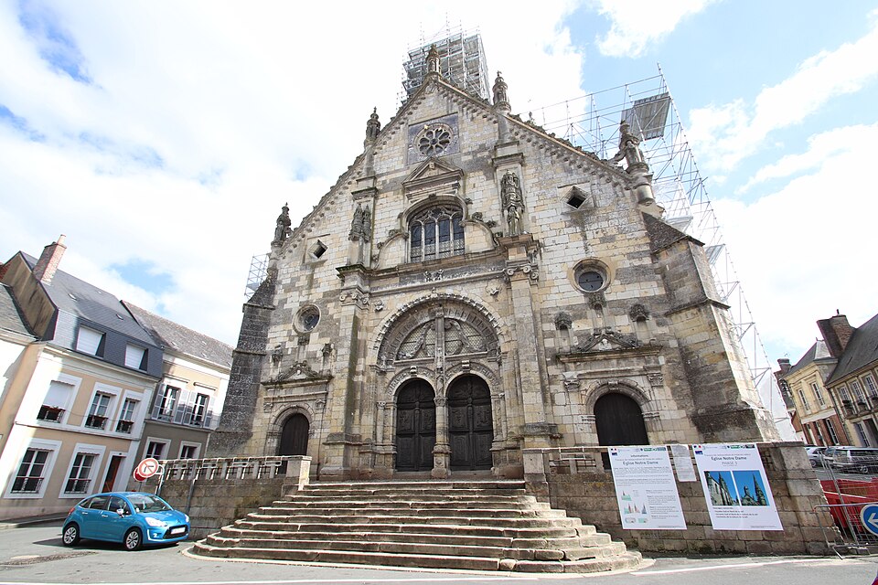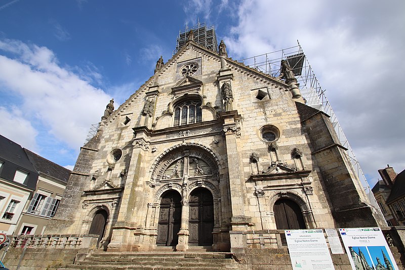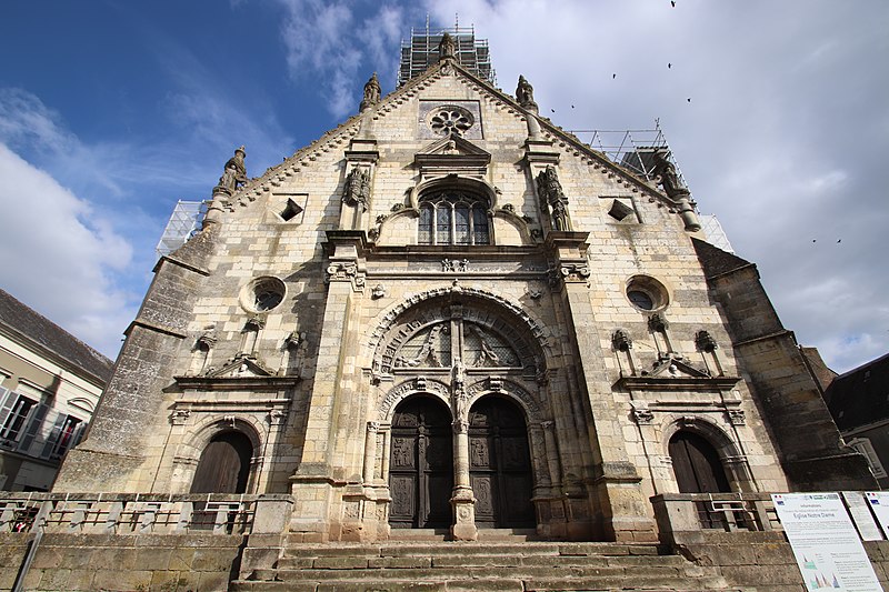 L’église Notre‑Dame de Saint‑Calais, située dans la Sarthe, date essentiellement des XVe et XVIe siècles et a été classée au titre des monuments historiques par la liste de 1840. Avant le XIIIe siècle, la paroisse semblait ne pas disposer d’une église propre et utilisait l’église abbatiale de l’abbaye de Saint‑Calais, fondée sous Childebert Ier au cours du haut Moyen Âge. Grégoire de Tours mentionne l’abbaye et la vie des premiers abbés est conservée dans les recueils hagiographiques qui évoquent saint Calais et saint Siviard ; un acte tardif prétend une donation datant de 515. La première église paroissiale était modeste, en bois, et le curé était nommé par l’abbé. La construction de l’édifice actuel commence à la fin du XVe siècle avec le chœur et les deux dernières travées de la nef, de style gothique, voûtées d’ogives triangulaires à clés simples retombant sur des piles octogonales. En 1518 on refait partiellement le pignon du chevet et on agrandit la fenêtre ; les trois premières travées du bas‑côté nord sont alors construites et achevées en 1520, suivies de l’extension de la nef et du collatéral sud. La façade est engagée à partir de 1522 ; des dates sculptées de 1540 et 1549 figurent sur le pignon. Les portes anciennes du portail central, en bois, conservent quatre scènes de la vie de la Vierge encadrées par une guirlande et portent les initiales M.G.L.H., attribuées à un maître menuisier, peut‑être Guillaume Le Houx, qui aurait également été l’auteur d’un banc d’œuvre aujourd’hui supprimé. Une sacristie est ajoutée au nord du chœur en 1592 et, en 1615, un oculus recevant une horloge du maître horloger du Mans Guillaume Pelard est percé dans le pignon ; l’horloge a probablement été modifiée en 1769. Le clocher, placé au droit de la cinquième travée du bas‑côté sud et commencé lors de la première campagne, abritait la chapelle de la sonnerie ornée au XVe siècle de peintures de l’Annonciation ; il communique avec la chapelle Notre‑Dame‑du‑Rosaire, établie autour de 1612 à l’initiative du curé frère Jean Girard et achevée par le maître maçon Gervais Billot, sur un plan carré de 5,80 m et voûtée d’une coupole surbaissée. La construction du clocher a été interrompue lors des guerres de religion et de l’incendie de l’abbaye en 1562, reprise en 1619 et parachevée en 1623 ; l’étage octogonal et la flèche ont été remaniés en 1667, au XVIIIe siècle et en 1893, la base ayant été refaite en 1889. Pendant la Révolution le mobilier de trésor fut détruit ou confisqué, mais l’édifice échappa aux dégradations ; après le Concordat de 1801 l’église fut rendue au culte et l’intérieur badigeonné. La façade en tuffeau a fait l’objet d’une restauration en 1841, Prosper Mérimée déclina une aide une dizaine d’années plus tard, et plusieurs campagnes de restauration ont eu lieu en 1880, 1891, 1893, 1919, 1922, puis une restauration de quatre ans, achevée et inaugurée le 29 février 2020, pour un montant de 2,2 millions d’euros. L’église présente une nef de cinq travées et un chœur de deux travées sans fenêtres latérales, terminé par un chevet plat, avec des bas‑côtés qui longent la nef et la première travée du chœur. Les trois premières travées de la nef et des collatéraux, construites après 1518, sont gothiques : les voûtes d’ogives à liernes possèdent des clés pendantes et retombent sur des piles rondes coiffées de chapiteaux d’inspiration ionique, et la décoration reprend des motifs italiens ; la façade est de style Renaissance. L’orgue est classé au titre des objets ; son buffet date du XVIIe siècle et a été classé en 1971, tandis que la partie instrumentale, réalisée en 1845 par la maison Daublaine‑Callinet, a été classée en 1973. Les vitraux comprennent notamment un carton d’Henri‑Marcel Magne représentant l’archevêque Louis Dubois présenté par saint Louis, ainsi que des verrières signées Hucher, probablement Ferdinand Hucher, datées de 1894 et représentant notamment sainte Lucie, saint Laurent et la Vierge du Rosaire avec saint Dominique et sainte Catherine de Sienne. Le suaire de Saint‑Calais est un tissu d’origine sassanide représentant une scène persane avec un arbre de vie stylisé ; le fond est bleu foncé et le dessin ocre jaune. Il enveloppait depuis 1171 des reliques de saint Calais et de saint Besorius et, selon un document de 1653, ces reliques furent alors conservées dans la chapelle du château de Blois ; les reliques transférées en 1792 à l’église de Saint‑Calais furent placées dans une châsse, dans laquelle un tissu a été retrouvé lors d’une ouverture en 1947, ce qui permet de supposer que le suaire primitif avait été découpé pour être réparti avec les reliques.