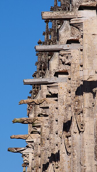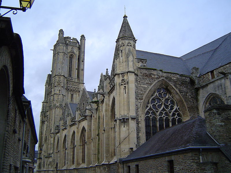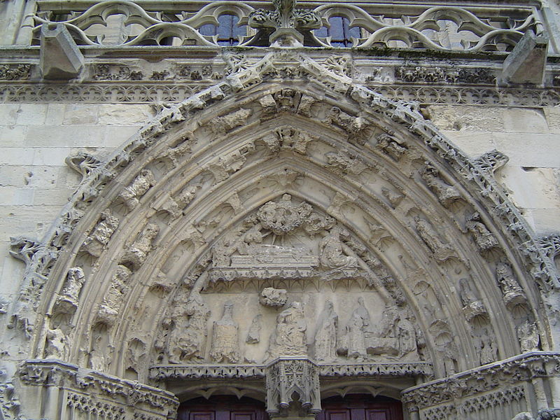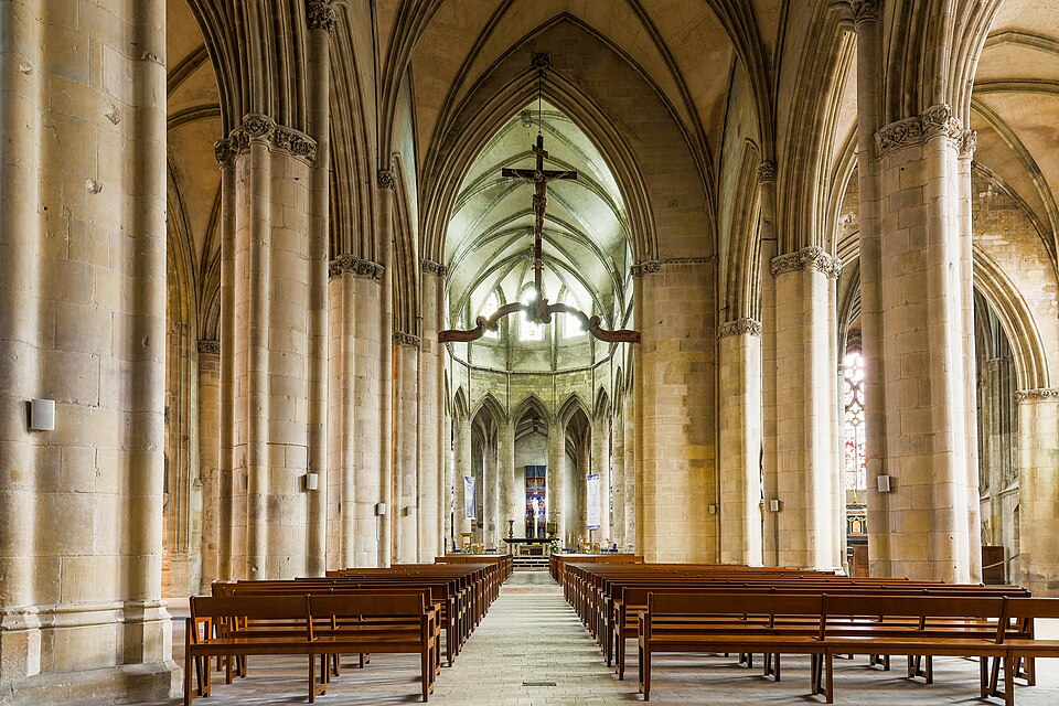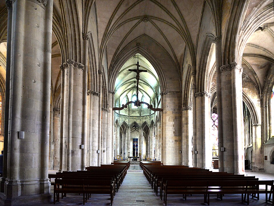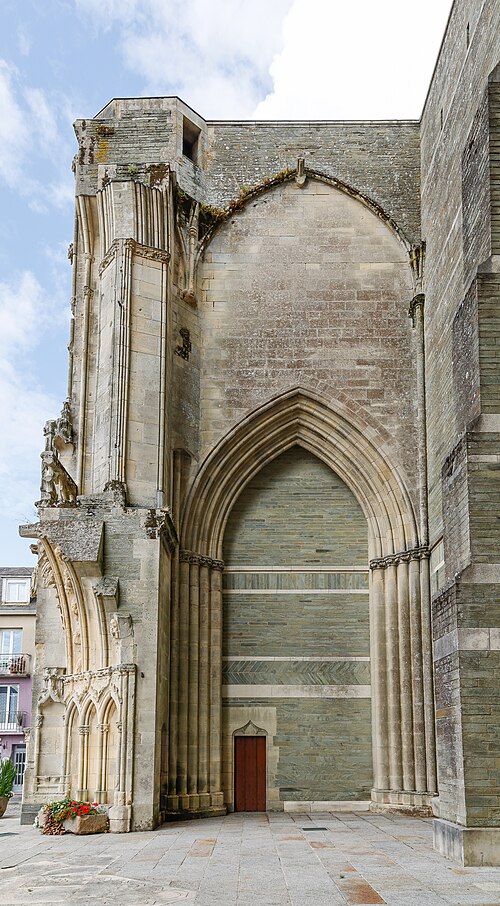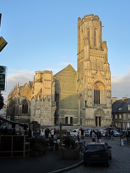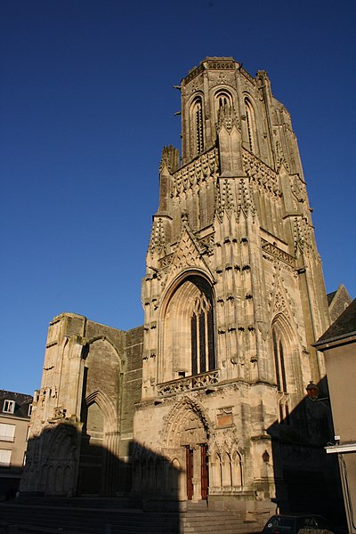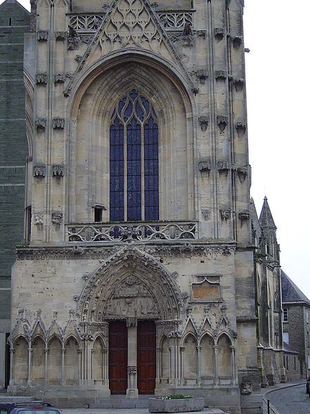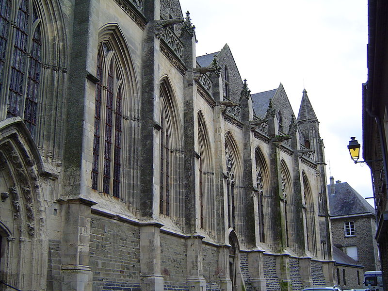 Sur le plan architectural, l'église est dépourvue de transept et sa construction s'est étalée du XIIIe au XVIIe siècle. La nef, de cinq travées barlongues, et ses bas-côtés immédiats furent réalisés entre 1400 et 1420 ; les chapiteaux présentent des corbeilles de feuillage caractéristiques de l'époque. La tour nord remonte à la fin du XIIIe siècle, la tour sud et le portail furent « encommencés à édifier » en 1464 et le chevet date du XVe siècle ; le chœur, reconstruit entre 1480 et 1510, compte quatre travées et le sanctuaire est fermé par six colonnes. Le second collatéral nord du chœur, achevé en 1543‑1544, est de style gothique ; c'est à l'évêque Geoffroy Herbert qu'est attribuée la construction du chœur à double déambulatoire. Les flèches qui couronnent les tours datent du XVIIe siècle (celle du sud de 1630, celle du nord de 1684), conférant à l'édifice un aspect proche de la cathédrale qui fut longtemps une fierté locale. Parmi les éléments pittoresques, on relève des gargouilles sculptées à l'extérieur et une petite chaire à prêcher gothique, appuyée sur la façade nord, décrite par Victor Hugo et utilisée pour haranguer les foules ; elle présente une cuve à cinq panneaux flamboyants surmontée d'une flèche ornée de crochets en forme de feuilles de fougère.