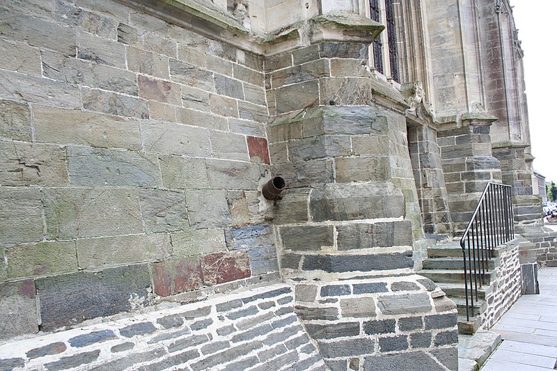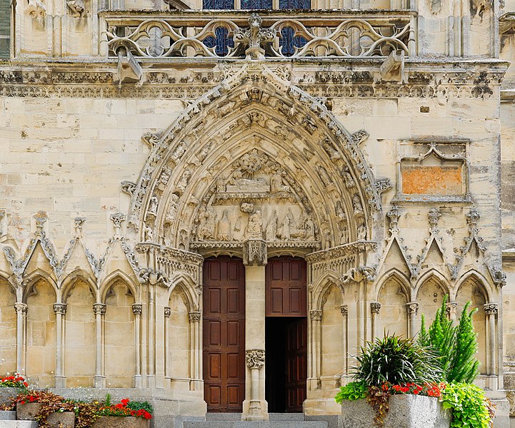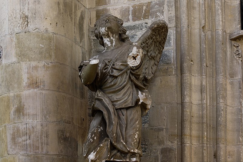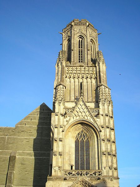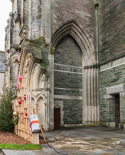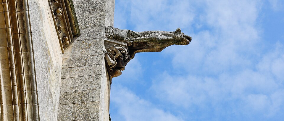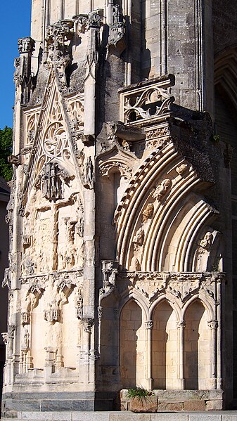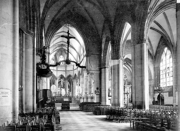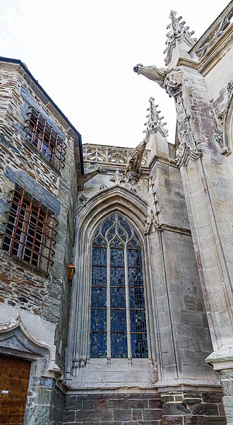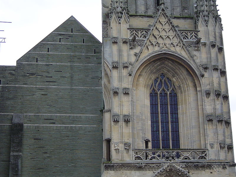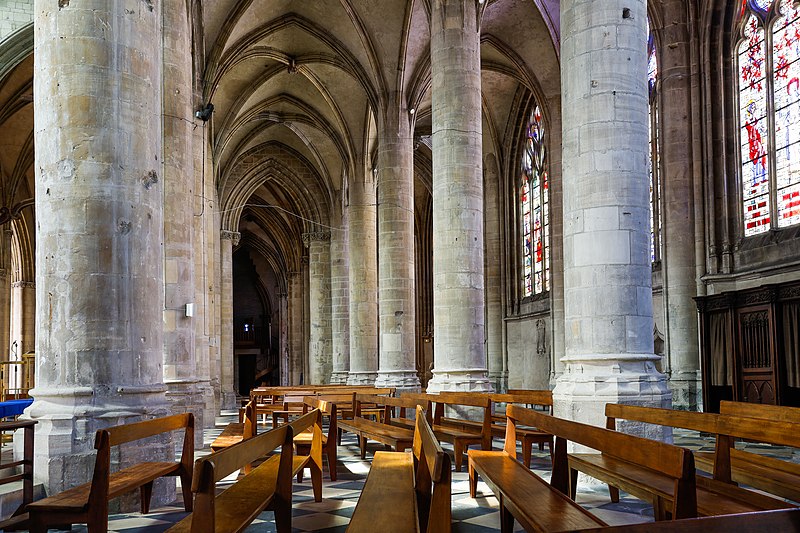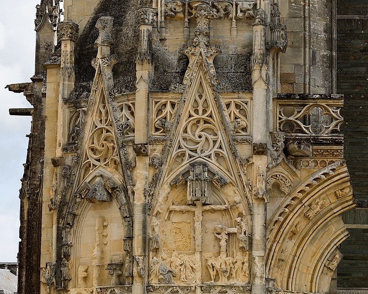 Sur le plan architectural, l'église est dépourvue de transept et sa construction s'est étalée du XIIIe au XVIIe siècle. La nef, de cinq travées barlongues, et ses bas-côtés immédiats furent réalisés entre 1400 et 1420 ; les chapiteaux présentent des corbeilles de feuillage caractéristiques de l'époque. La tour nord remonte à la fin du XIIIe siècle, la tour sud et le portail furent « encommencés à édifier » en 1464 et le chevet date du XVe siècle ; le chœur, reconstruit entre 1480 et 1510, compte quatre travées et le sanctuaire est fermé par six colonnes. Le second collatéral nord du chœur, achevé en 1543‑1544, est de style gothique ; c'est à l'évêque Geoffroy Herbert qu'est attribuée la construction du chœur à double déambulatoire. Les flèches qui couronnent les tours datent du XVIIe siècle (celle du sud de 1630, celle du nord de 1684), conférant à l'édifice un aspect proche de la cathédrale qui fut longtemps une fierté locale. Parmi les éléments pittoresques, on relève des gargouilles sculptées à l'extérieur et une petite chaire à prêcher gothique, appuyée sur la façade nord, décrite par Victor Hugo et utilisée pour haranguer les foules ; elle présente une cuve à cinq panneaux flamboyants surmontée d'une flèche ornée de crochets en forme de feuilles de fougère.