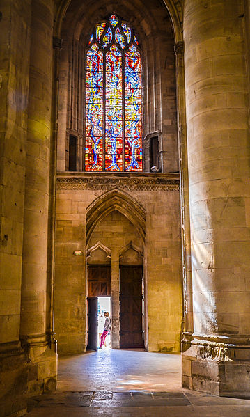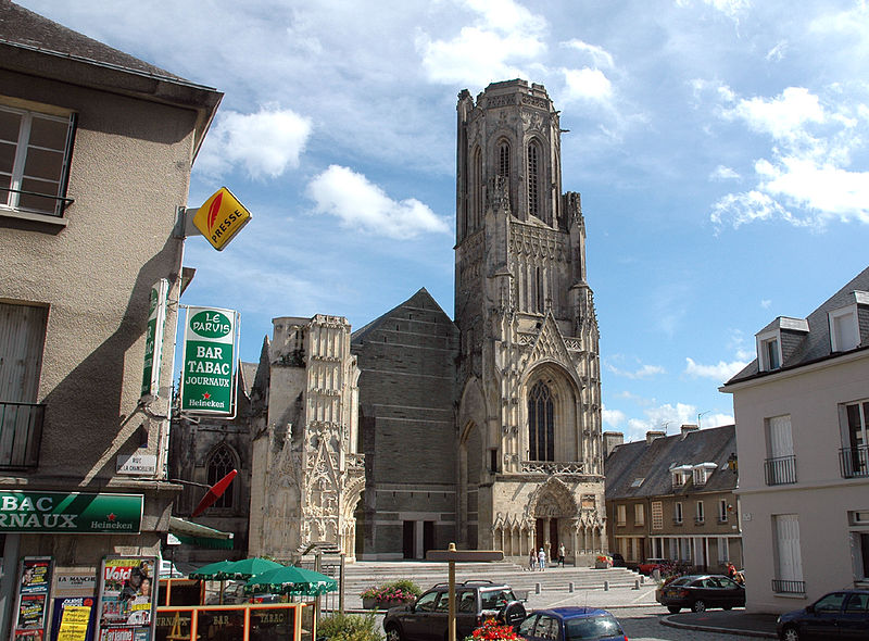 Les vitraux anciens, datés des XVe–XVIe siècles et déposés pendant les bombardements, représentent notamment saint Louis, saint Rémi, saint Denis, sainte Geneviève, l'Assomption, les quatre Évangélistes, saint Crépin et saint Crépinien et saint Yves ; ils sont classés au titre des immeubles en 1840 et un exemplaire est exposé au musée d'art et d'histoire de Saint-Lô. Le vitrail dit royal, attribué par la tradition à un don de Louis XI vers 1470, montre le Couronnement de la Vierge et l'histoire de saint Crépin et saint Crépinien, tandis qu'un vitrail du XVIe siècle représente le martyre de saint Jean.