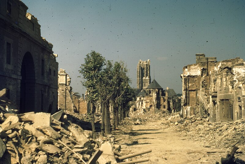 Après les combats de juillet 1944, l'église fut détruite à près de 50 % : la nef perdit sa couverture et ses voûtes, la façade occidentale s'effondra après le bombardement de la tour nord, tandis que la tour sud, dépourvue de sa flèche, le chœur et les bas-côtés subsistèrent en grande partie. La restauration, menée entre 1944 et 1974, fut longue et marquée par un changement de parti pris : initialement prévu à l'identique par l'architecte Louis Barbier, le projet fut remplacé en 1947 par celui d'Yves‑Marie Froidevaux, qui proposa de conserver la ruine de la façade ouest comme mémorial. Malgré des oppositions, le conseil municipal finit par approuver ce principe pour des raisons financières et d'épuisement des débats ; un pignon aveugle en schiste vert du Nord-Cotentin fut construit en retrait de la façade disparue et le chantier, retardé par des difficultés de taille de pierre, s'acheva en 1972 avec l'installation de trois portes historiées en bronze. L'église reçut une nouvelle dédicace pour le 30e anniversaire de la Libération ; en 1994, une toile provisoire peinte par Bruno Dufour‑Coppolani fut dressée à l'emplacement de la façade disparue et l'intérieur fut restauré avec grand soin. La statue de Notre-Dame du Pilier, pulvérisée lors des destructions, a été reconstituée et replacée au fond du sanctuaire. La restitution à l'identique de l'ancienne façade à deux tours et flèches, souhaitée par certains habitants, n'est pas envisagée actuellement. Le bourdon en bronze, fondu en 1732, porte des fêlures provoquées par sa chute lors de l'incendie de la Libération.