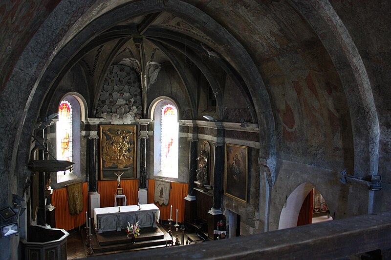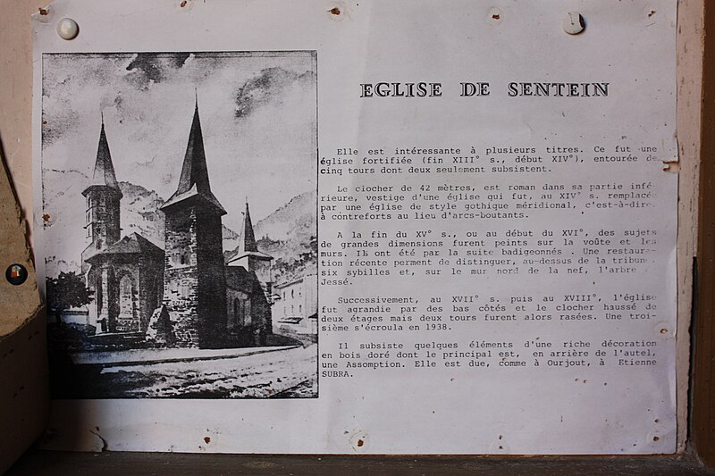 L'église Notre‑Dame de Sentein, en Ariège (Occitanie), se situe au centre du village, chef‑lieu de la vallée du Biros, à 734 m d'altitude, près de la frontière espagnole (Val d'Aran). De l'enceinte fortifiée du XIIIe siècle ne subsistent que deux tours quadrangulaires sur les cinq qui la flanquaient ; cette enceinte ne comportait qu'une entrée, s'ouvrant sur la tour nord. Le clocher est le dernier vestige de l'ancienne église du XIIe siècle : sa partie basse, carrée, comprend deux étages carrés puis passe à un étage octogonal couronné d'un bandeau à huit gargouilles, qui semble marquer l'arrêt de la construction primitive. L'étage octogonal pourrait dater du XIIIe siècle ; les deux derniers étages du clocher sont du XVIIIe siècle. D'inspiration romane pour le clocher, l'édifice a été remanié aux XIVe–XVe siècles et abrite des fresques gothiques des XVe–XVIe siècles. Des peintures murales datées du début du XVIe siècle ont été découvertes en mai 1966. L'église, les amorces d'enceinte et les deux tours subsistantes sont classées au titre des monuments historiques par arrêté du 20 octobre 1906. À l'intérieur, la peinture monumentale des voûtes de la nef date du XVIe siècle. Le chœur présente un maître‑autel en marbre blanc, soutenu par quatre colonnes en marbre rose ; la façade de l'autel représente trois scènes : à gauche les apparitions de Notre‑Dame de la Salette, au centre l'Assomption de Marie ou l'Immaculée Conception, et à droite les apparitions de Notre‑Dame de Lourdes. Sur l'abside se trouve un retable en bas‑relief de l'Assomption de Marie, inscrit à l'inventaire des monuments historiques. Les peintures et de nombreux objets du mobilier sont référencés dans la base Palissy. Parmi les éléments remarquables figurent le clocher, le chœur (avec la chaire à gauche) et la peinture monumentale des voûtes de la nef où apparaît l'arbre de Jessé. L'Association de sauvegarde de l'église de Sentein, créée en 2002, veille sur l'édifice et organise concerts et expositions. Bibliographie : Baron de Bardiès, "Enceinte fortifiée de Sentein" (1905) ; Roger Tort, "Les peintures murales de l’église paroissiale de Sentein" (1969).