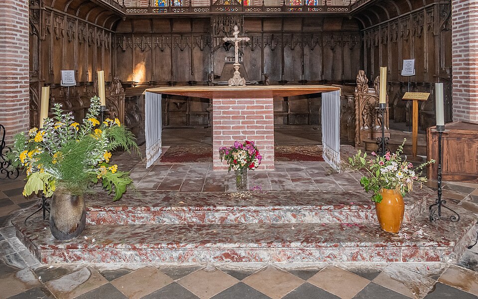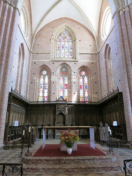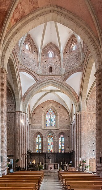 L'édifice suit un plan en croix latine avec une nef, une coupole à la croisée du transept et un chœur voûté. Les verrières les plus anciennes, offertes en 1357 par Bernard de Lafite, ornent la baie supérieure du chevet et représentent notamment une Crucifixion et, au registre inférieur, une Vierge à l'Enfant accompagnée de saint Benoît et de saint Cérats ; d'autres vitraux des XVe et XVIe siècles proviennent de l'école d'Auch. Les stalles, au nombre de trente-huit et disposées en deux rangées, ont été offertes par Jean Marre, transférées au chœur en 1780 ; leurs miséricordes et panneaux sculptés illustrent des scènes bibliques et hagiographiques, et les panneaux de la stalle abbatiale représentent des épisodes du Baptême.