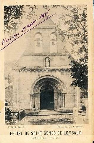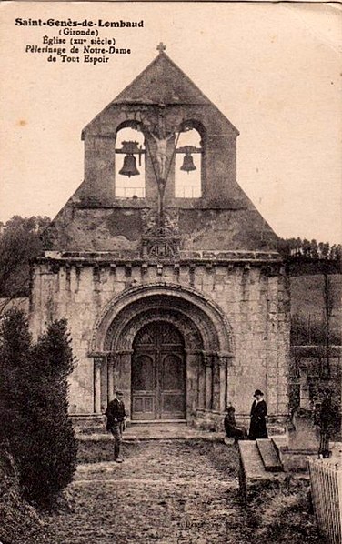 L'église Notre-Dame-de-Tout-Espoir, située à Saint-Genès-de-Lombaud (Gironde), est un édifice de fondation romane installé sur des vestiges gallo-romains, où des fouilles ont livré des fragments de mosaïques, des tuiles et un petit autel votif. Le mur sud de la nef et une partie basse de la façade remontent au XIe siècle ; la nef et le chœur ont été reconstruits au XIIe siècle, époque à laquelle le portail a été aménagé et l'église est devenue un lieu de pèlerinage à la Vierge noire. Le chœur à chevet plat, appareillé en pierres de taille romanes, présente une voûte d'ogives relevant des premières expérimentations gothiques ; les supports de ces voûtes indiquent une construction de la fin du XIIe siècle. La charpente actuelle est datée du XVIe siècle. La datation du bas-côté nord varie selon les sources : il est parfois attribué au XIIIe siècle, tandis que d'autres notices le rattachent à un agrandissement postérieur au XVIe siècle. Une porte sud a été percée au XVIIe siècle et une sacristie a été ajoutée au XVIIIe siècle. Le clocher-mur à deux baies est d'époque plus récente et pourrait remplacer un dispositif antérieur. L'ensemble a été restauré au début du quatrième quart du XIXe siècle et classé au titre des monuments historiques par arrêté du 8 juillet 2004. Implantée sur une forte pente, l'église présente une grande différence de niveau entre le portail et le sol de la nef, accessible par un escalier de quinze marches, et son axe est orienté du sud‑est (chevet) au nord‑ouest (portail) plutôt que d'est à ouest.