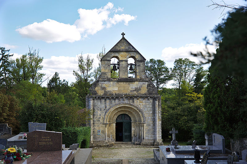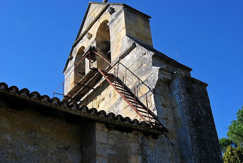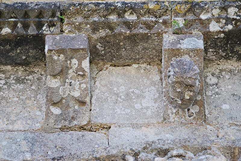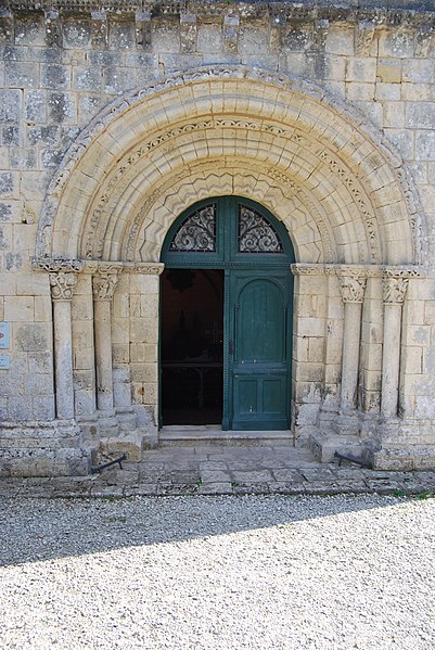 Parmi les chapiteaux du portail, le premier raconte une saynète à trois personnages opposant le vieux libidineux et l'avare jeune, la moralité étant soulignée par le contraste des gestes et des attributs ; le second présente une corbeille végétale au style proche de celui de l'abbatiale Sainte‑Croix de Bordeaux. Sur le chapiteau sud, une paire de félins en ébats transpose symboliquement l'acte d'accouplement pour inviter à la réflexion sur la pulsion ; un autre chapiteau figure une femme allaitant deux serpents, image de la luxure féminine souvent reprise dans l'iconographie romane. Les voussures du portail sont décorées de bâtons brisés, de fleurs à quatre pétales, de dents de loup et d'entrelacs, tandis que l'archivolte rassemble vingt personnages et animaux organisés en plusieurs séquences : musiciens et danseuse, porteurs de poissons — interprétés comme pécheurs repentants — et une scène de chasse opposant lièvre, chiens et autres animaux, jusqu'au chasseur soufflant dans son cor.