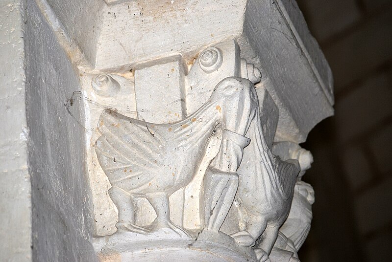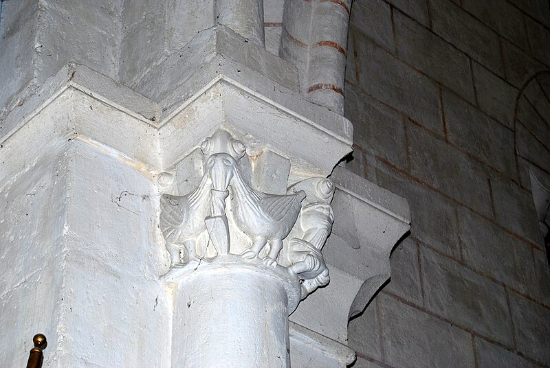 Les chapiteaux de l'arc triomphal transmettent des avertissements moraux : le chapiteau nord montre des oiseaux plongeant dans un calice et une figure cléricale dégradante, mise en garde contre la « communion sacrilège », tandis que le chapiteau sud met en scène une farandole où danseurs et monstres illustrent l'idée que la danse conduit au péché.