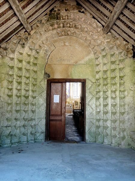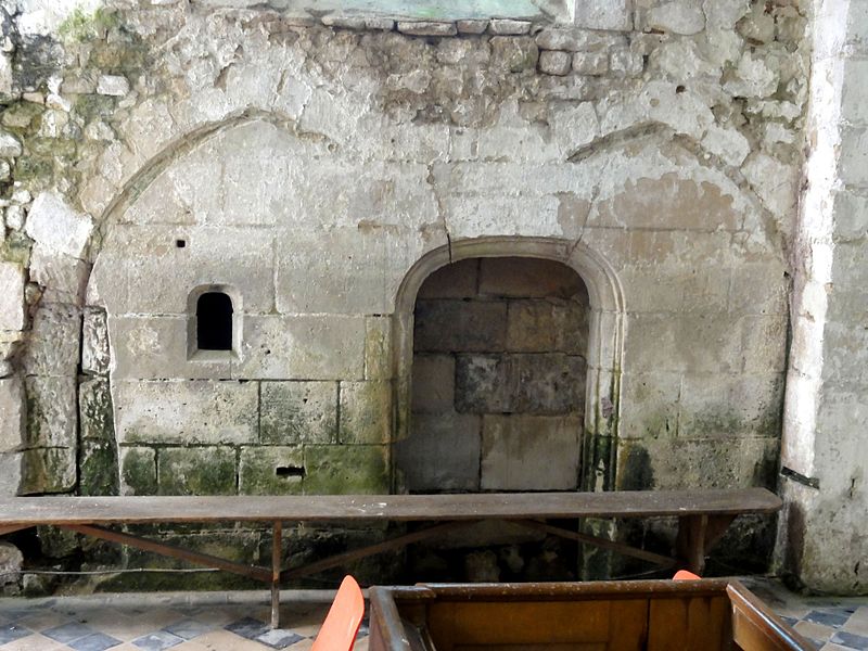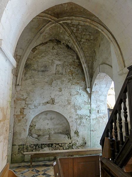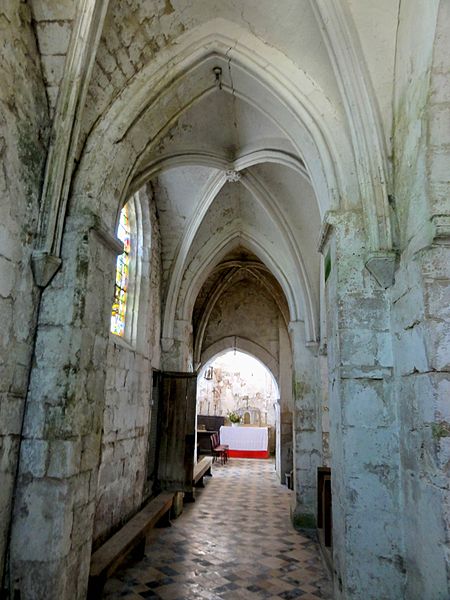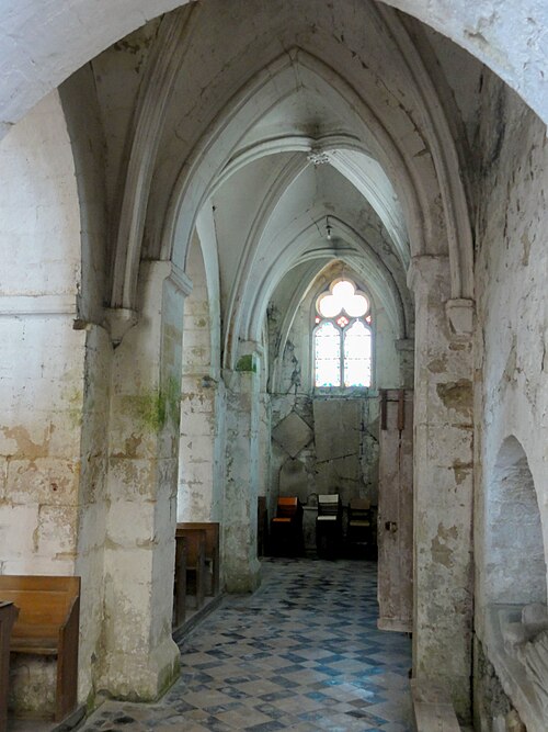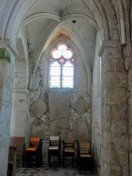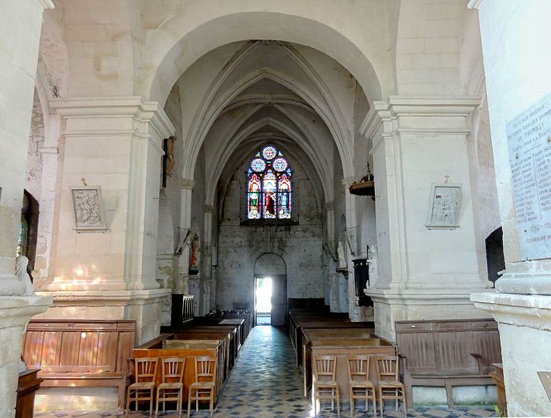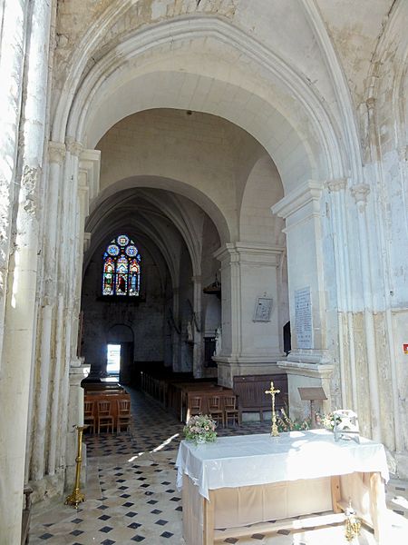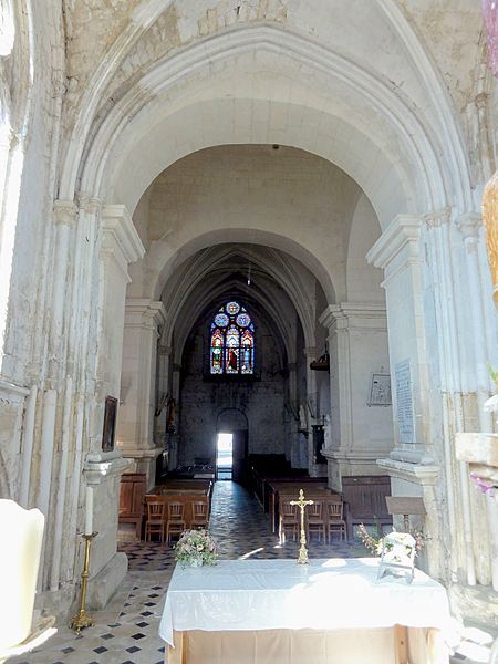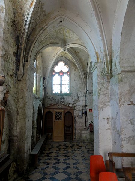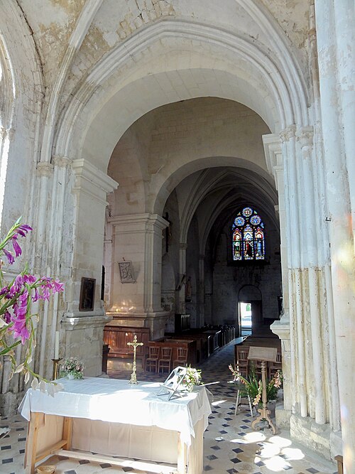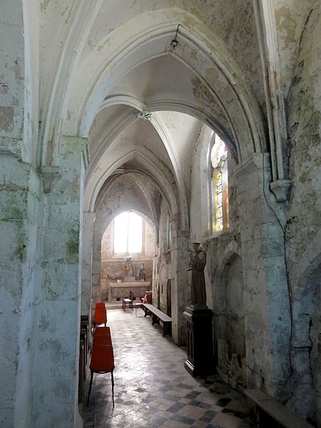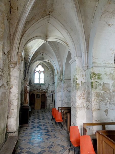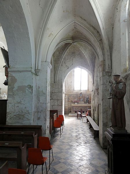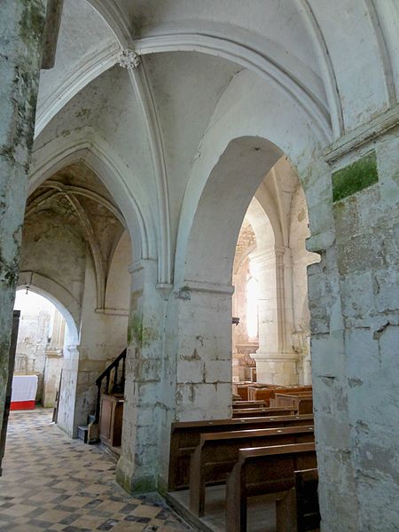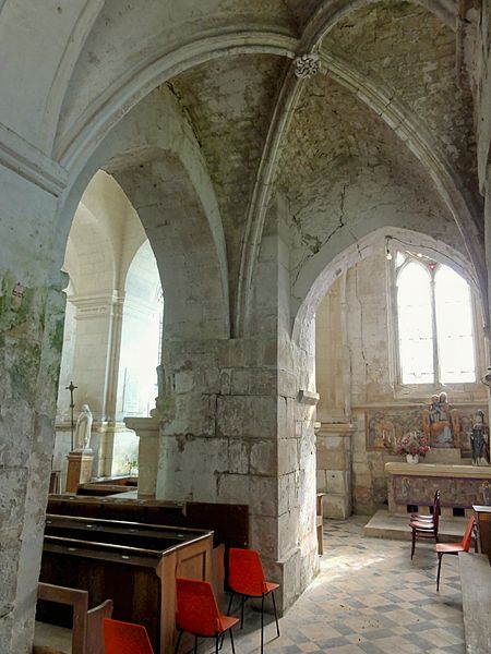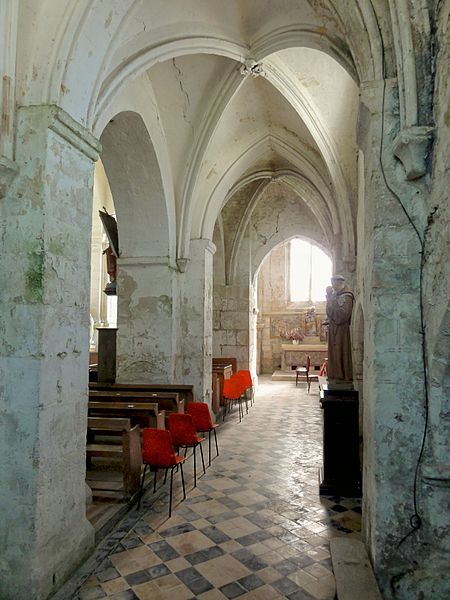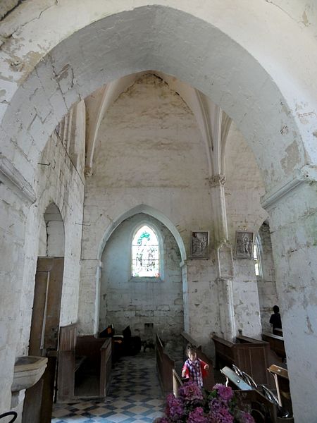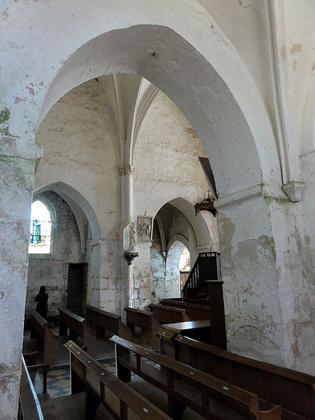 À l'intérieur, la nef n'a pas de fenêtres hautes et reçoit sa lumière de façon indirecte par les bas‑côtés et les parties orientales, ce qui la rend plutôt sombre malgré les murs blanchis. Les voûtes d'ogives de la nef sont dépourvues de formerets et s'appuient sur des faisceaux de trois colonnettes ; les clés de voûte portent des motifs végétaux et une tête couronnée. À mi‑hauteur des piles, des édicules à trois faces ornées d'arcatures trilobées, marqués de traces de polychromie, ont pu servir de supports sculptés pour des figures sacrées. Les bas‑côtés, mieux éclairés, présentent des voûtes elles aussi sans formerets, des doubleaux indépendants reposant sur pilastres et, côté sud, une série d'arcatures aveugles et un réduit seigneurial postérieur à la construction, ainsi qu'un enfeu avec gisant dans le bas‑côté nord ; la plupart des vitraux datent du XIXe siècle.