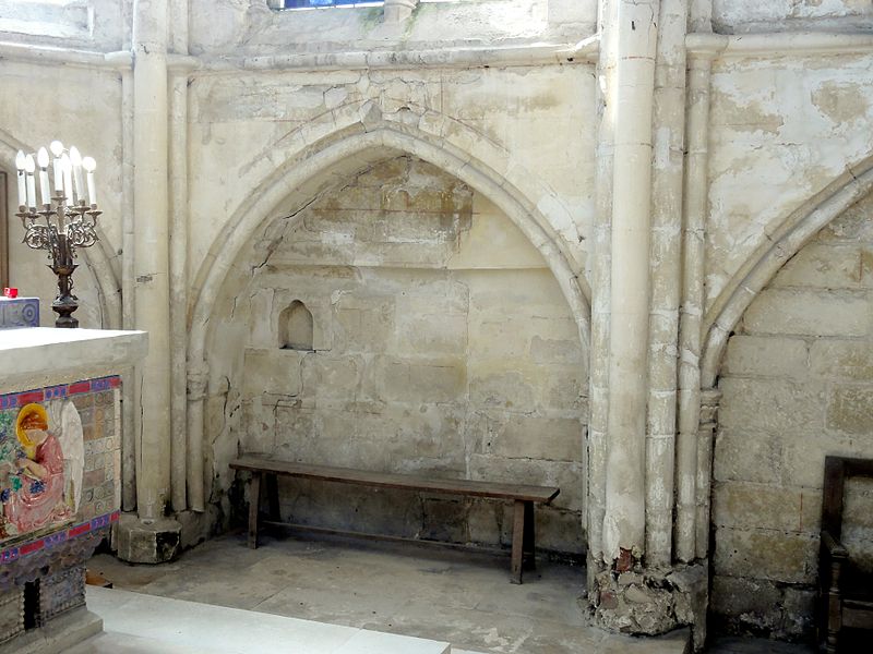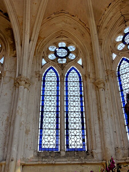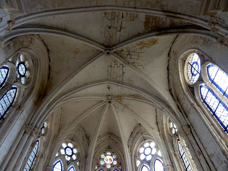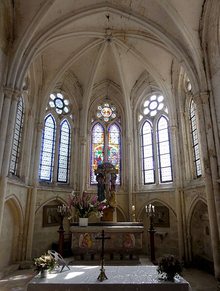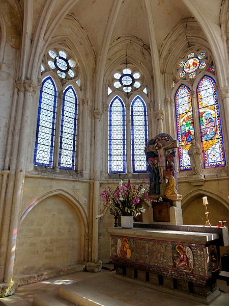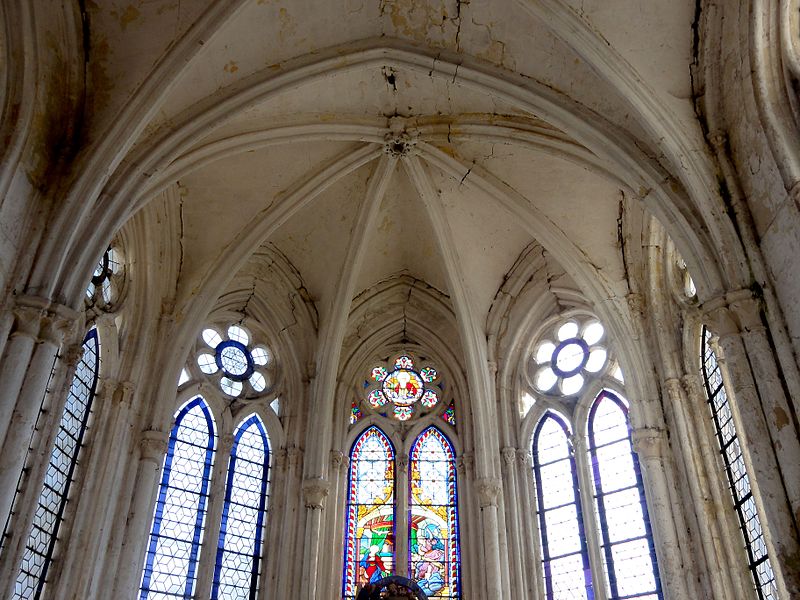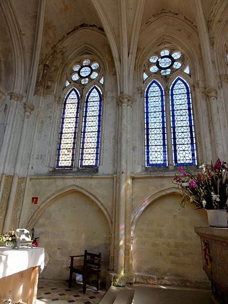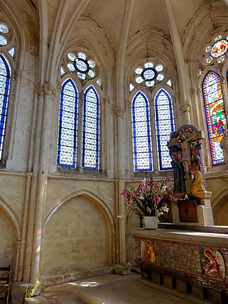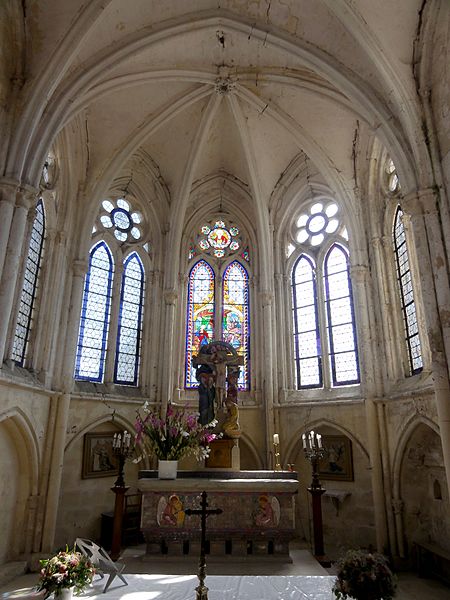 Le chœur, éclairé par sept fenêtres, forme une « cage de verre » caractéristique du meilleur art rayonnant : colonnettes fines, formerets présents, remplage délicat et une voûte aux profils aigus dont la datation a fait l'objet d'analyses divergentes mais qui est généralement placée dans la période 1230/1240. Quelques chapiteaux présentent des particularités de feuillage partiellement enveloppant qui ne se retrouvent guère ailleurs en Île‑de‑France.