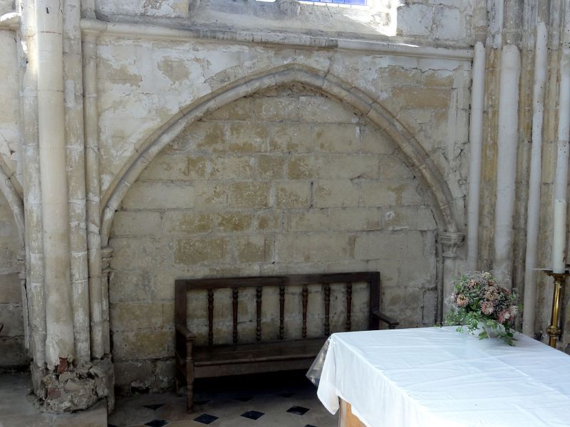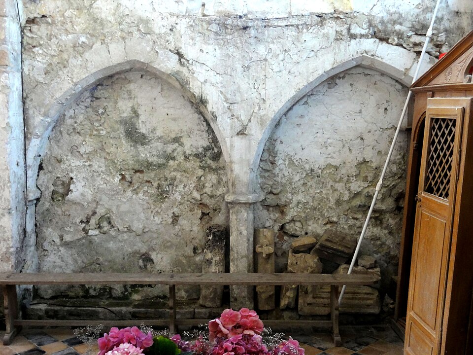 La croisée du transept, de style classique, contraste avec l'ensemble gothique : de grosses piles traitées en pilastres portent la date 1789 et supportent des arcades en cintre surbaissé et une voûte d'arêtes non nervurée, donnant une impression de lourdeur en regard de la finesse des parties gothiques. Les bras du transept offrent des arcatures romanes et gothiques, des chapiteaux sculptés et des vestiges de peintures murales relatant des épisodes de la Passion ; une piscine subsiste dans le mur sud.