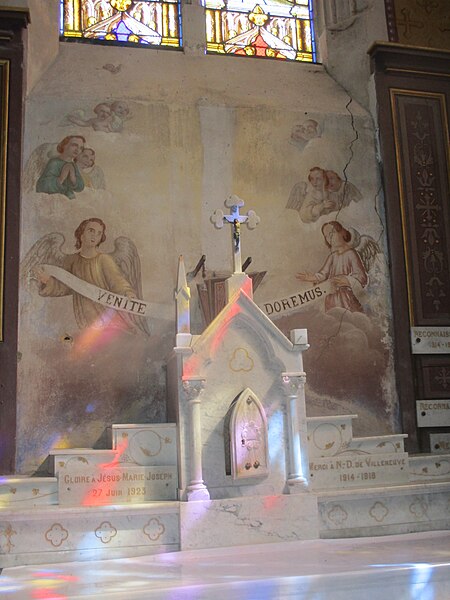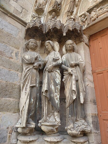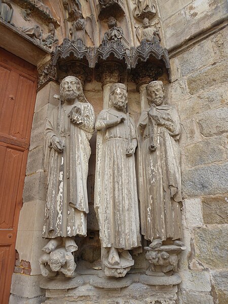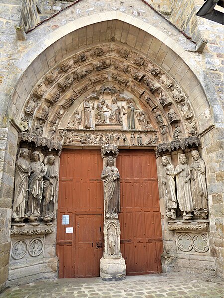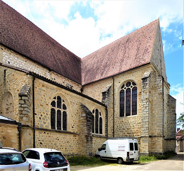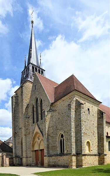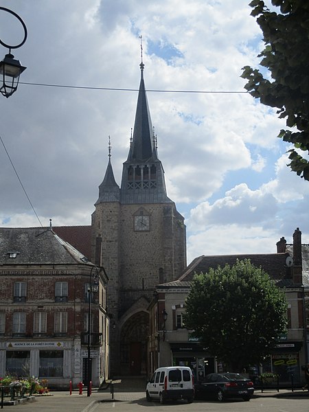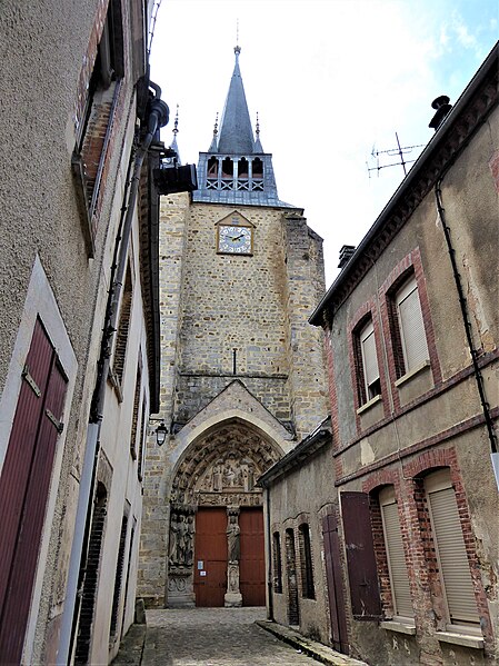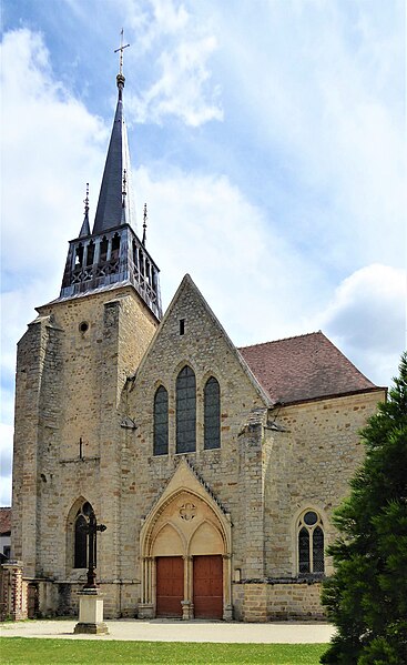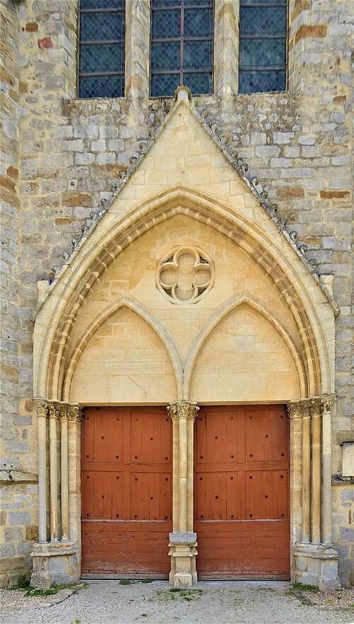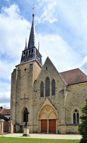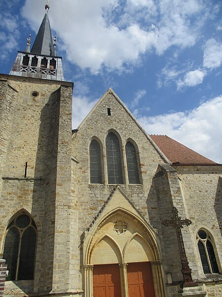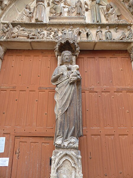L'église Notre-Dame de Villeneuve-l'Archevêque est située à Villeneuve-l'Archevêque, dans le département de l'Yonne, et dépend de l'archidiocèse de Sens-Auxerre. Elle remonte au XIIe siècle, époque de la fondation du bourg par le comte de Champagne, et la seigneurie passa ensuite aux archevêques de Sens sous la suzeraineté des comtes de Champagne. L'édifice a été largement remanié au XIIIe siècle, qui a doté la nef d'un caractère gothique, puis au XVIe siècle, avec la reconstruction du transept et du chœur entre 1530 et 1540. Le portail nord constitue un exemple exceptionnel de statuaire gothique du XIIIe siècle : trois arcades monumentales tréflées renferment chacune un personnage sculpté; on y voit, côté gauche, un ange souriant d'inspiration champenoise et, au centre, la Vierge de l'Annonciation. Le tympan et la frise du linteau racontent l'histoire de la Vierge, tandis que les voussures présentent des personnages de l'Ancien Testament en triple cordon, certains gardant des traces de peinture. Le couronnement de la Vierge occupe le tympan et le pilier central soutient la Vierge à l'Enfant, dont l'Enfant fut décapité pendant la Révolution. Les médaillons représentent les péchés capitaux et dix culots sculptés en feuilles de vigne montrent des dragons dévorant des raisins; parmi les figures figurent un Christ au roseau, un Père de l'Église et une scène de l'éducation de Marie. La tour-clocher, côté nord, est coiffée d'ardoises et surmontée d'une flèche de bronze doré d'époque Renaissance, entourée de quatre clochetons. L'édifice a été classé au titre des monuments historiques en 1886.