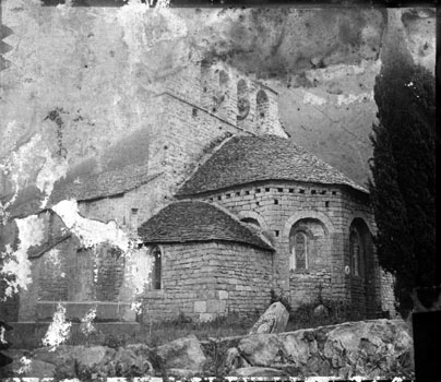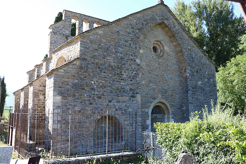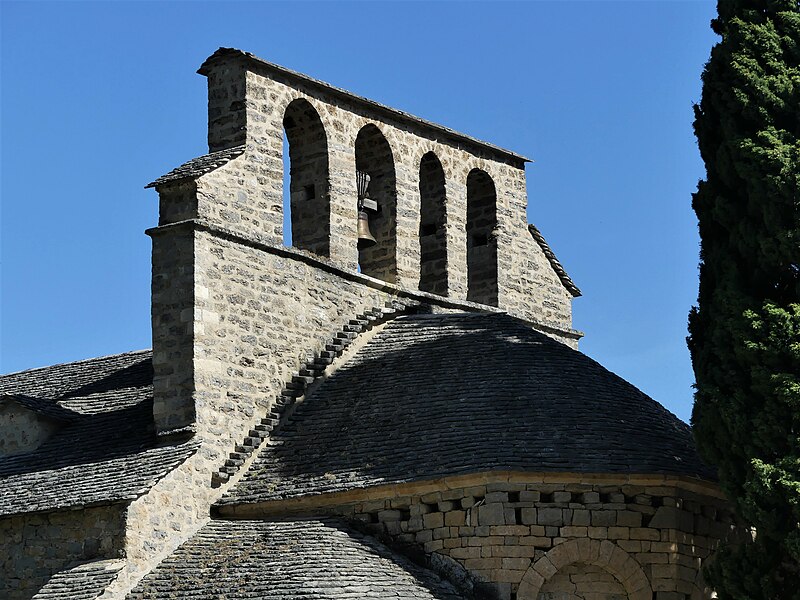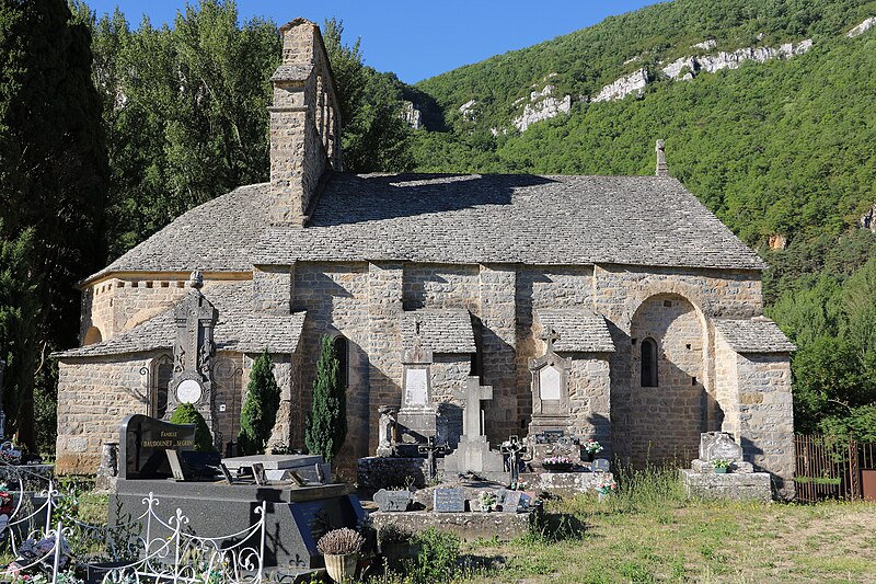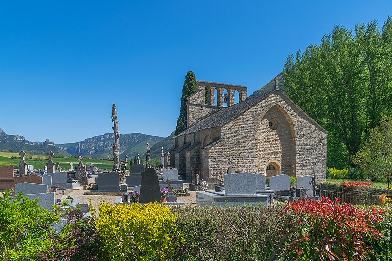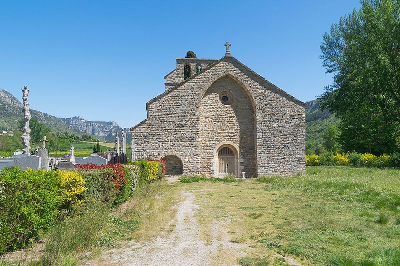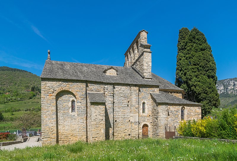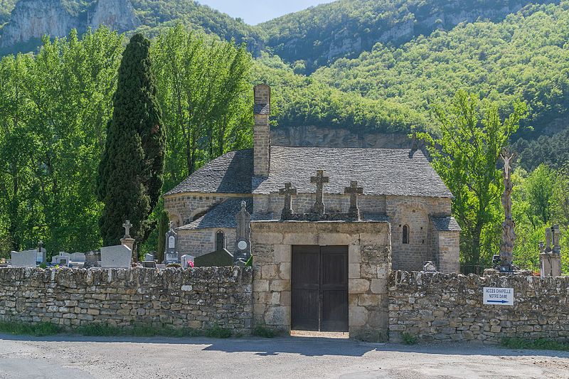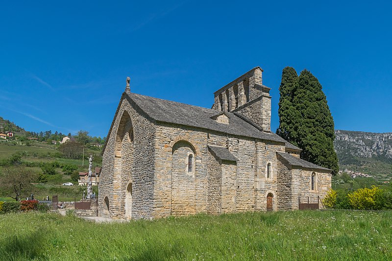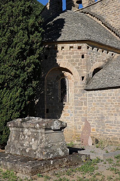 L'église Notre-Dame-des-Champs, à Mostuéjouls (Aveyron), présente une nef flanquée de bas-côtés soutenue par quatre gros piliers circulaires. La nef est couverte d'un berceau continu, contrebuté par les berceaux perpendiculaires des travées des collatéraux. À l'extérieur, on distingue deux types de contreforts : ceux correspondant aux doubleaux, manifestement ajoutés, et des contreforts peu saillants destinés à recevoir la retombée des arcs extérieurs, disposition fréquente au XIIe siècle. Le chœur se termine par un mur à trois pans; ses murs latéraux ont été percés au XVe siècle pour ouvrir deux chapelles funéraires. L'édifice est classé au titre des monuments historiques en 1930. Le portail, le clocher‑peigne et l'accès au cimetière attenant figurent parmi les éléments notables du site.