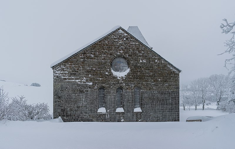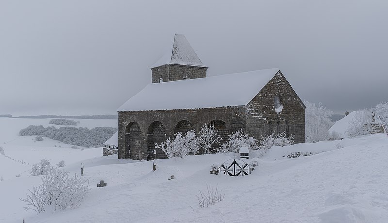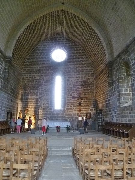L’église Notre-Dame-des-Pauvres, située au village d’Aubrac (commune de Saint-Chély-d’Aubrac) dans l’Aveyron, est l’un des vestiges de l’ancien hôpital d’Aubrac, actif dès 1120, dont subsistent aussi la Tour des Anglais, une maison et quelques pans de murs. Édifiée en position périphérique du village à 1 310 mètres d’altitude, elle a fait l’objet d’un classement au titre des monuments historiques en 1925. L’édifice, d’aspect volontairement sobre, offre un plan simple en quadrilatère de 24 mètres sur 12 et ne comporte pas de transept. Sa nef unique, renforcée par des contreforts, est couverte d’une voûte en berceau brisé reposant sur des doubleaux à simple rouleau. Le chevet plat, particularité dans l’architecture de l’Aubrac, évoque des pratiques liturgiques liées à certains ordres religieux, notamment les chanoines réguliers. Le mur nord est aveugle pour des raisons climatiques; de modestes baies assurent toutefois un éclairage continu sur les autres côtés, dont deux triplets de lancettes surmontés d’un oculus disposés en vis‑à‑vis dans les pignons. À l’intérieur, les murs présentent des surfaces continues et sobres, rythmées par de courtes colonnettes à chapiteaux à feuilles lisses qui soutiennent les doubleaux.