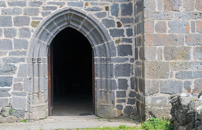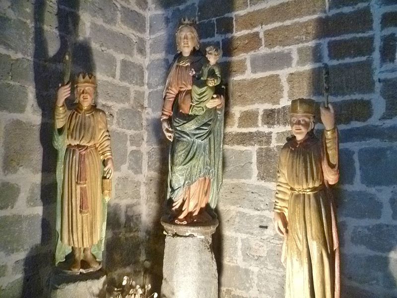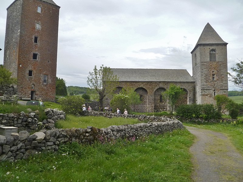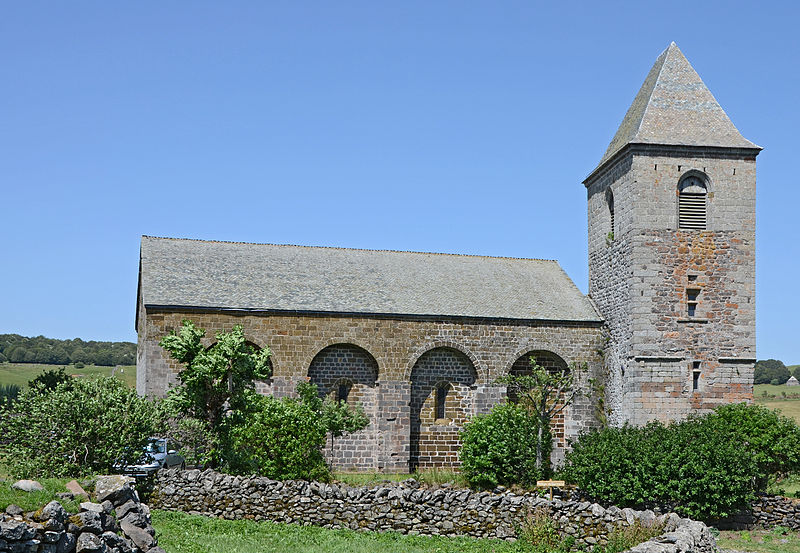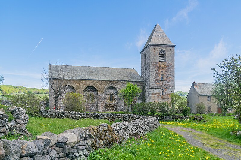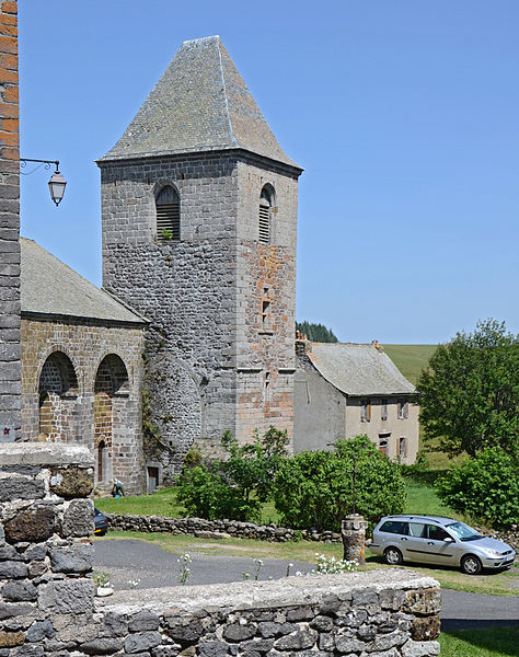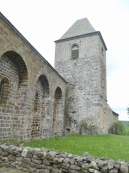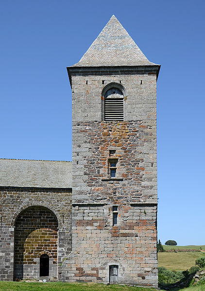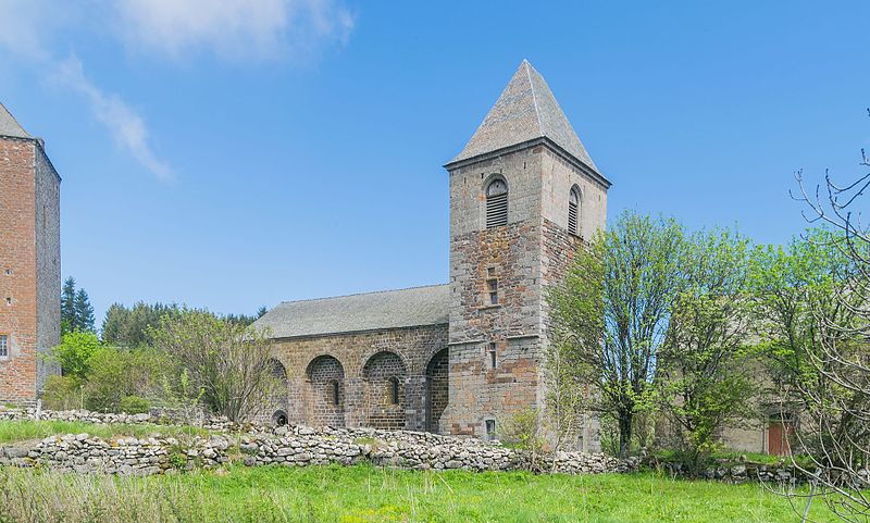 La chronologie précise de la construction reste discutée : l’édifice est généralement attribué au tournant des XIIe et XIIIe siècles, des auteurs proposant des dates de chantier différentes. Les premières mentions écrites explicites datent de 1216 et 1244. Au XIIIe siècle se manifestent l’aménagement d’un chœur, la mise en place d’autels et l’installation de stalles, tandis qu’au XIVe siècle des interventions modifient certaines élévations. L’église fut fortifiée à la fin du XIVe siècle pour se protéger des incursions liées à la guerre de Cent Ans. Le clocher, dont le rez‑de‑chaussée en granit est à peu près contemporain de l’église, présente ensuite un étage en lave noire attribué au XIVe siècle et un dernier niveau rattaché au XVIe siècle ; d’autres sources évoquent la construction du clocher visible aujourd’hui au milieu du XVe siècle. Le rez‑de‑chaussée du clocher, qui était traversé par le cloître, a accueilli des logements, un four à pain et la « cloche des perdus » portant une inscription latine.