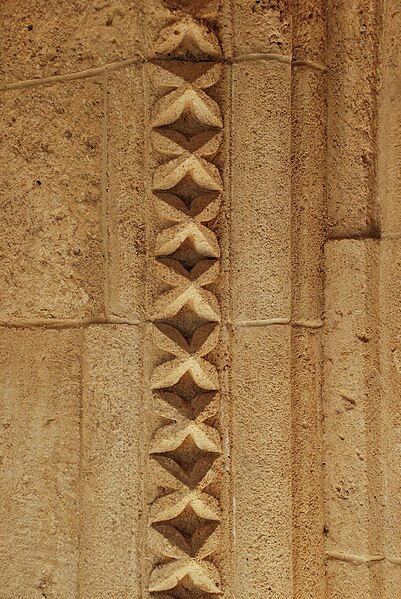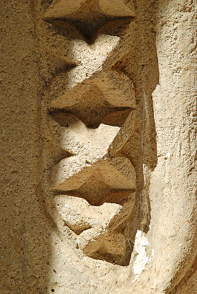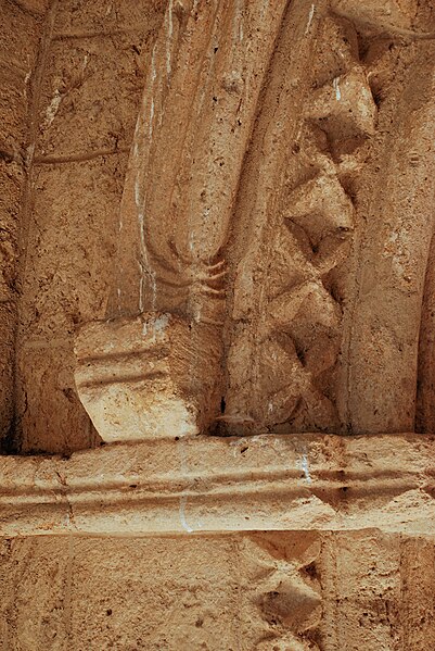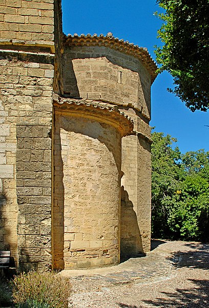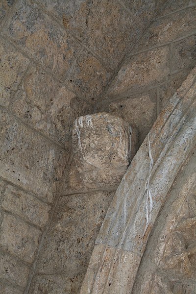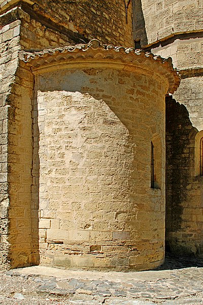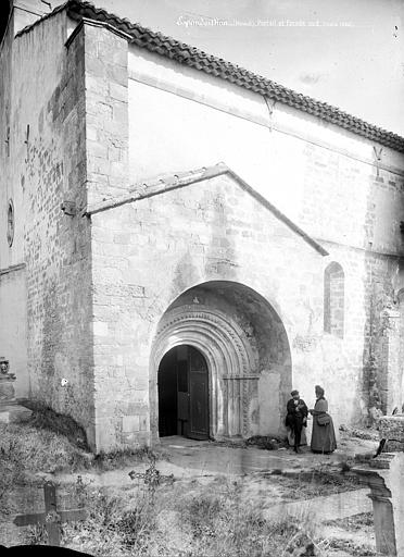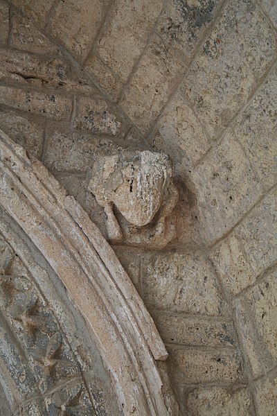Au sud, le portail en plein cintre, abrité sous un porche, est réalisé en pierre de taille en grand appareil ; il s'ouvre sur des piédroits moulurés supportant une archivolte à nombreuses voussures qui descend jusqu'au sol. Les piédroits et la voussure externe sont ornés de motifs en étoile et l'arc est flanqué de deux corbeaux sculptés. Le chevet comprend une abside pentagonale percée de trois baies cintrées au rez-de-chaussée et deux absidioles semi-circulaires ; l'étage fortifié ajouté au XIVe siècle est séparé du niveau inférieur par un cordon de pierre et percé de meurtrières.