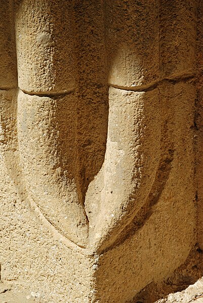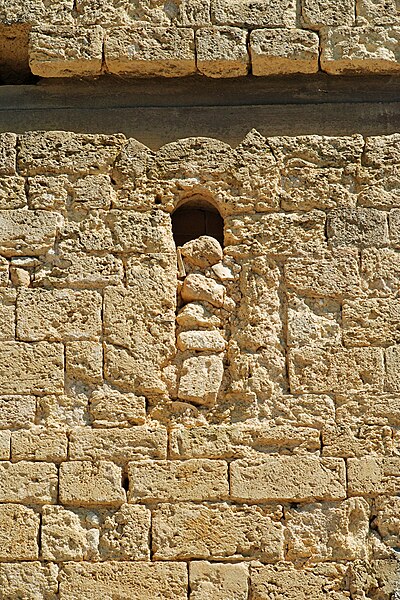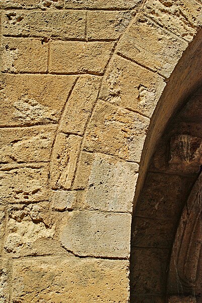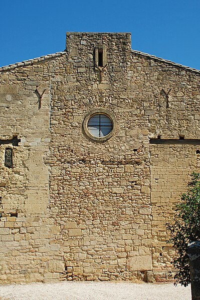 Pendant la guerre de Cent Ans, au XIVe siècle, l'édifice fut renforcé pour servir de refuge par l'ajout d'un étage fortifié et d'un parapet défensif. À l'ouest, la façade, plus large que haute, présente un aspect austère et une maçonnerie hétérogène mêlant pierre de taille et moellons ; elle est percée à mi-hauteur de deux fines baies cintrées murées et d'un oculus ajouté en 1852, et comporte dans sa partie haute deux ouvertures en forme de meurtrière ; trois grandes ancres marquent le sommet de la façade.