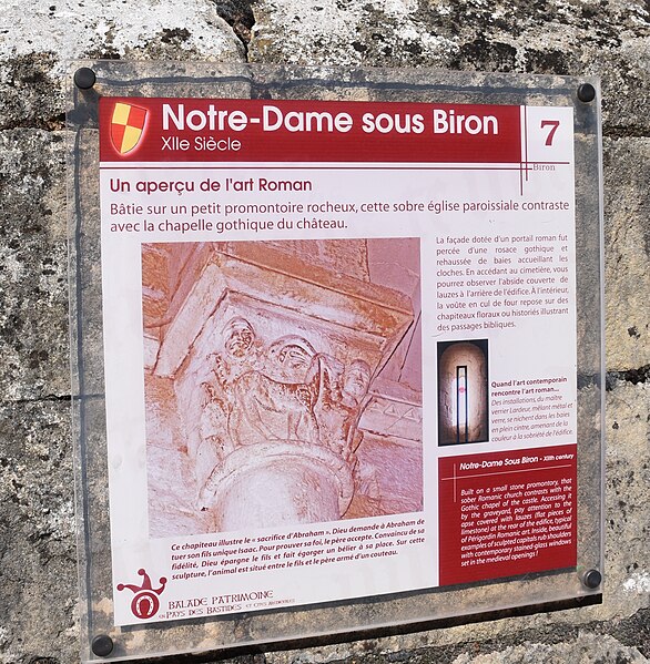 L'église Notre-Dame-de-Bourg de Biron, en Dordogne, est une église paroissiale datée des XIIe et XIIIe siècles et classée au titre des monuments historiques en 1961. Elle est dédiée à Notre-Dame de l'Assomption et a été édifiée sur l'emplacement d'une ancienne église prieurale dédiée à saint Michel, qui dépendait de l'abbaye de Sarlat. L'édifice suit un plan en croix avec une abside en hémicycle ; la nef, de plan carré, est voûtée en berceau brisé et le chœur en cul-de-four. La croisée du transept présente une voûte ogivale qui a probablement remplacé une coupole. Le porche roman, en saillie, est orné de trois archivoltes mises en valeur par des boudins ; les chapiteaux sont sculptés de feuilles, de personnages et d'animaux. La façade occidentale, remaniée au XVIe siècle, comporte un portail en plein cintre à trois voussures surmonté d'une rose et se termine par un clocher-mur percé de trois ouvertures. Un clocher primitif semble avoir dû couronner la croisée du transept ; une tourelle en encorbellement, accessible par une haute échelle, donne accès au clocher-mur et à son pignon triangulaire. Le presbytère, aujourd'hui ruiné et autrefois accolé à l'église, paraît dater du XVe siècle.