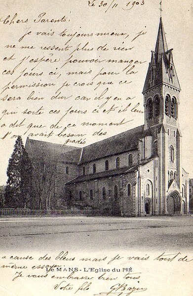 L'église Notre-Dame-du-Pré est un édifice catholique situé au Mans, dans la Sarthe, sur la rive droite de la Sarthe, au cœur du quartier du Pré. À l'origine un monastère établi au VIe siècle, l'église actuelle fut commencée aux XIe–XIIe siècles et élevée sur les restes d'un ancien oratoire que la tradition attribue à saint Julien. Ses dimensions sont de 58 mètres sur 10 mètres, ce qui en faisait alors le troisième édifice de la ville après la cathédrale et la Couture, bien qu'elle se trouvât hors des murs, dans un faubourg. Elle était l'église abbatiale de l'abbaye Saint-Julien-du-Pré, qui accueillait des religieuses bénédictines. La nef présente une alternance de piliers ronds et carrés ornés de chapiteaux romans. Le chœur, légèrement incliné vers la droite et surélevé d'environ un mètre, est bâti au‑dessus de la crypte de l'ancien monastère et s'ouvre sur un déambulatoire desservant trois chapelles absidiales. À la même époque furent construits le croisillon nord et la première travée du croisillon sud, chacun pourvu d'une absidiole, ainsi que la première travée de la nef. Les travaux se poursuivirent au début du XIIe siècle et l'abbatiale fut alors achevée, conférant au monument une grande homogénéité et un caractère essentiellement roman. Les voûtes de pierre, ajoutées au XVe siècle, modifièrent le profil intérieur de l'édifice; divers travaux et restaurations eurent lieu aux siècles suivants, dont une restauration générale au XIXe siècle qui se conclut par l'ajout d'un vaste clocher en forme de porche à l'avant de la façade. Le chœur présente une structure comparable à celle de l'église de la Couture, avec des arcs en plein cintre très surhaussés et une alternance de supports. Dans le déambulatoire, de grandes fenêtres légèrement ébrasées, encadrées de colonnettes élancées, apportent de la lumière aux chapelles; celles-ci, traitées de façon archaïque, sont voûtées en cul-de-four et dépourvues de contreforts extérieurs et de colonnes. La crypte a livré les reliques de saint Julien, transférées à la cathédrale en 1835. En 1950, Max Ingrand a réalisé un chemin de croix et des vitraux pour l'église. L'édifice fait l'objet d'un classement au titre des monuments historiques depuis la liste de 1840. L'église comporte, entre autres éléments, une nef, un chœur, la crypte du tombeau de saint Julien, une statue de saint Michel archange à l'entrée, un christ en croix et des vitraux, et elle est illustrée par des vues historiques, notamment une photographie de 1881. Parmi les abbesses, Catherine‑Marie d'Aumont est attestée (décédée en 1708). Marie‑Louise de Laval‑Montmorency (1723‑1794) quitta l'abbaye du Pré pour devenir abbesse de l'abbaye de Montmartre. Une étude d'André Mussat est consacrée à l'église Notre‑Dame‑du‑Pré.