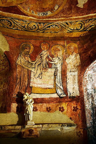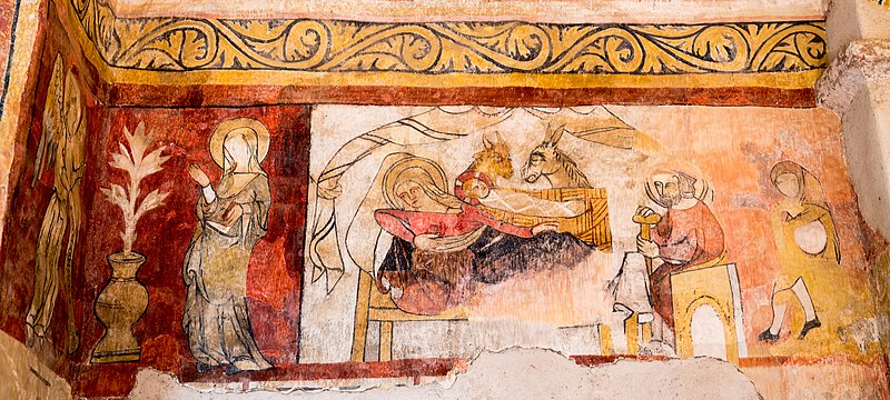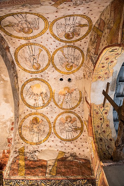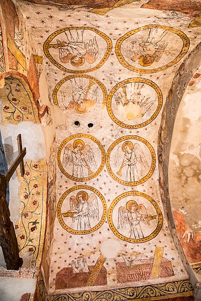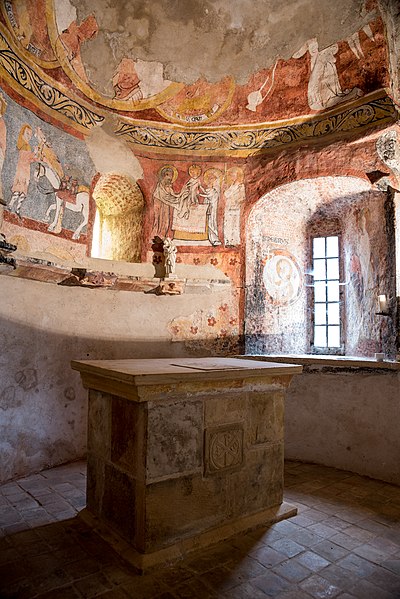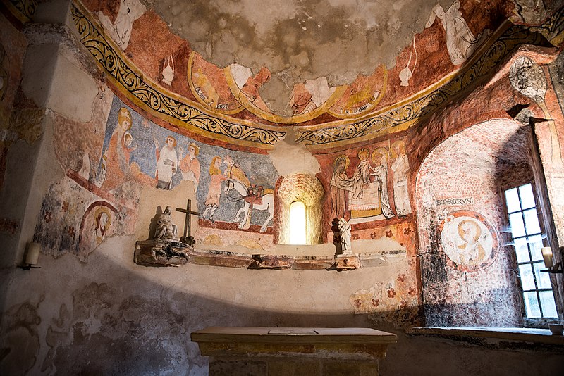 Lors de la rénovation de 1979, des peintures murales ont été mises au jour et restaurées entre 1980 et 1982 ; leur datation reste incertaine, on les suppose de la fin du XIIIe ou du début du XIVe siècle. Les cycles iconographiques représentent l'enfance du Christ, le jugement dernier et des têtes d'apôtres peintes dans des médaillons. Dans l'abside, le Christ était figuré entouré des quatre symboles des évangélistes, mais il ne subsiste aujourd'hui que la partie inférieure de cette composition. Dans le chœur et l'abside, les scènes de l'enfance du Christ se succèdent de gauche à droite : l'Annonciation, la Nativité, l'Adoration des bergers, l'Adoration des Mages, la toilette de l'enfant, le Massacre des Innocents, la Fuite en Égypte et des scènes de l'enfance. Le Jugement dernier est dominé par le Christ entouré de la Vierge et de saint Jean : sur la voûte, des anges sonnent de la trompette tandis que des morts sortent de leur tombeau. Sous les scènes de l'enfance, des médaillons présentent quelques apôtres ; seuls saint Luc, saint Paul et saint Jean l'Évangéliste sont encore reconnaissables. Autour du Christ dans l'abside, des médaillons figurent les évangélistes sous leur forme symbolique — saint Luc en taureau, saint Marc en lion, saint Matthieu en homme et saint Jean en aigle. Une litre funéraire peint en l'honneur de la famille Gaspard, bienfaitrice de la chapelle, atteste que certains membres de cette famille y ont été enterrés ; leur blason y est également représenté.