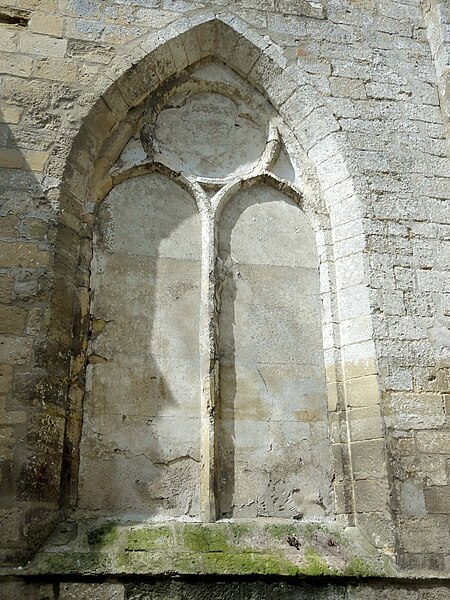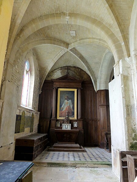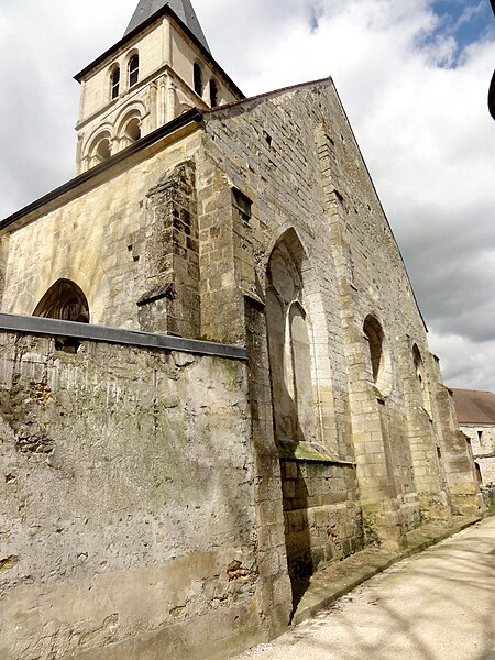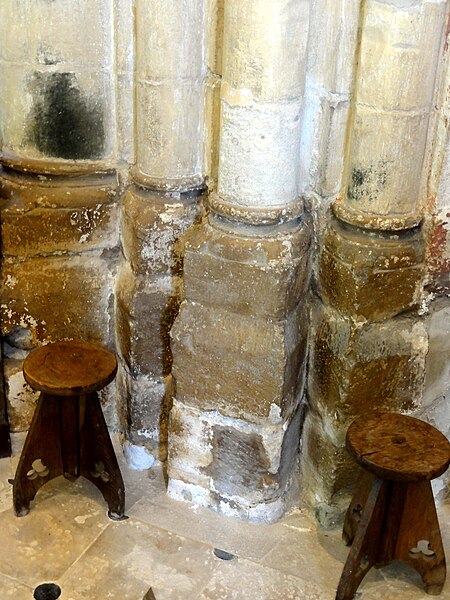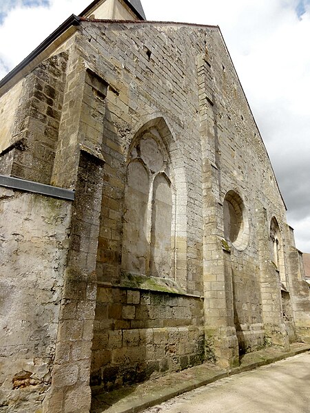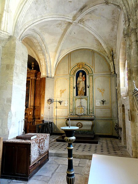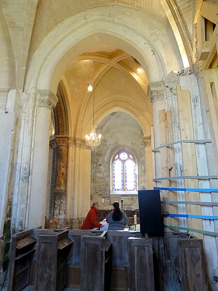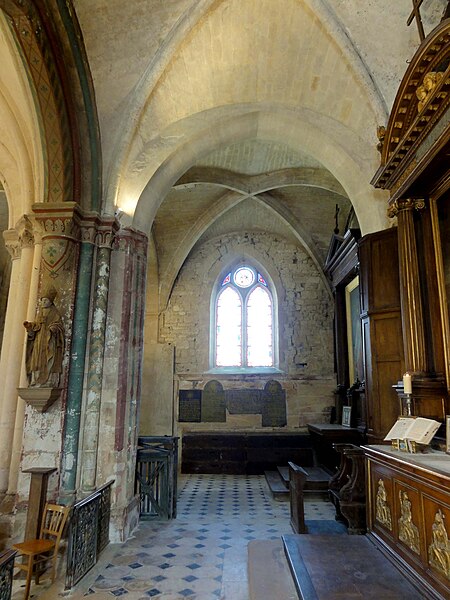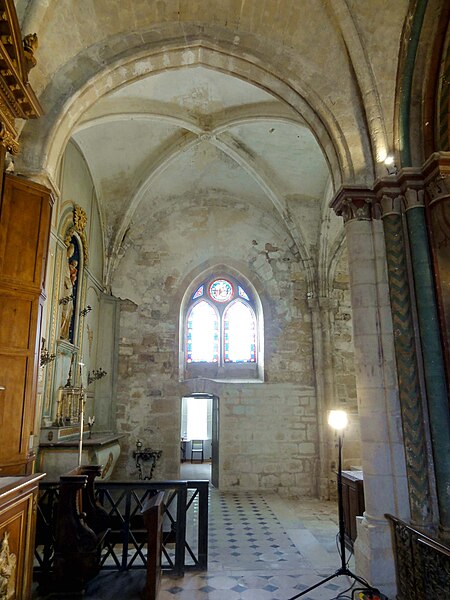 La base du clocher et le chœur forment un ensemble homogène, déliminé par quatre piles et des doubleaux en arc brisé à double rouleau ; colonnettes appareillées, chapiteaux sculptés de palmettes et d'acanthes et bases à tores et griffes composent cette architecture raffinée qui conserve des détails archaïques, notamment dans le profil des ogives et dans la faible élévation de la voûte du chœur. Les chapelles latérales, assimilées aux croisillons, présentent des fenêtres à deux lancettes surmontées d'un oculus au remplage de type rayonnant tardif et des voûtements divers résultant des campagnes successives de construction et de réparation ; la chapelle latérale nord présente au chevet une baie gothique flamboyante plus tardive.