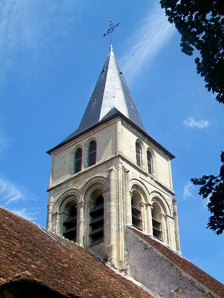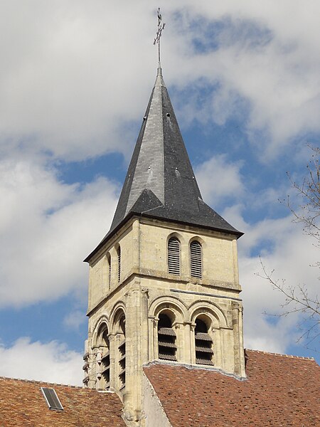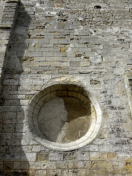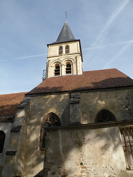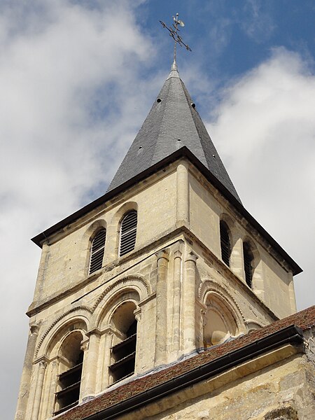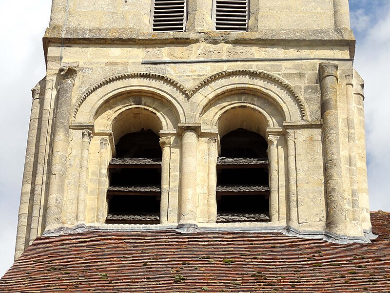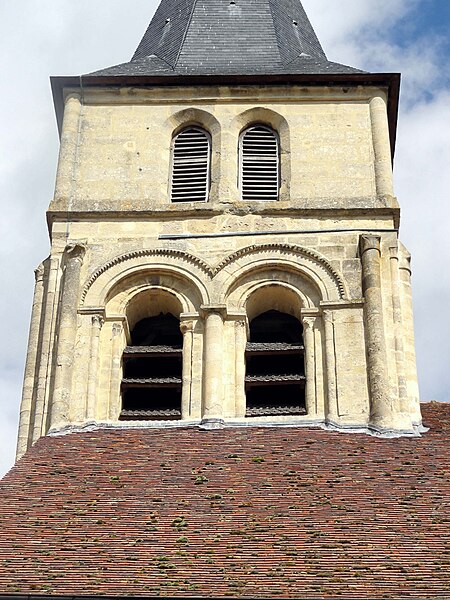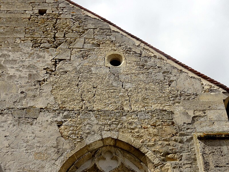 Extérieurement, la façade occidentale et les élévations des bas‑côtés ont été largement remaniées aux XIXe et XXe siècles et n'offrent guère d'éléments antérieurs significatifs ; elles associent moellons et pierre de taille, contreforts à ressauts et baies en plein cintre, tandis que le portail latéral nord relève d'une reprise néoromane. Le clocher, à trois étages intérieurs, présente en élévation des baies géminées, de nombreuses colonnettes d'angle et une corniche mutilée ; l'étage supérieur, moins élevé, a un caractère moins cohérent stylistiquement.