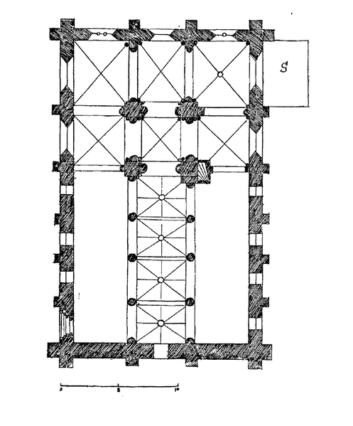 Le plan de l'édifice, légèrement dévié de 13° vers le sud, comprend une nef de quatre travées flanquée de deux bas‑côtés, la base du clocher correspondant à la croisée du transept, un chœur d'une travée à chevet plat et deux chapelles latérales qui englobent les anciens croisillons ; la longueur intérieure est d'environ 24,50 m pour une largeur d'environ 15 m. Excepté les bas‑côtés, l'ensemble de l'édifice est voûté d'ogives ; l'accès principal se fait par un portail latéral nord donnant sur la place Saint‑Lô, le portail occidental débouchant aujourd'hui sur une propriété privée.