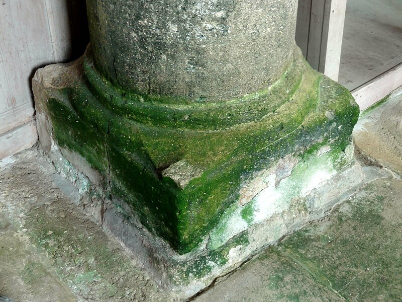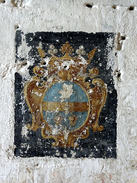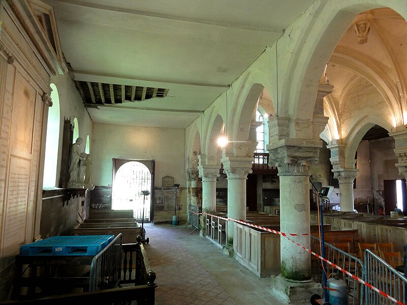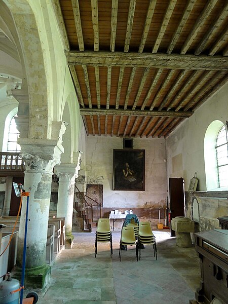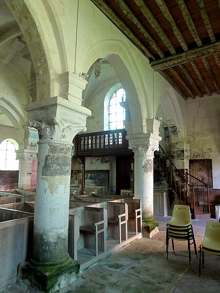 L'intérieur présente de grandes arcades du début du XIIIe siècle et des voûtes d'ogives du XVIe siècle qui ont profondément transformé l'aspect primitif de la nef ; les arcades, à double rouleau et simplement chanfreinées, retombent sur des chapiteaux sculptés de grandes feuilles et de motifs polylobés. Des traces de polychromie ancienne subsistent dans les ébrasements et sous des badigeons, et au‑dessus de l'arc triomphal se trouvent des peintures du XIIIe siècle représentant le Christ en gloire et les symboles du Tétramorphe, restaurées en 1999 et visibles depuis les combles. Les piliers monocylindriques portent des bases ornées et, au‑dessus des tailloirs du début du XIIIe siècle, des consoles de style Renaissance engagées soutiennent une corniche d'où retombent les nervures des voûtes ; plusieurs clés de voûte secondaires et centrales portent un décor héraldique et floral, certaines centrales exhibant les armes d'Achim d'Abos et d'autres écussons familiaux en hommage aux donateurs.