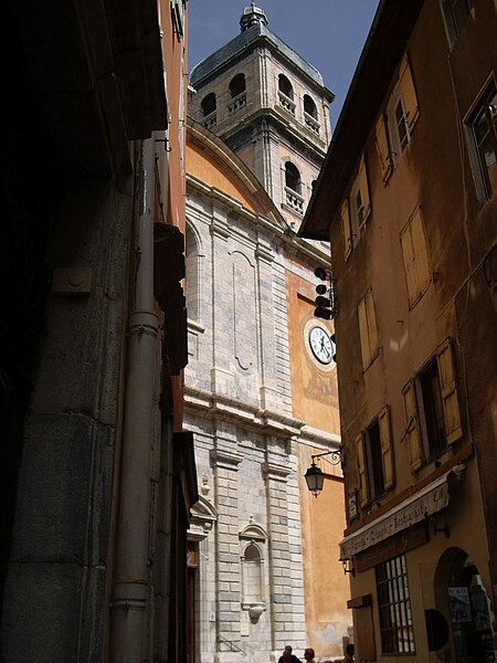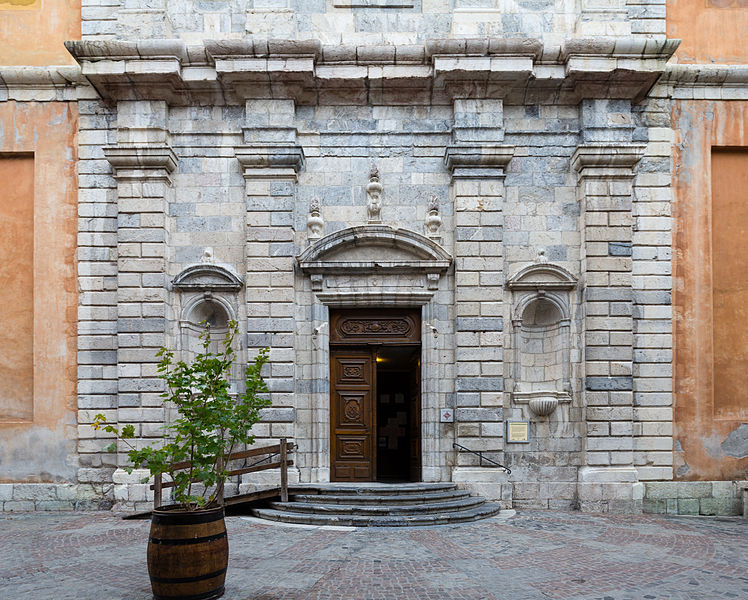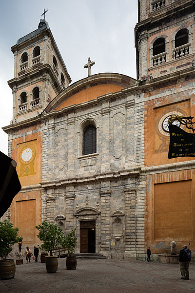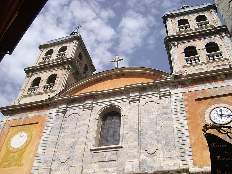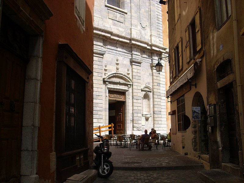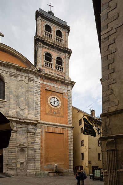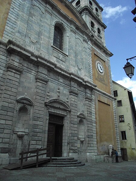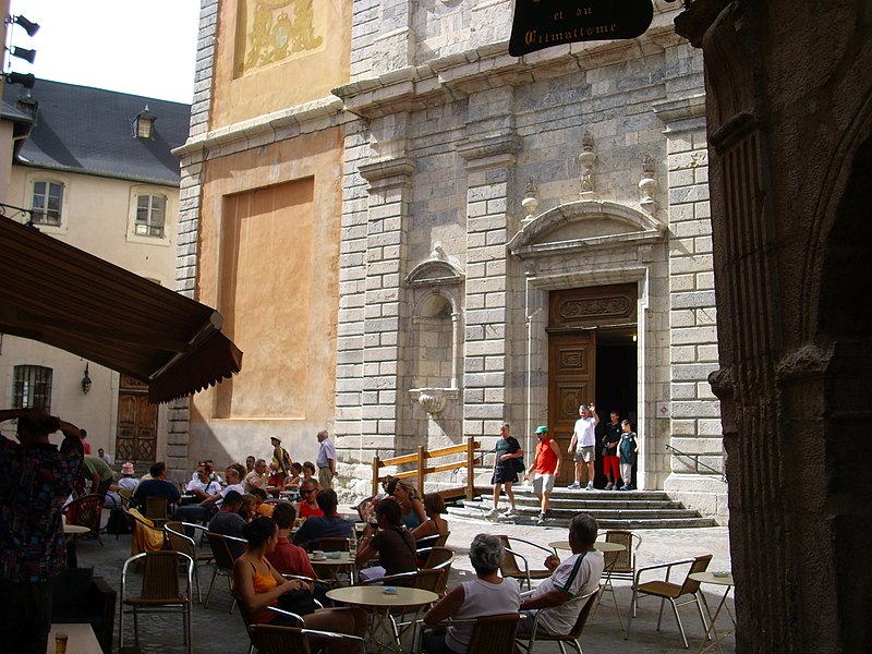 La façade haute, qui donne sur la place du Temple, s'organise autour d'une porte centrale flanquée de deux tours carrées coiffées d'un petit dôme et d'un lanternon ; chaque tour est ornée d'un cadran solaire, celui de gauche étant le plus ancien (1719) et réalisé dans le style baroque. À l'intérieur, la nef compte quatre travées avec bas‑côtés, un transept et une abside semi‑circulaire ; le décor et le mobilier sont riches et nombreux. On y remarque un tableau de saint Nicolas représentant Briançon en 1644 avec la flèche de l'ancienne église, un lutrin en bois sculpté du XVIIIe siècle par André Vincent, ainsi que, offert par Jean‑Antoine Morand de Jouffrey, un tableau de Mancini (1787) représentant saint Antoine guérissant les malades. L'autel de Notre‑Dame du Carmel porte un retable peint par Louis Court illustrant saint Simon Stock recevant le scapulaire, et ce même artiste est l'auteur de plusieurs autres œuvres dans l'église, dont des tableaux du début du XVIIIe siècle (dont une Assomption, un martyre de saint Sébastien en 1720 et une scène de Pentecôte pour l'autel du Saint‑Esprit). Le chœur conserve des stalles en bois sculpté réalisées en 1717 par Joubert et Faure ; Nicolas Chalvet a peint des toiles religieuses en 1716, notamment la manne dans le désert et le serpent d'airain. On trouve encore un tableau de saint Louis partant pour la croisade (1749) par S. Depape, un autel dédié à saint Victor, et les fonts baptismaux ornés d'un groupe sculpté représentant le baptême de Jésus, œuvre de Pierre Nicolle.